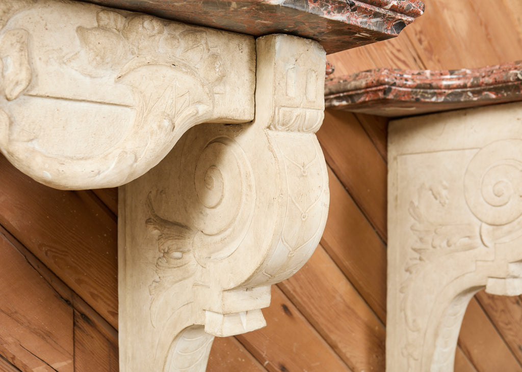 Pair of Dennis and Leen Hadrian Stone Marble Top Wall Consoles