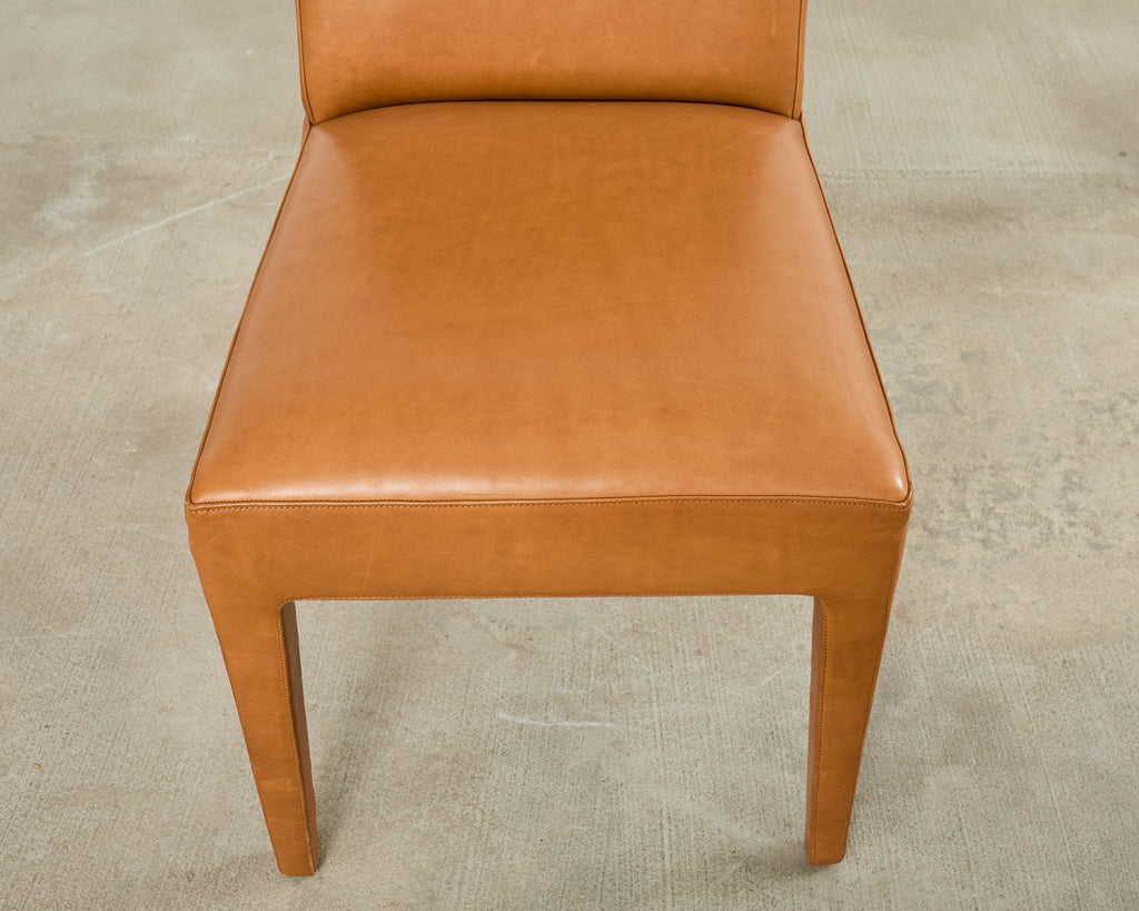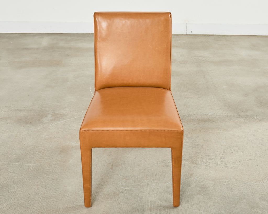 Equestrian inspired Dalton dining chair or side chair designed by Ralph Lauren. The Dalton chair features a bench made construction in Italy and finished in the U.S. by Theodore Alexander. The mahogany frame is upholstered with a cognac leather in the English saddlery aesthetic from aniline leather. The leather is soft and supple with top stitched seams. Sturdy and solid having excellent joinery and craftsmanship. The chair retains its makers tags from Theodore Alexander under the seat. Very comfortable the chair could serve as a desk chair or hall chair. Exceptional condition with a classic profile in the style of Jean-Michel Frank.