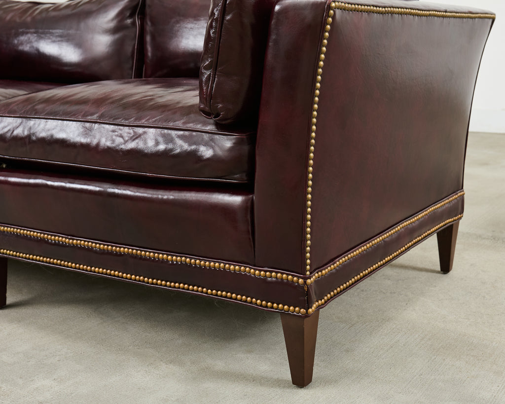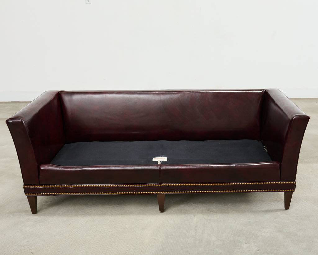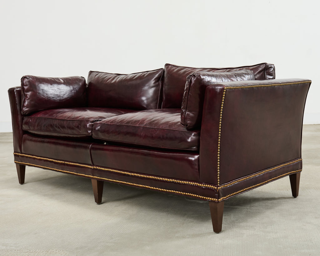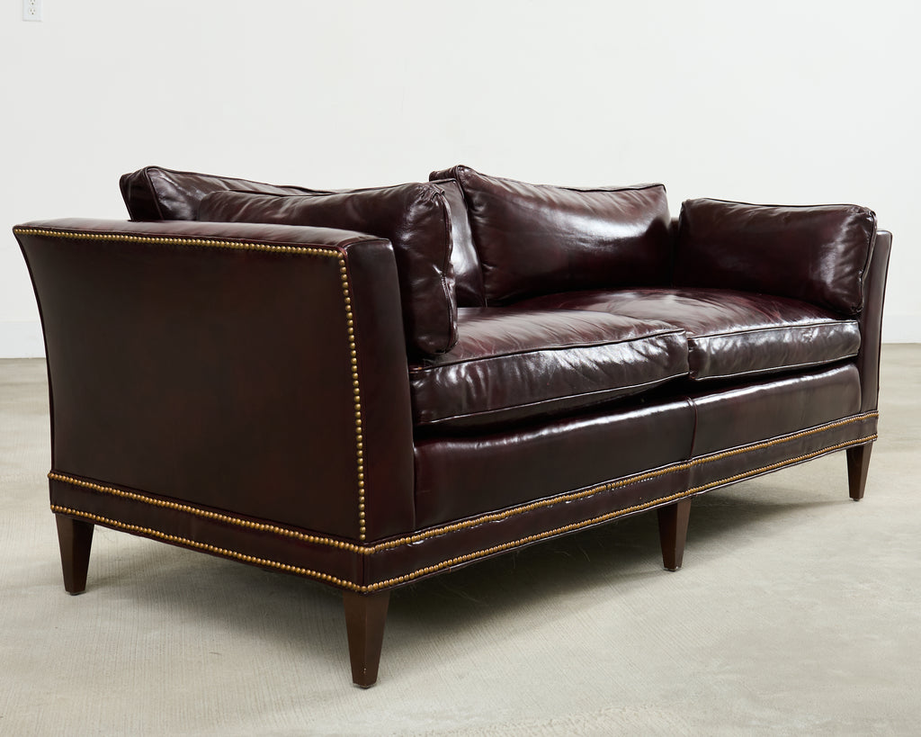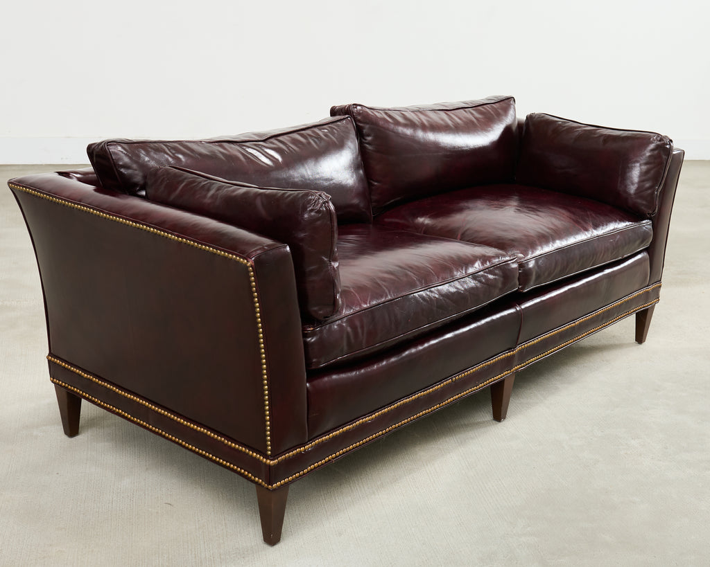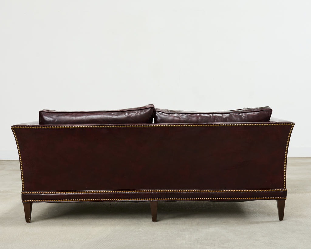 Opulent mid-century modern case sofa or tuxedo style sofa settee crafted in the English regency taste. The sofa features a dark hardwood frame covered with a dramatic waxed cordovan or oxblood leather upholstery. The arms of the sofa are slightly flared on each end with removable loose seat cushions for a plush, comfortable experience. The arms and trim are embellished with patinated brass tack accents to complete the lavish design. The sofa is supported by short, tapered, square legs. The sofa is heavy and sturdy with excellent joinery and craftsmanship. The leather is soft and supple, but firm enough to keep its shape. Very good, well preserved condition as seen in photos. The design is refined and sophisticated in an English gentlemen's club style with a distinctive profile.