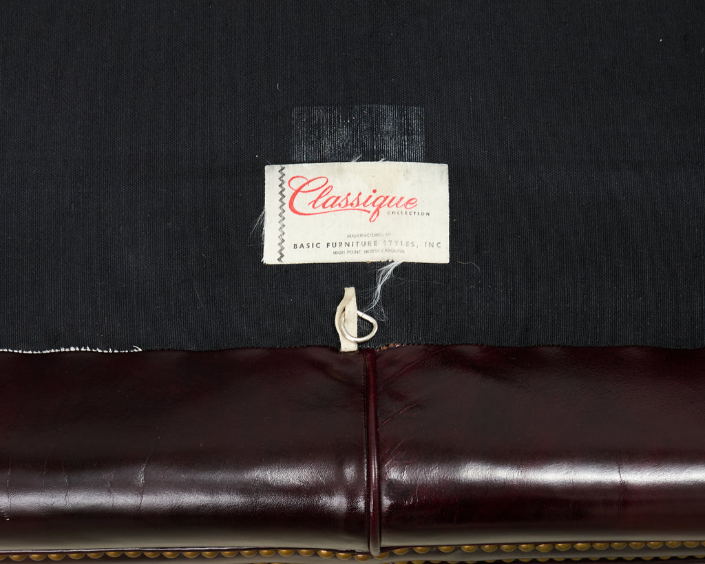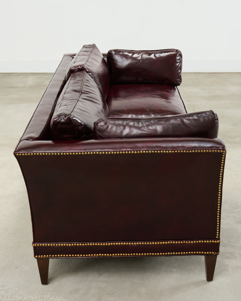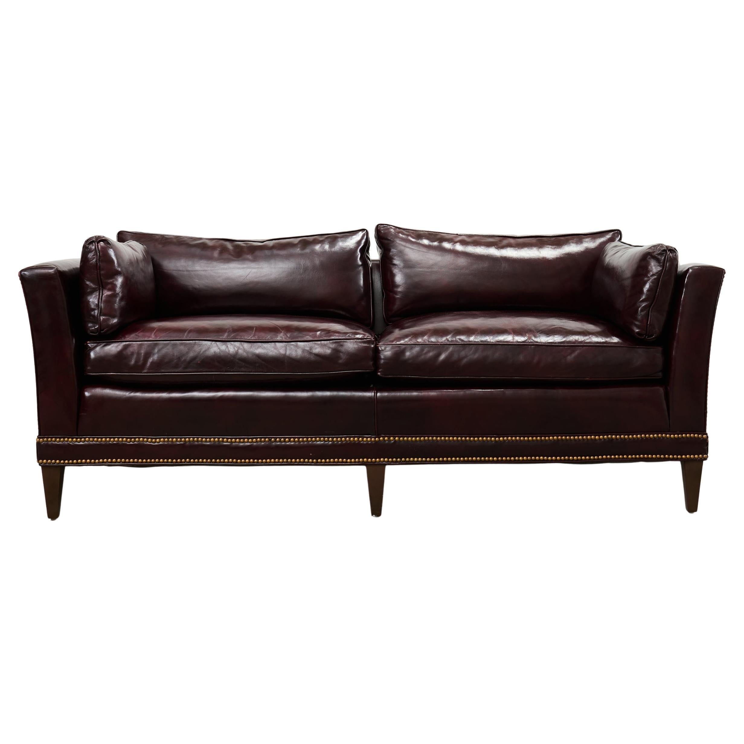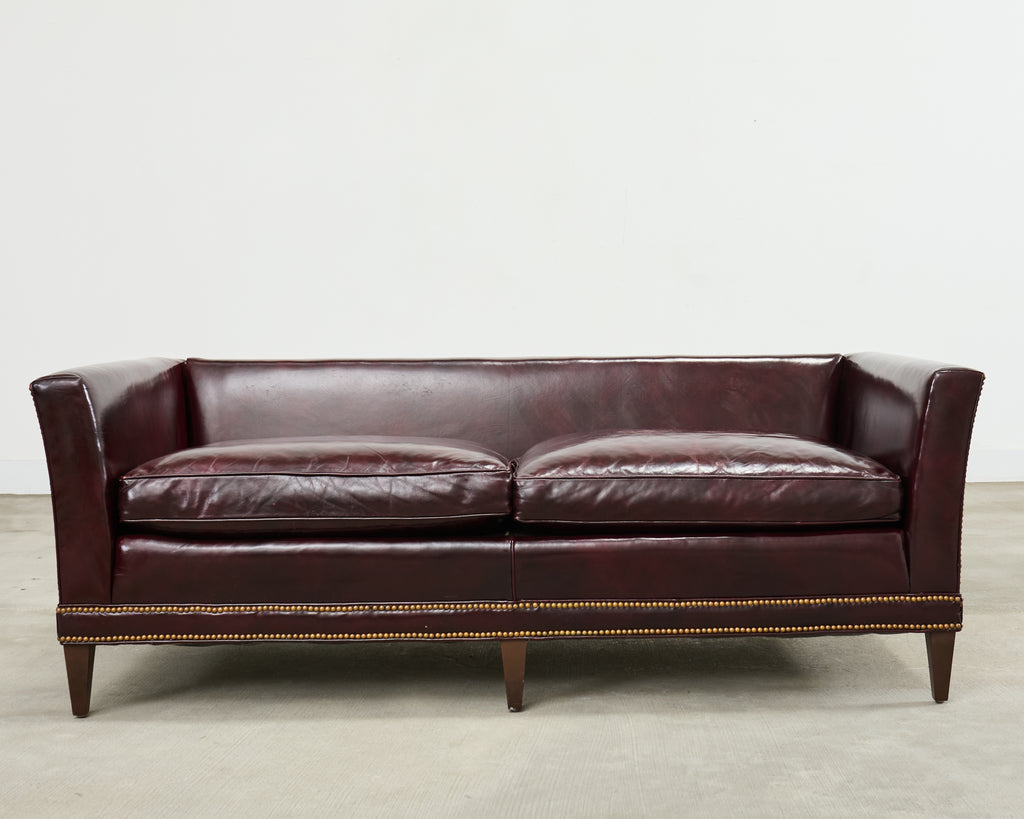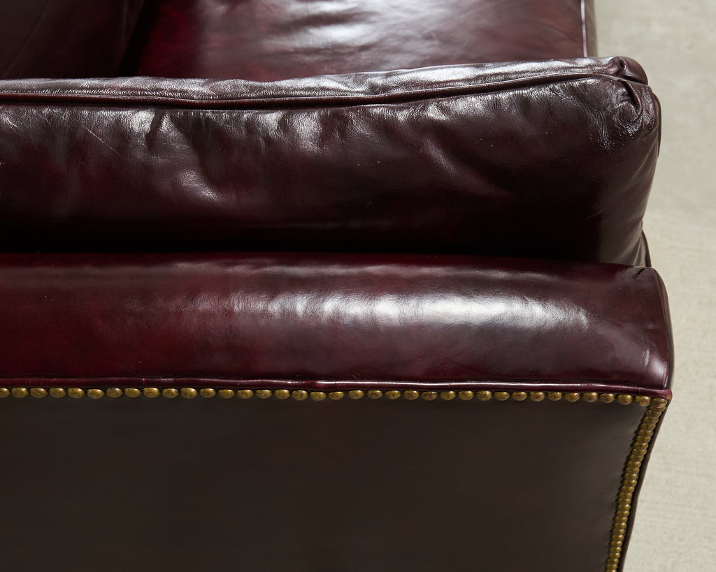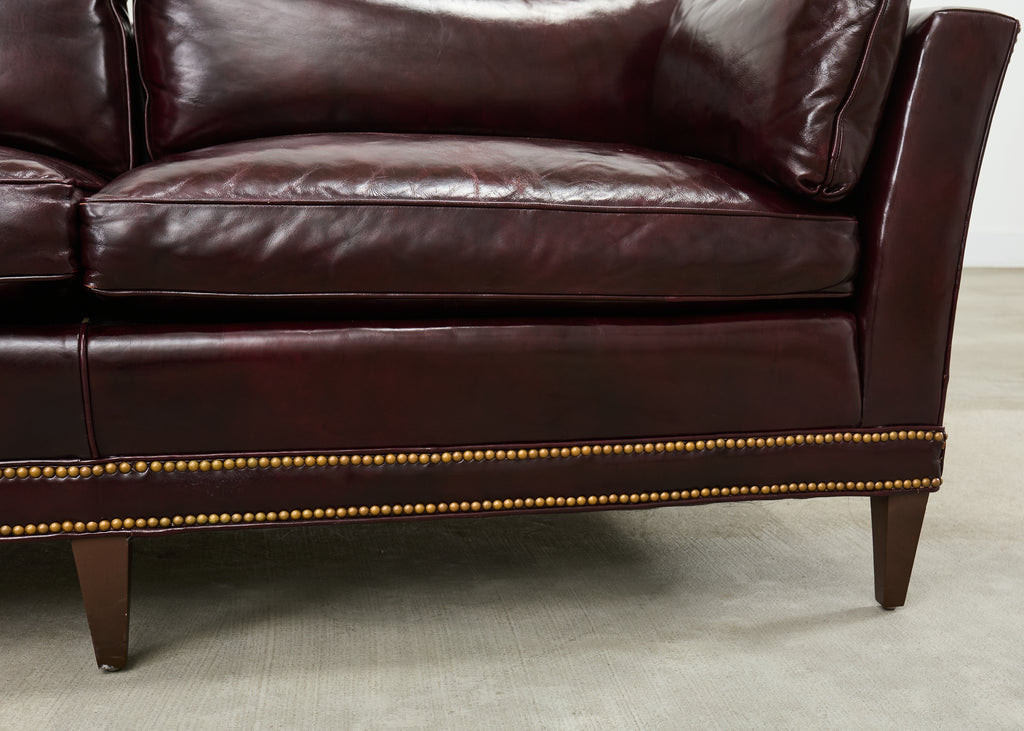 Opulent mid-century modern case sofa or tuxedo style sofa settee crafted in the English regency taste. The sofa features a dark hardwood frame covered with a dramatic waxed cordovan or oxblood leather upholstery. The arms of the sofa are slightly flared on each end with removable loose seat cushions for a plush, comfortable experience. The arms and trim are embellished with patinated brass tack accents to complete the lavish design. The sofa is supported by short, tapered, square legs. The sofa is heavy and sturdy with excellent joinery and craftsmanship. The leather is soft and supple, but firm enough to keep its shape. Very good, well preserved condition as seen in photos. The design is refined and sophisticated in an English gentlemen's club style with a distinctive profile.