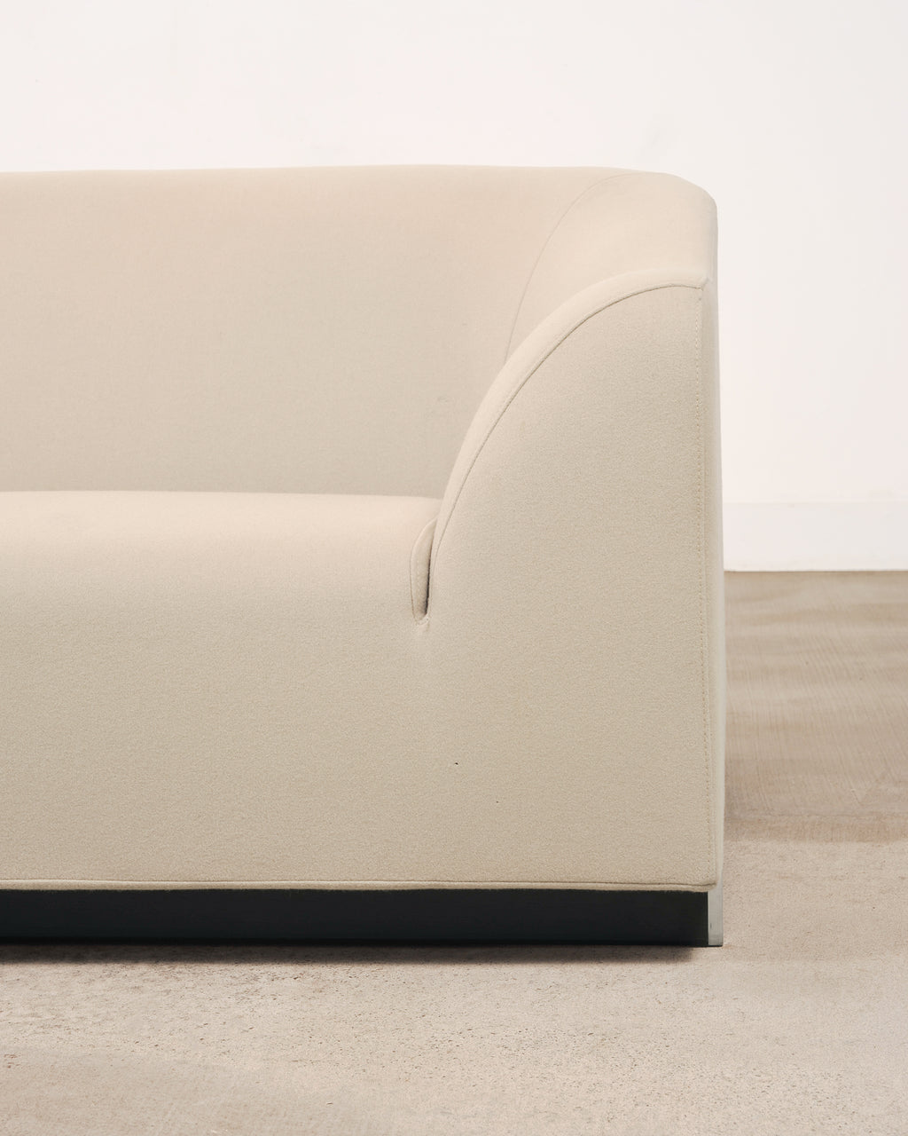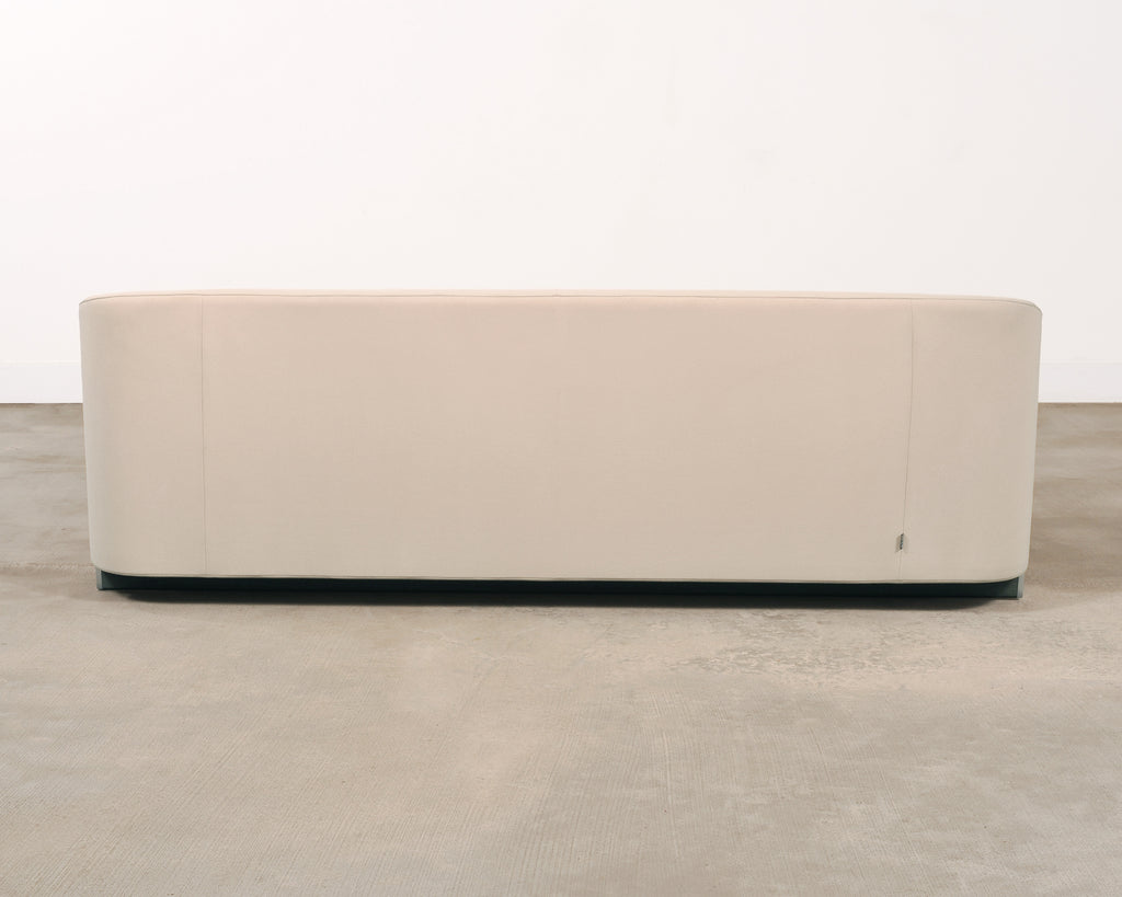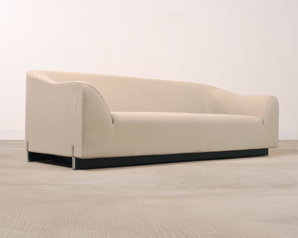A sculptural Modernist Snowdonia Sofa designed by Eric Jourdan (French b. 1961) for Ligne Roset, France. Constructed in the early 2000s in the Rhône-Alpes region of France. The low-slung design features a seamless, enveloping body with a broad curved back and subtly drawn-in arms creating a refined cocooned seat. The model is described by Ligne Roset as combining sensuous curves with purity of line. A recessed ebonized plinth base give the piece an understated floating effect, while exposed chromed metal supports provide a crisp contrast. The sofa is upholstered in a warm light ivory textile fabric complementing the sofa's subtle minimalist presence. The sophisticated sofa is suitable for a variety of interiors with a French Modernist and Minimalist profile. Ligne Roset tag is present on back of sofa. The sofa's arms measure 22" tall. The sofa is sturdy and strong having excellent joinery and craftsmanship. The fabric is presentable and clean with minor small marks as seen in photos. From the original owner estate in San Francisco, CA