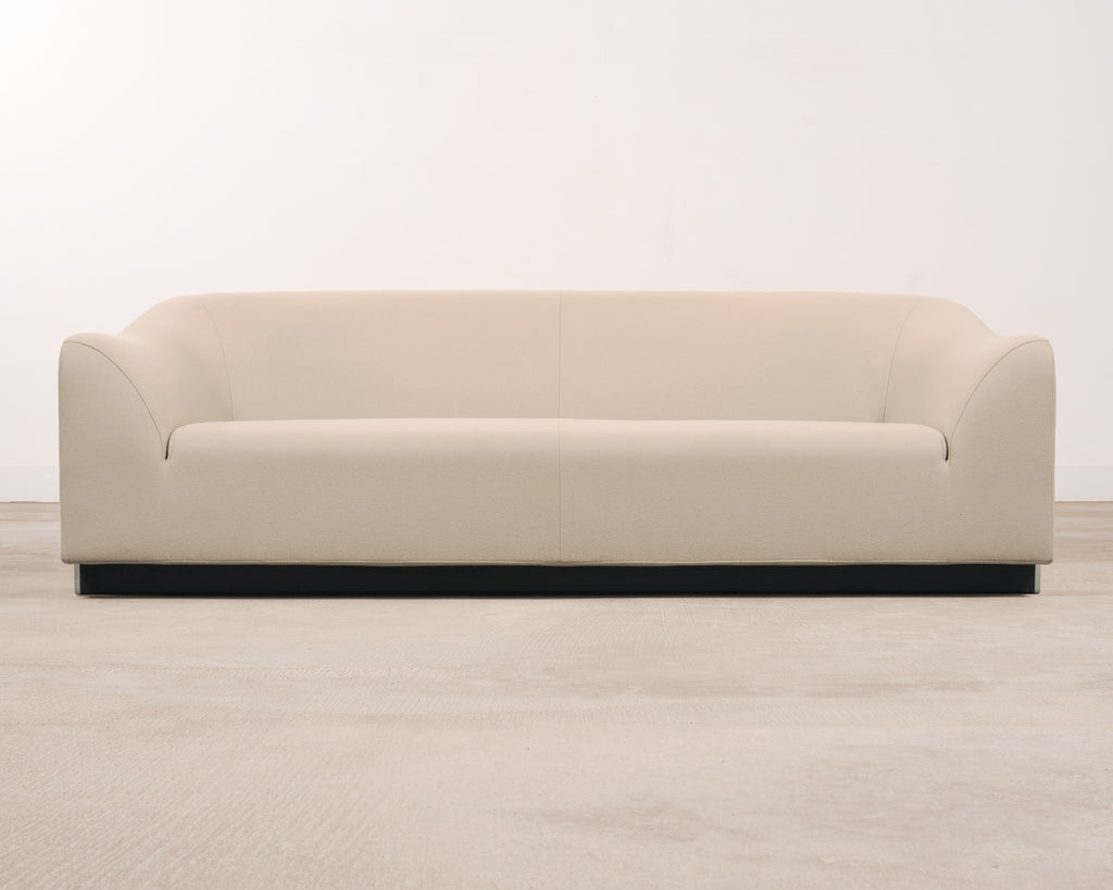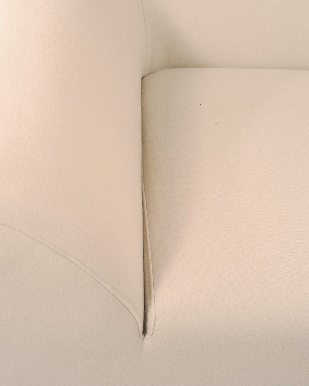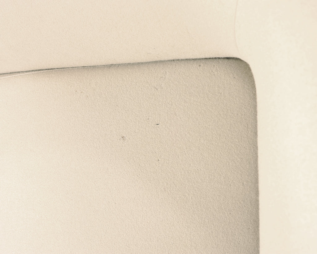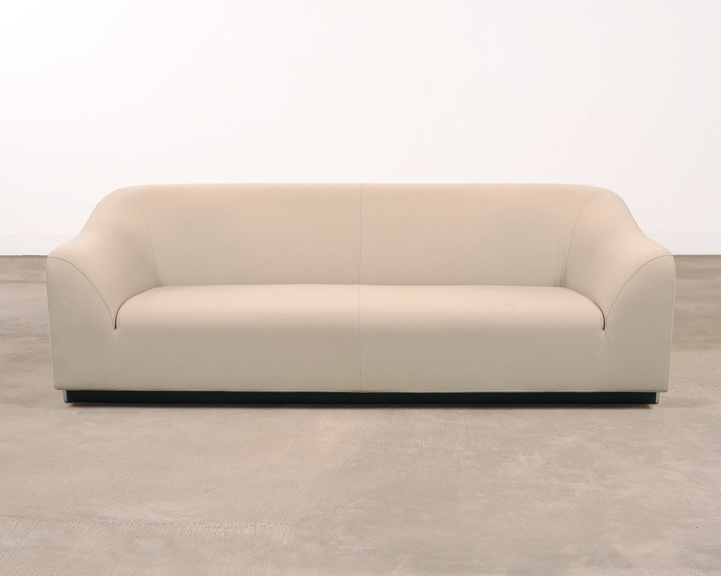 A sculptural Modernist Snowdonia Sofa designed by Eric Jourdan (French b. 1961) for Ligne Roset, France. Constructed in the early 2000s in the Rhône-Alpes region of France. The low-slung design features a seamless, enveloping body with a broad curved back and subtly drawn-in arms creating a refined cocooned seat. The model is described by Ligne Roset as combining sensuous curves with purity of line. A recessed ebonized plinth base give the piece an understated floating effect, while exposed chromed metal supports provide a crisp contrast. The sofa is upholstered in a warm light ivory textile fabric complementing the sofa's subtle minimalist presence. The sophisticated sofa is suitable for a variety of interiors with a French Modernist and Minimalist profile. Ligne Roset tag is present on back of sofa. The sofa's arms measure 22" tall. The sofa is sturdy and strong having excellent joinery and craftsmanship. The fabric is presentable and clean with minor small marks as seen in photos. From the original owner estate in San Francisco, CA