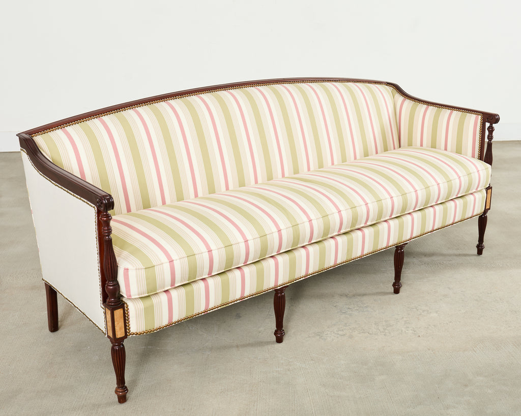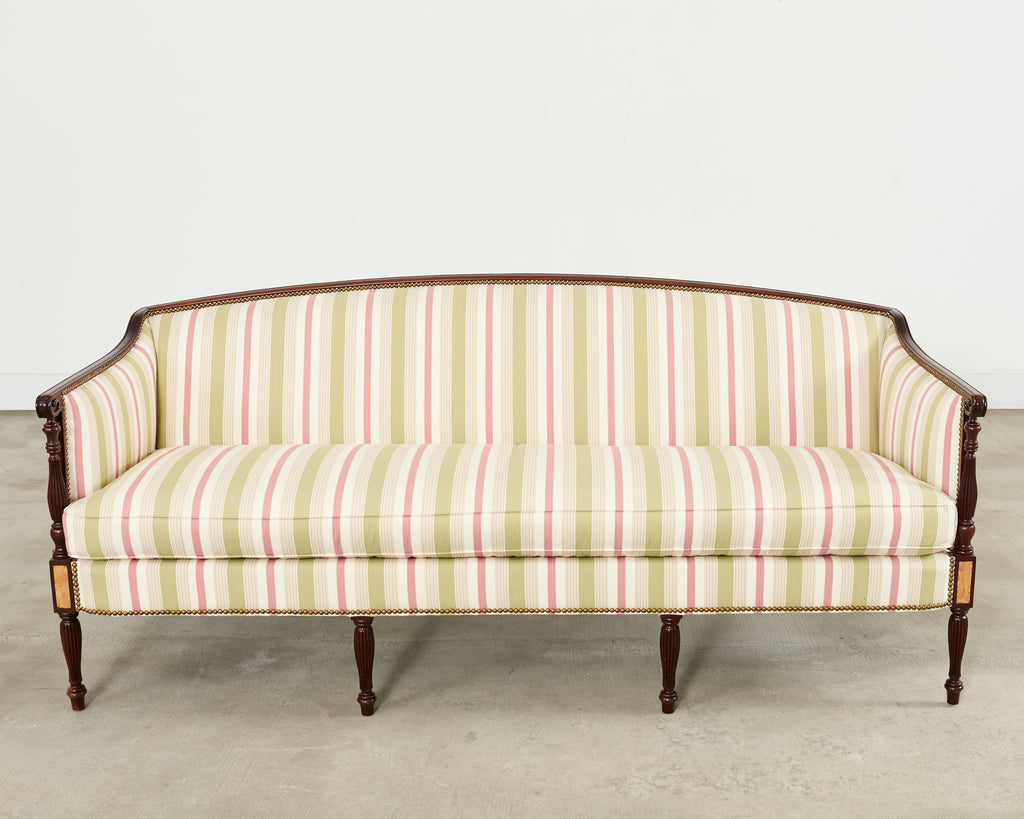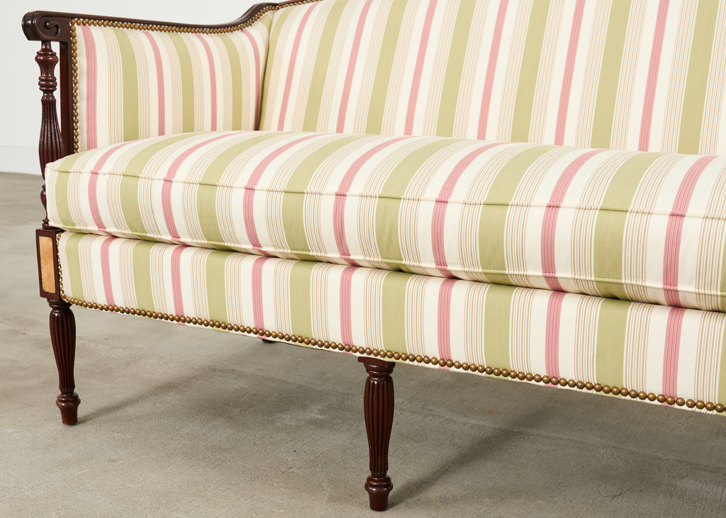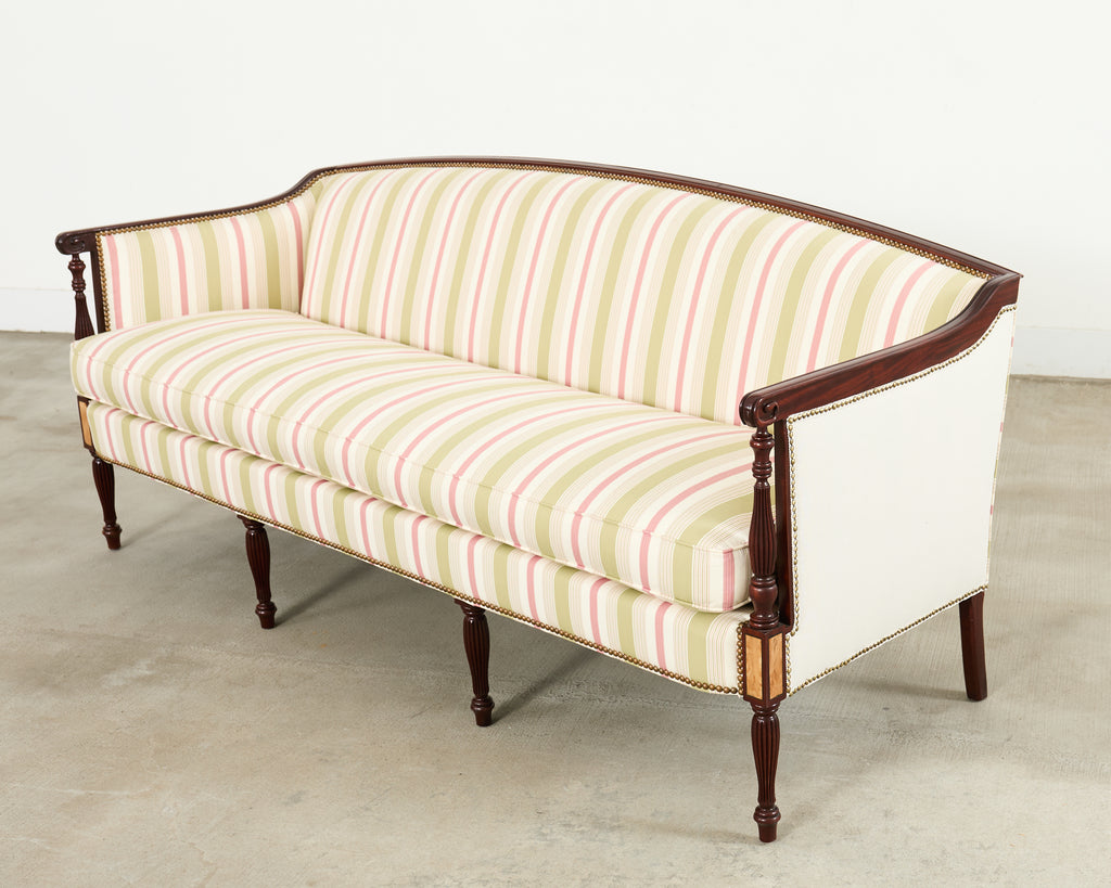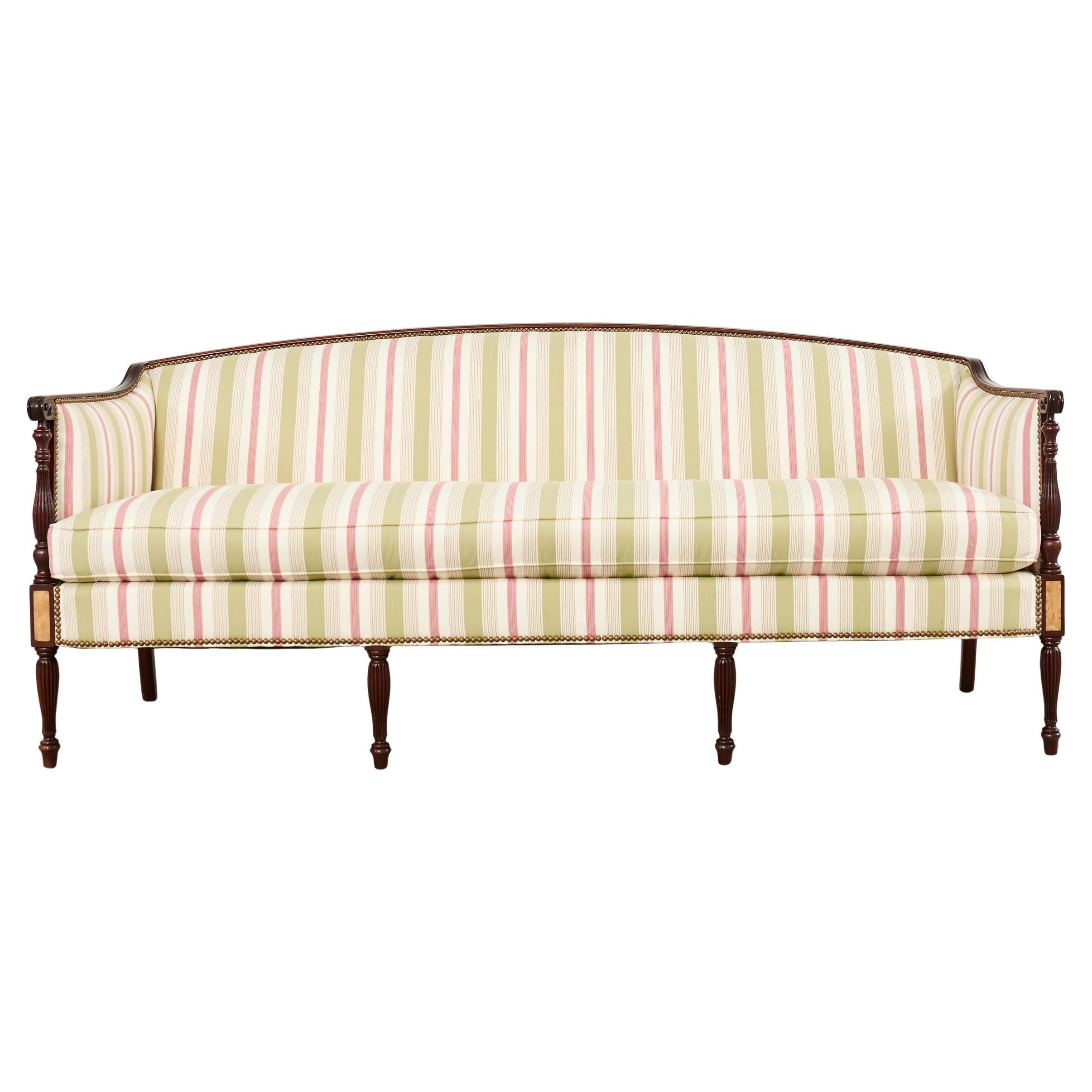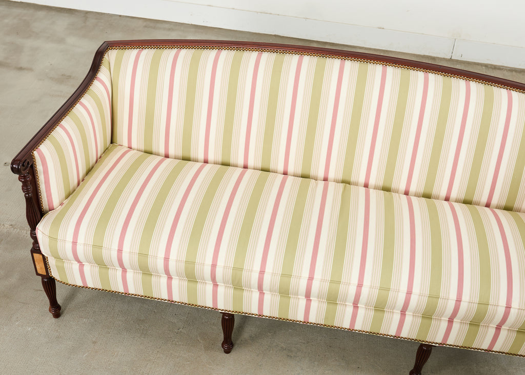 Stunning mahogany sofa settee crafted by Hickory Chair in the Federal or Sheraton taste. The sofa features a gracefully curved subtle hump back crest rail that extends to flat arms ending with scrolls. The arm supports are turned and fluted in the Sheraton manner. The sofa is upholstered with a whimsical striped pattern fabric in very good, presentable condition. The fabric is bordered by brass tack nail heads. The fabric is lively with shades of sage and rose over a cream ground. The sofa is supported by turned, fluted legs in the front. Sturdy and solid with excellent joinery and craftsmanship. The corners are accented by small maple burl inlay above the legs. The sofa has a large fitted loose seat cushion that tethers to the frame. Makers tag under seat cushion.