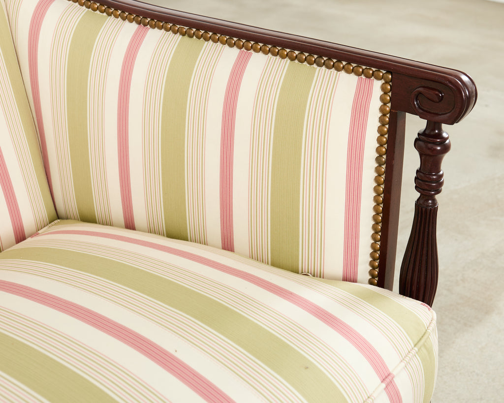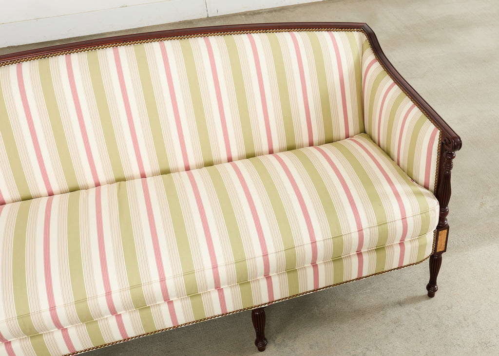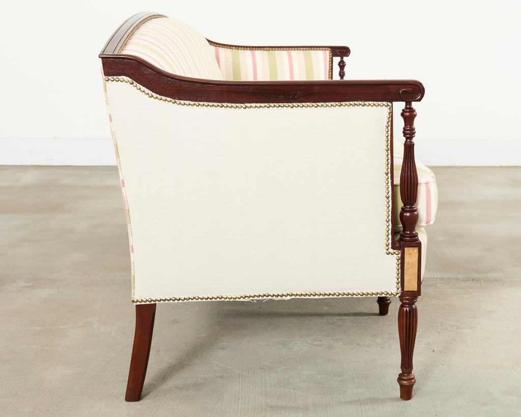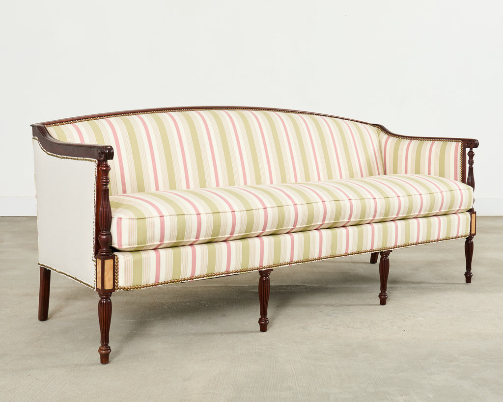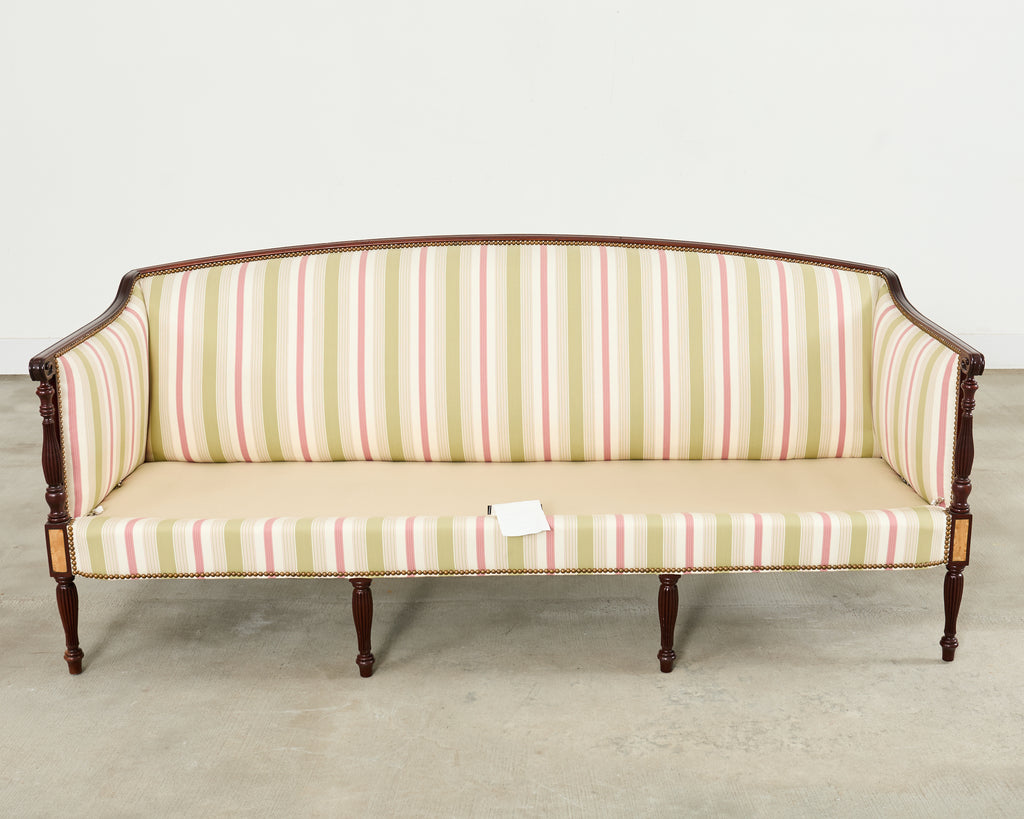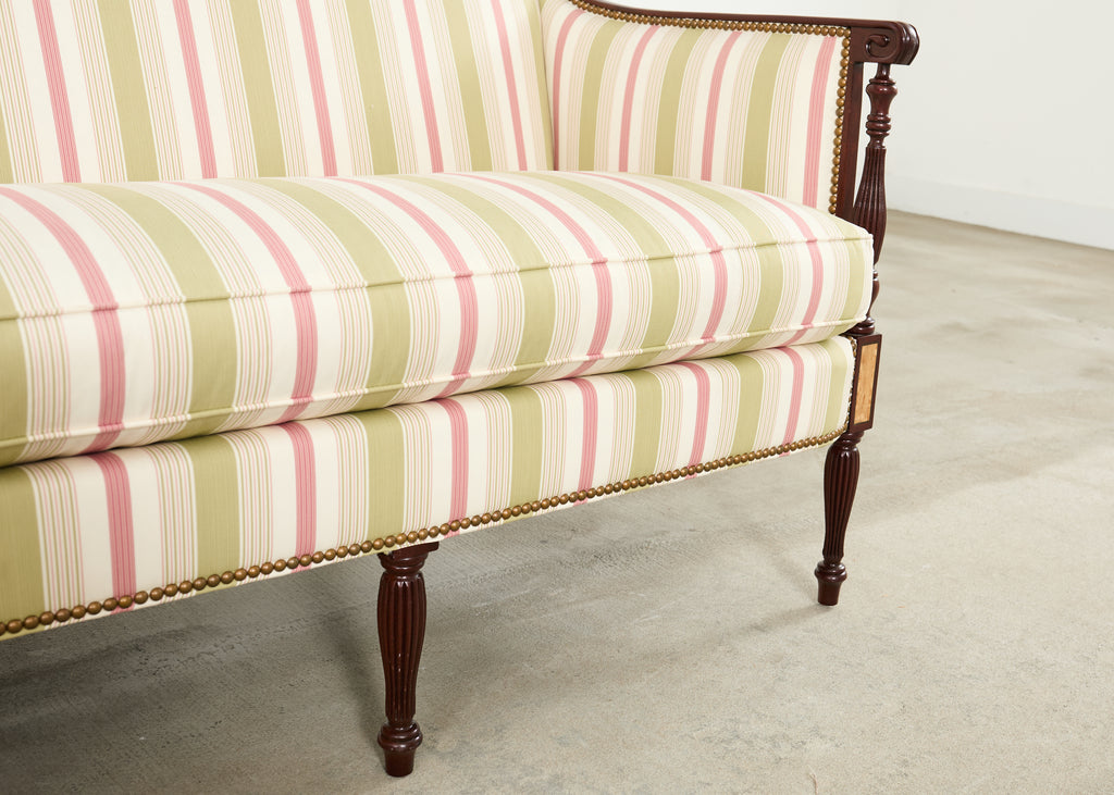 Stunning mahogany sofa settee crafted by Hickory Chair in the Federal or Sheraton taste. The sofa features a gracefully curved subtle hump back crest rail that extends to flat arms ending with scrolls. The arm supports are turned and fluted in the Sheraton manner. The sofa is upholstered with a whimsical striped pattern fabric in very good, presentable condition. The fabric is bordered by brass tack nail heads. The fabric is lively with shades of sage and rose over a cream ground. The sofa is supported by turned, fluted legs in the front. Sturdy and solid with excellent joinery and craftsmanship. The corners are accented by small maple burl inlay above the legs. The sofa has a large fitted loose seat cushion that tethers to the frame. Makers tag under seat cushion.