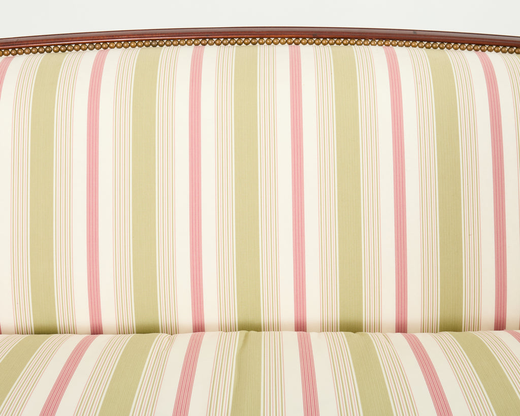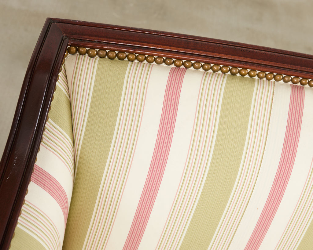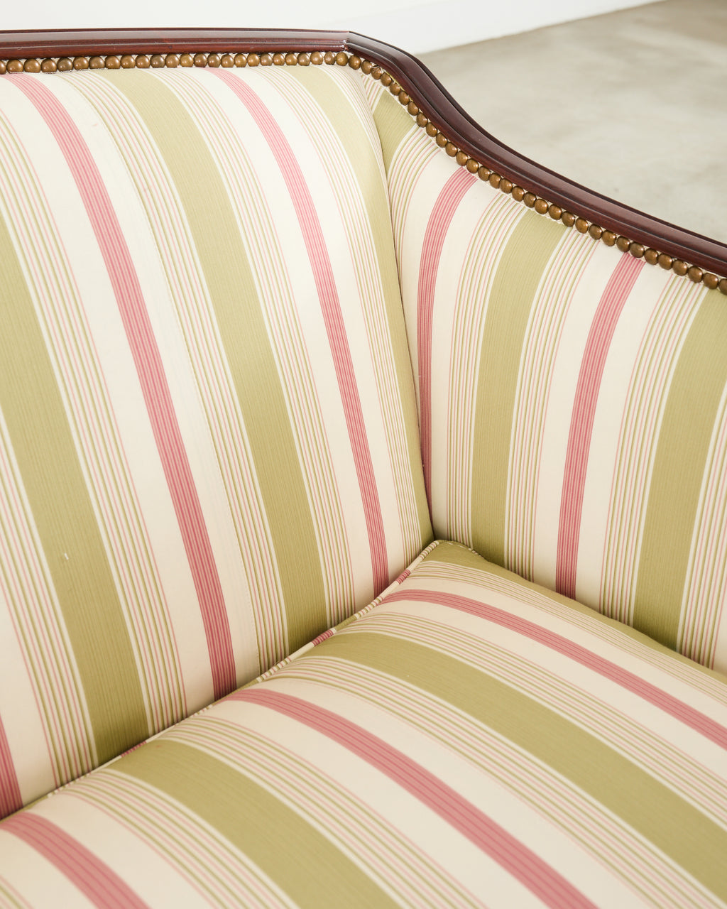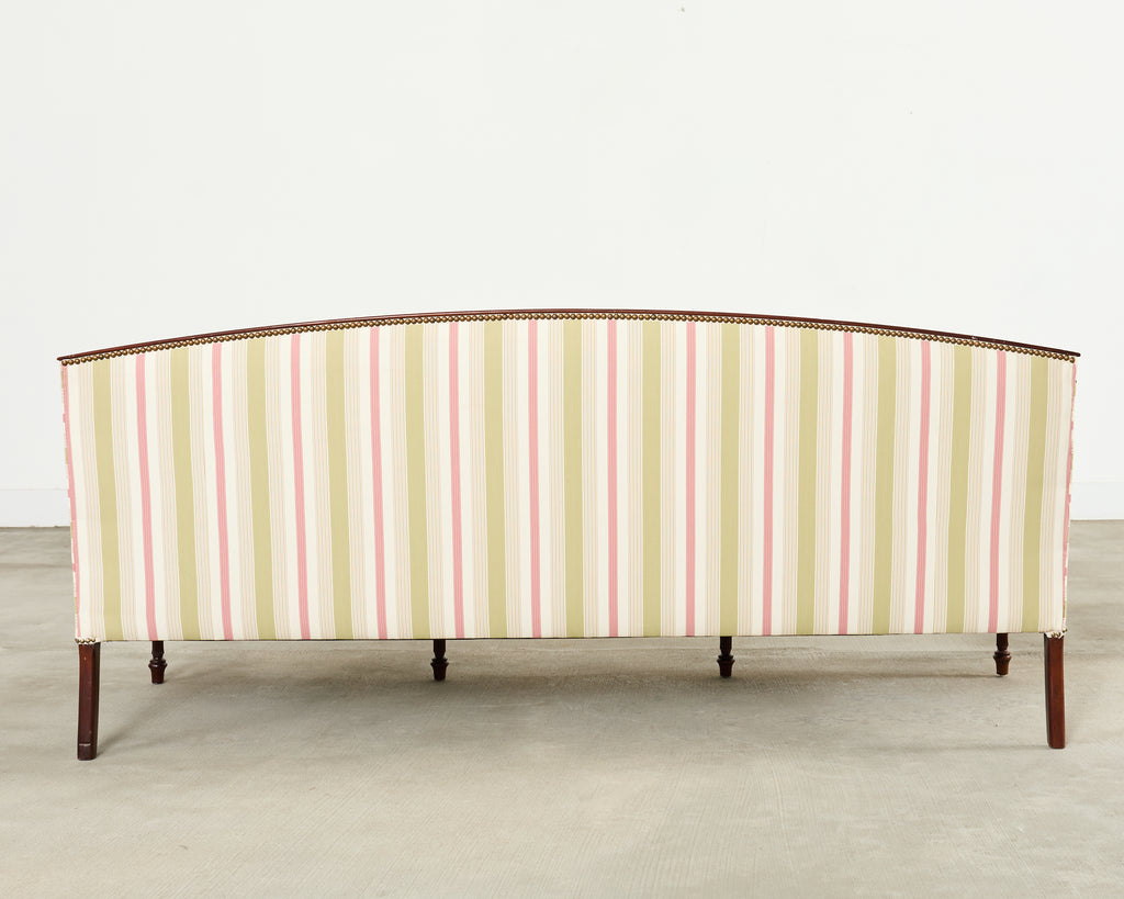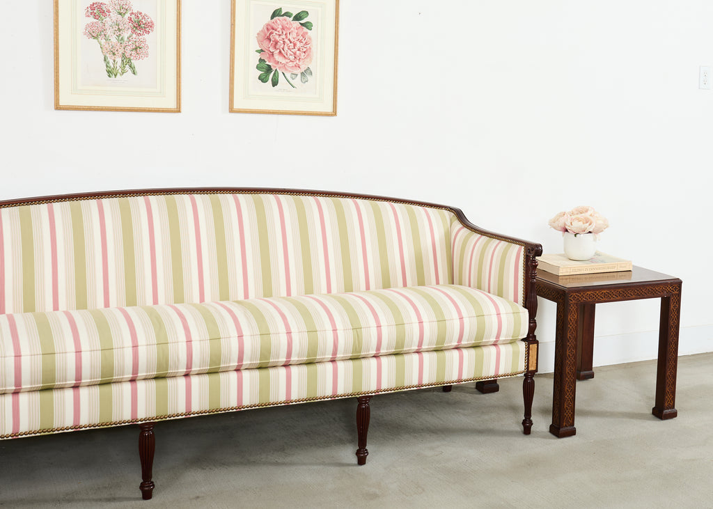 Stunning mahogany sofa settee crafted by Hickory Chair in the Federal or Sheraton taste. The sofa features a gracefully curved subtle hump back crest rail that extends to flat arms ending with scrolls. The arm supports are turned and fluted in the Sheraton manner. The sofa is upholstered with a whimsical striped pattern fabric in very good, presentable condition. The fabric is bordered by brass tack nail heads. The fabric is lively with shades of sage and rose over a cream ground. The sofa is supported by turned, fluted legs in the front. Sturdy and solid with excellent joinery and craftsmanship. The corners are accented by small maple burl inlay above the legs. The sofa has a large fitted loose seat cushion that tethers to the frame. Makers tag under seat cushion.