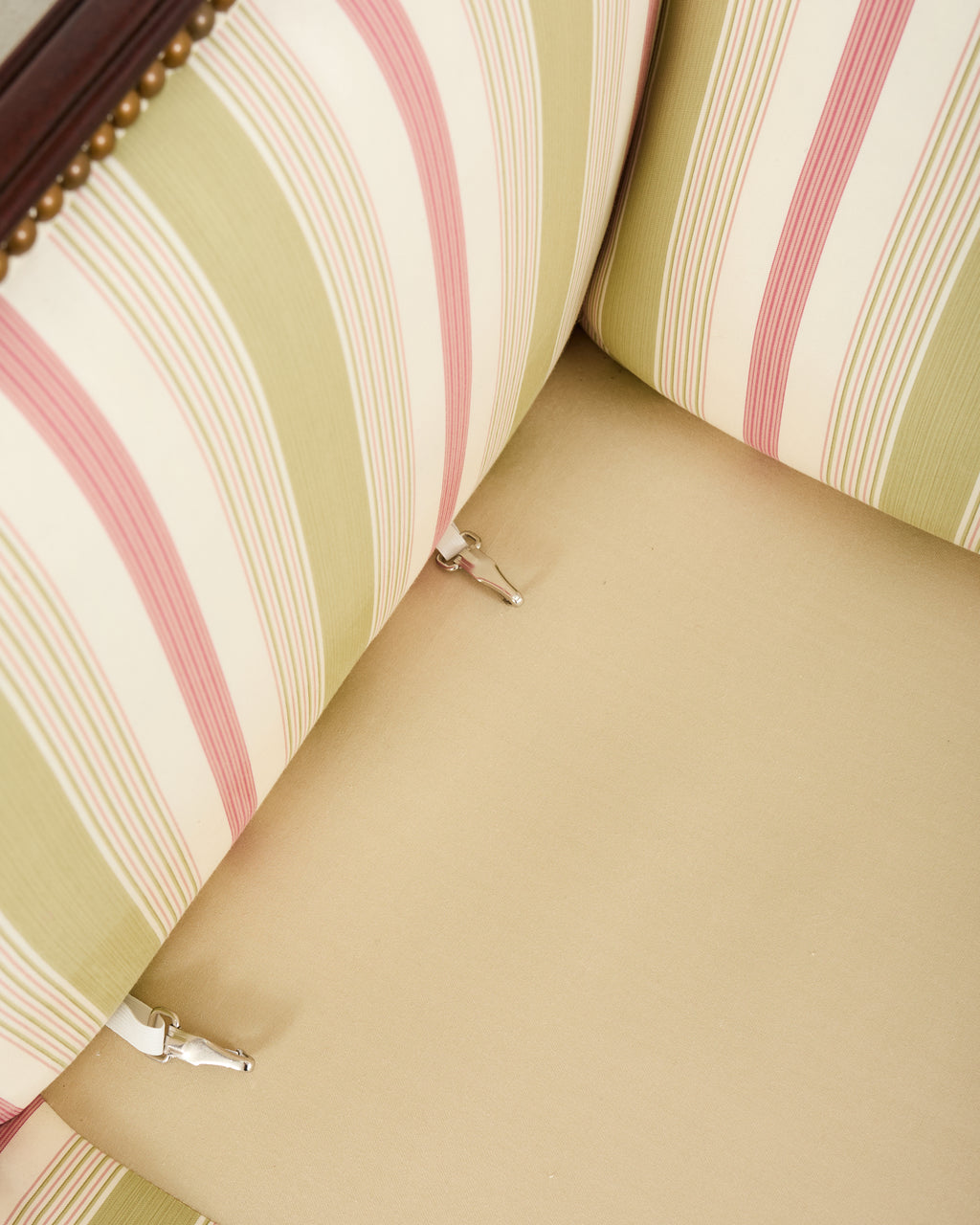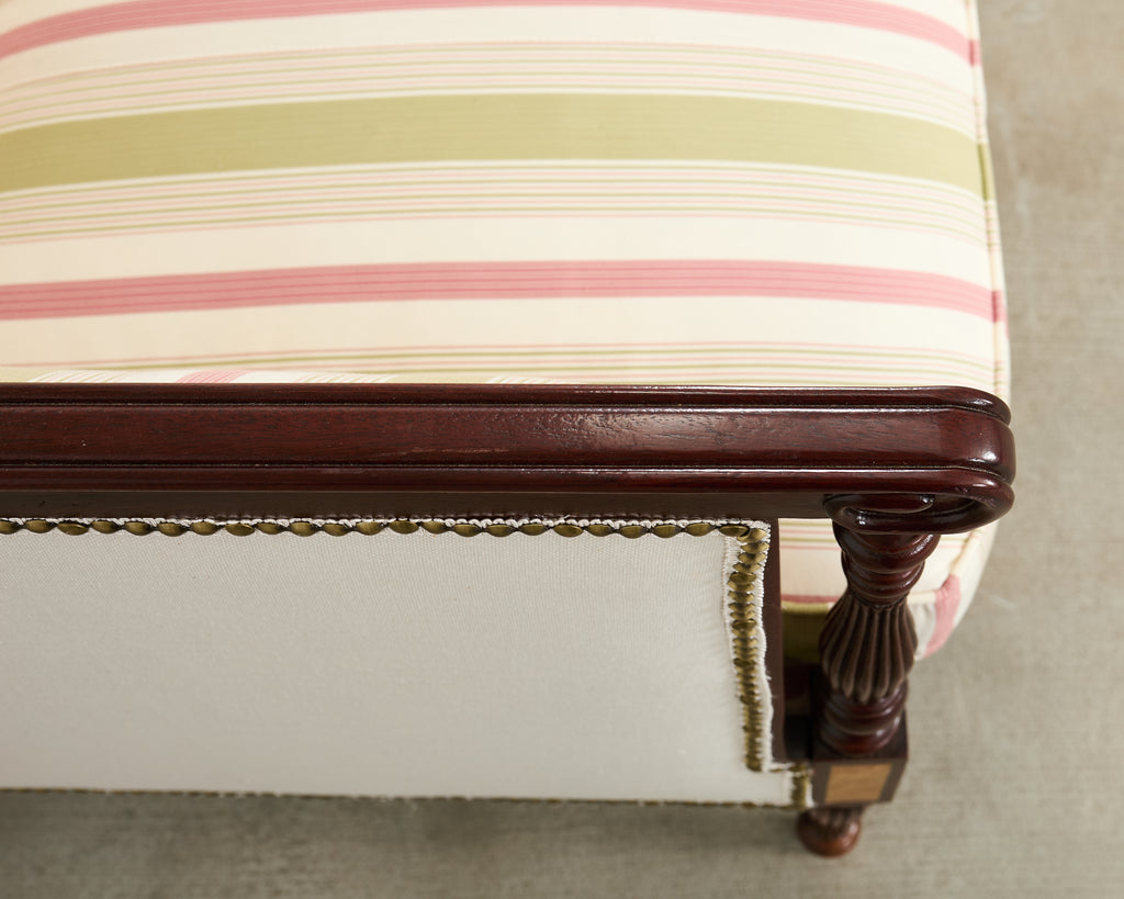 Condition: Good, wear consistent with age and use. Replacements made. Reupholstered. Beautifully crafted with solid joinery and construction. Very good, well preserved condition as seen in photos. Fabric on ends appears to have been replaced. Age appropriate wear with minor chips, scuffs and scratches that are difficult to see.