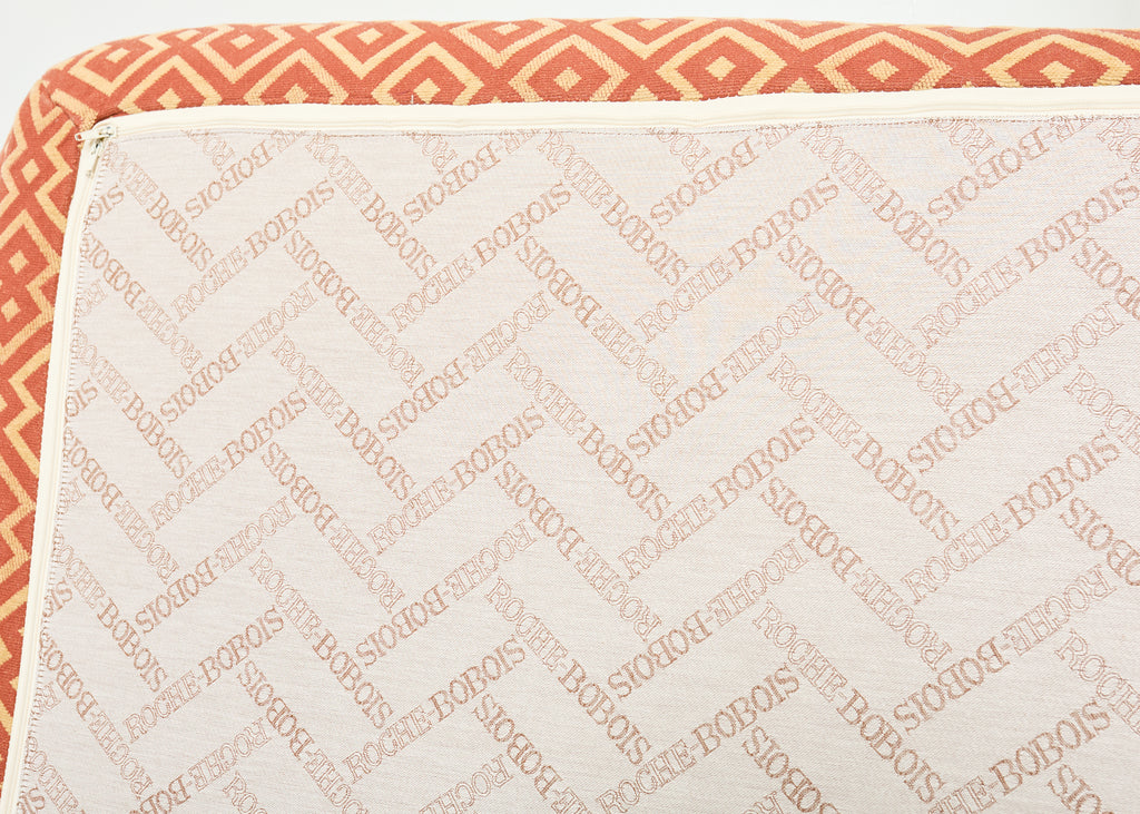 Rare and iconic 1st edition circa 1971 Mah Jong modular sectional sofa consisting of ten element pillows. The sofa was designed by Hans Hopfer for Roche Bobois in this avant-garde design which features a rounder, softer shape to the cushions than the later iterations. The rare set consists of two back rests and eight square pillows. The fabric has five pieces with a dramatic geometric diamond design over a chic pumpkin orange background. The other five cushions are solid orange. The large set as shown measures 114 inches wide and 75 inches deep. Bold style with modular flexibility that offers many design possibilities and shapes. Each cushion was made entirely by hand in a French workshop. Original labels on bottoms The sectional is located in our California warehouse ready for delivery and installation.