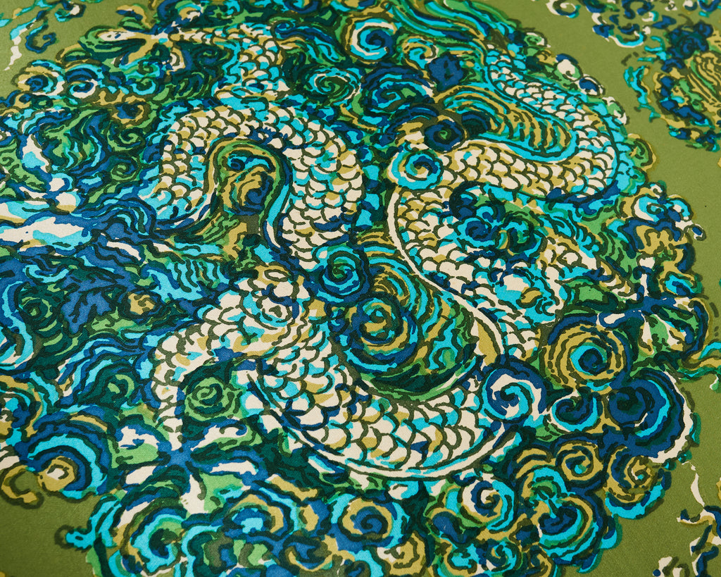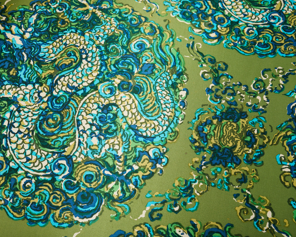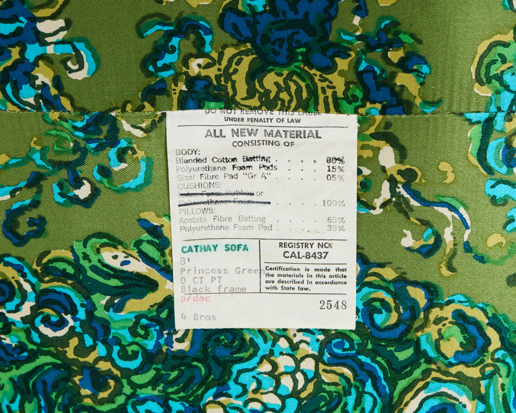 Fantastic mid-century modern upholstered gondola sofa made in the style and manner of James Mont. The chic sofa features a gondola sled inspired wood frame with an ebonized black lacquer finish. The wood frame is low slung upholstered with a Chinoiserie motif dragon fabric inspired by Jack Larson. The sofa is in "as found" condition with faded fabric and older repairs to the frame. The sofa has a dramatic profile and design with original makers label. The long frame has three fitted loose seat cushions and gracefully curved arms measuring 21 inches high. From an estate in San Francisco, California.
