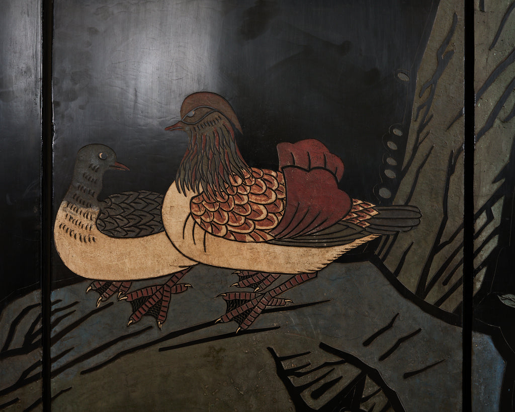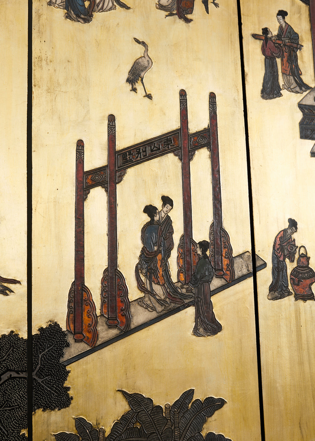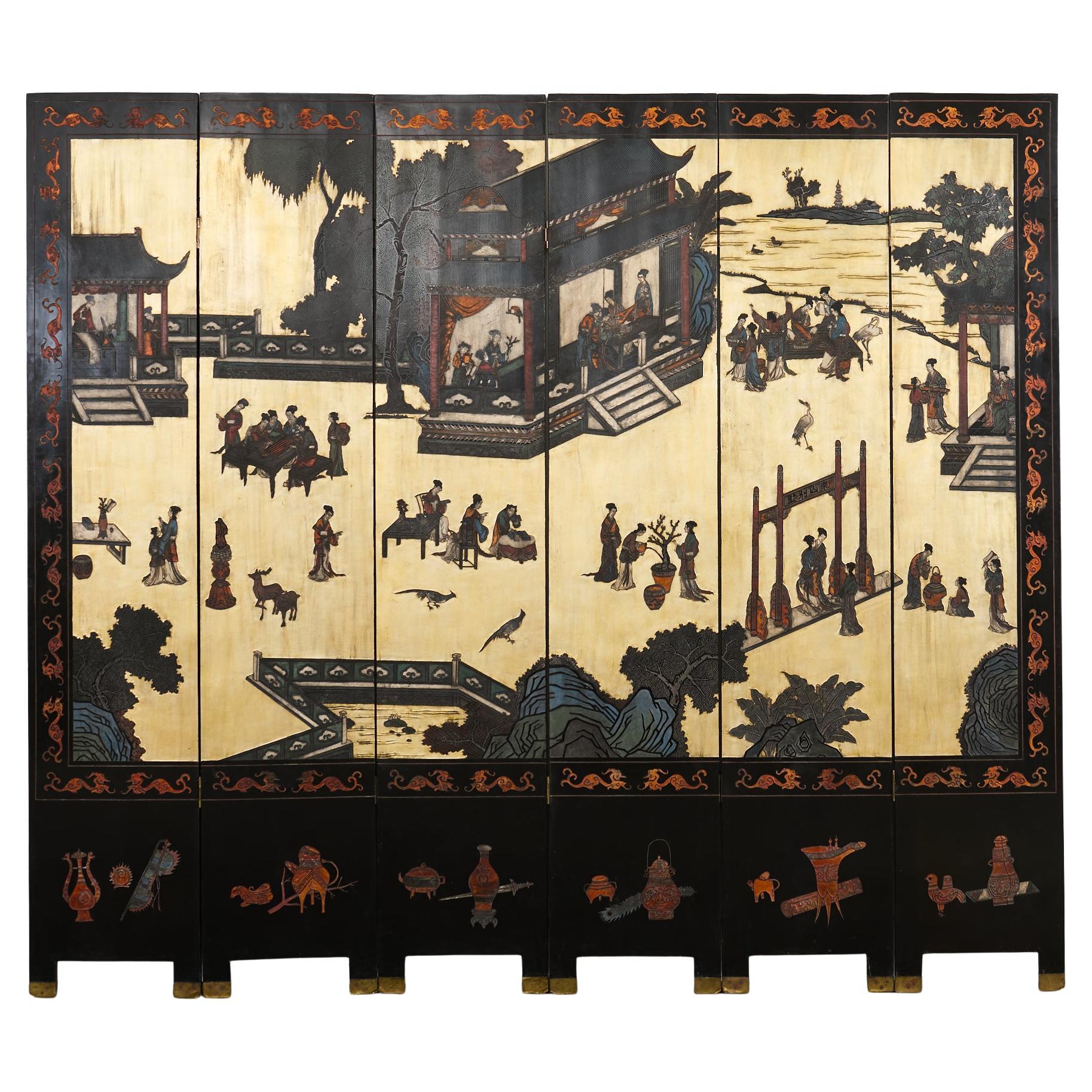 Chinese Export Six Panel Coromandel Screen Gilt Courtyard