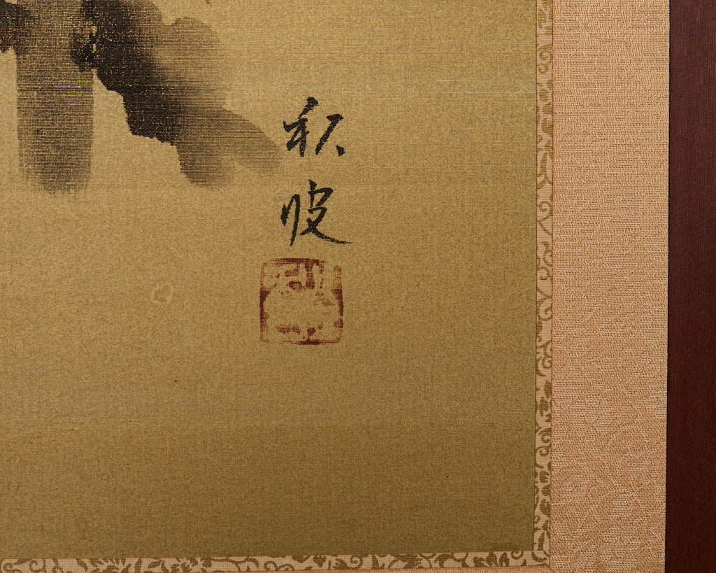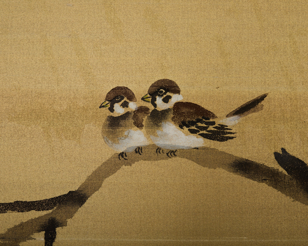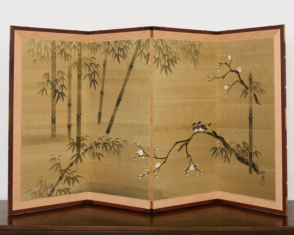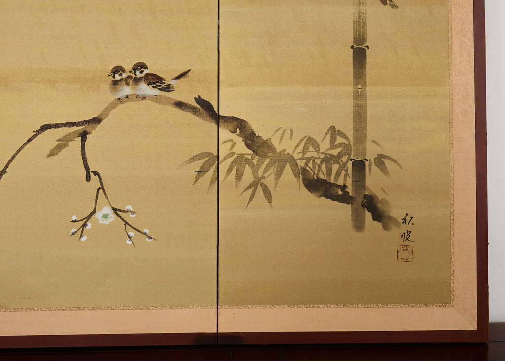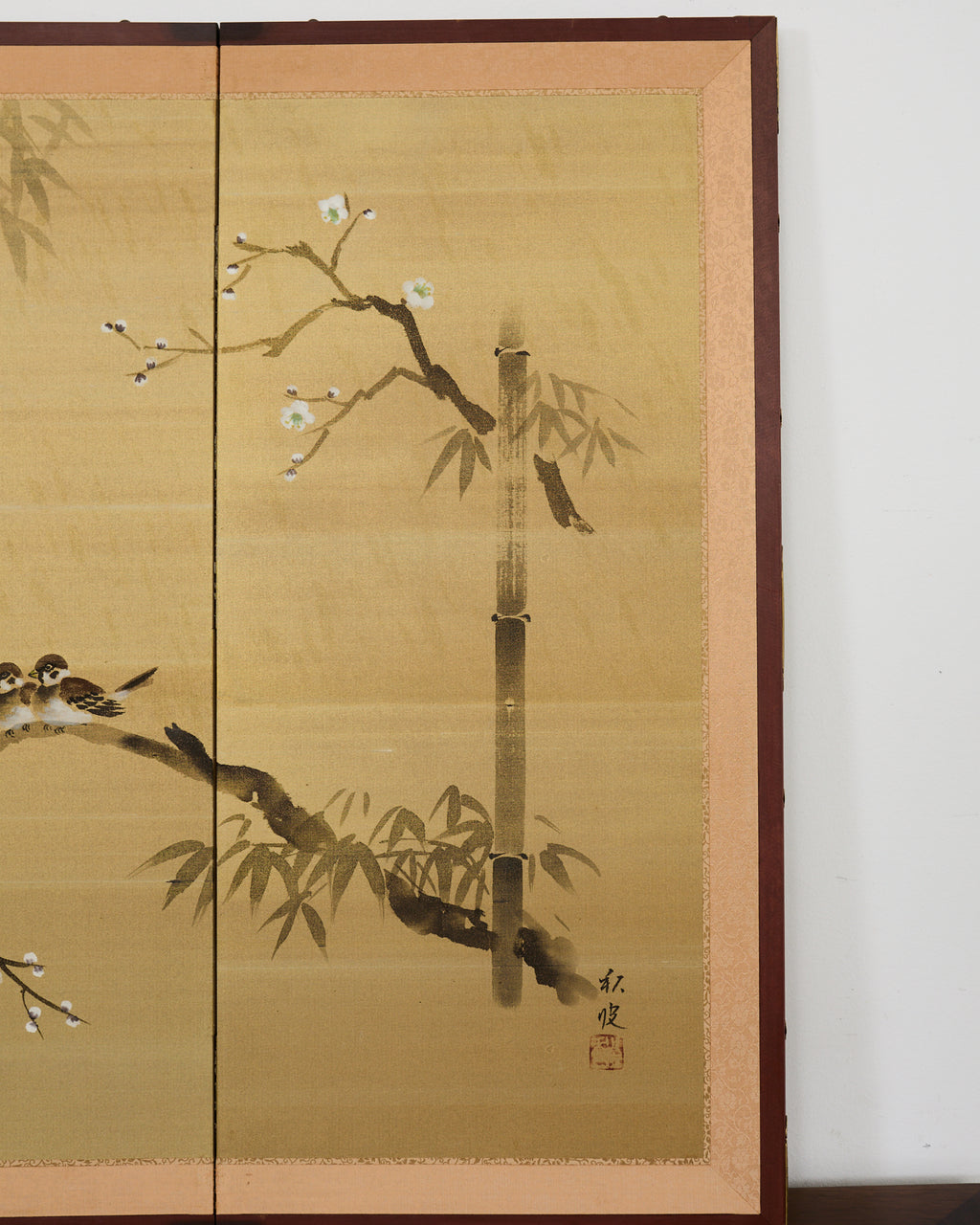 Serene mid-20th century Showa period Japanese four-panel folding byobu screen made in the Nihonga school style. The painting features a spring bamboo landscape with blossoming flowers and two Japanese song birds resting on a branch. Painted over a gilt silk background with natural ink and color pigments. The painting is set in a natural wood finished frame with a silk brocade border. The background has subtle bamboo leaf shadows covering the backdrop of the landscape. Very good, well-preserved condition given age and use. From an estate in Marin, California. Signed with an artist seal on the right side.