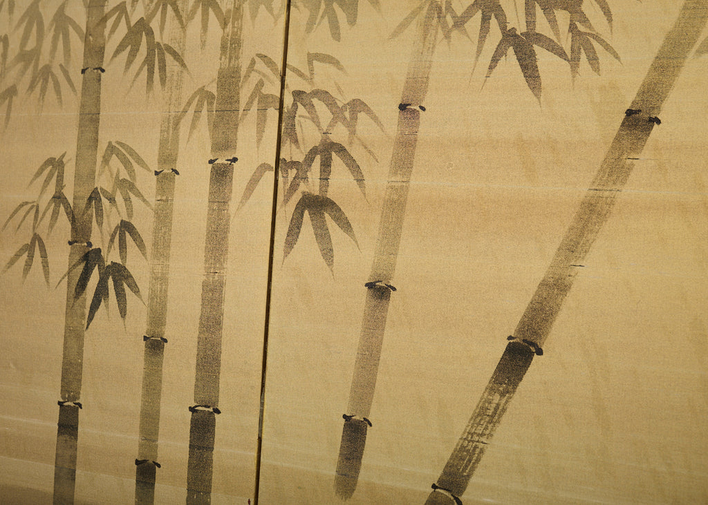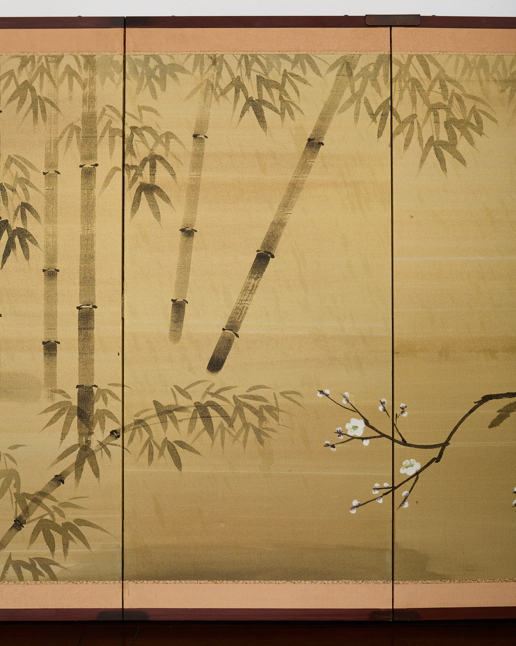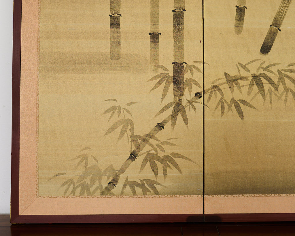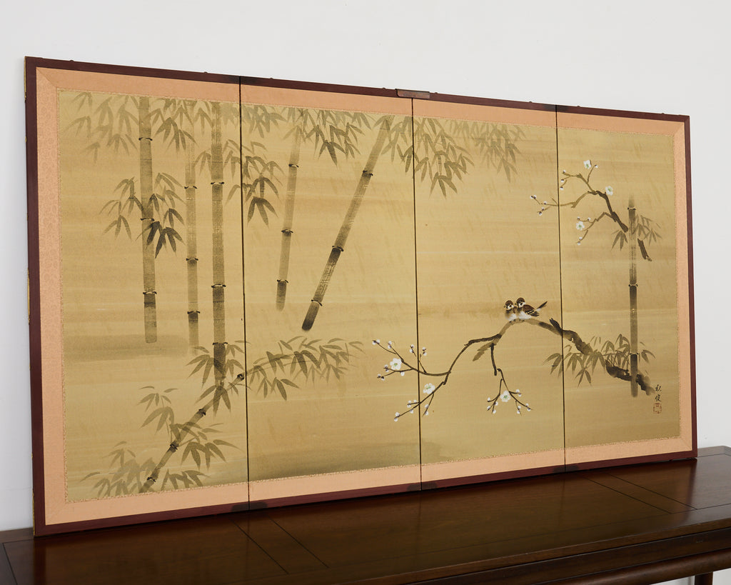 Japanese Showa Four Panel Screen Spring Bamboo Landscape