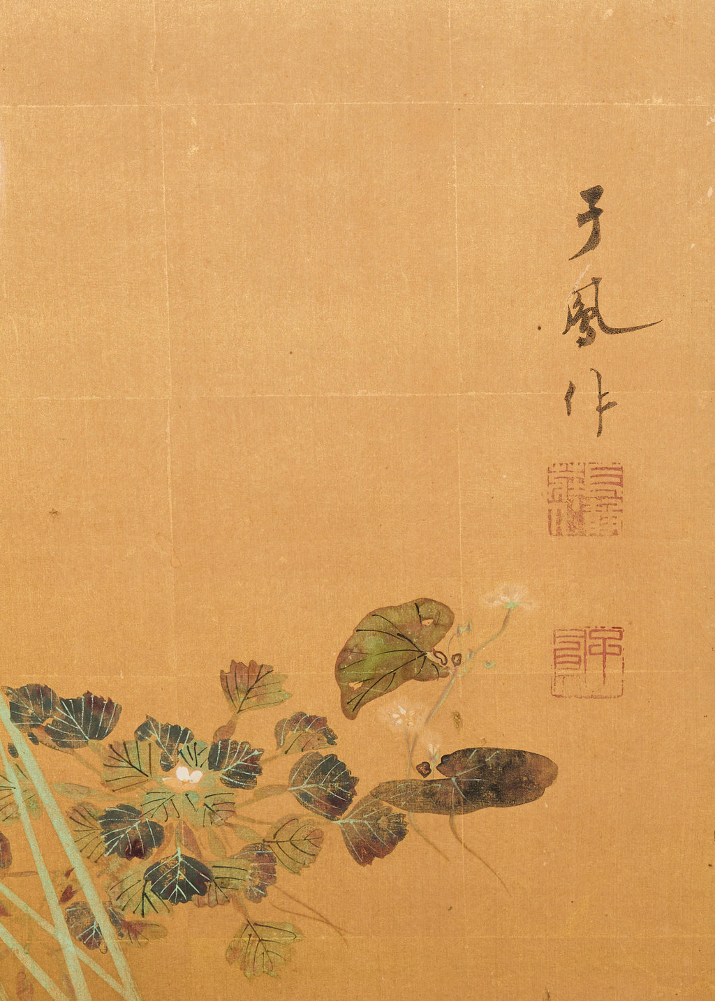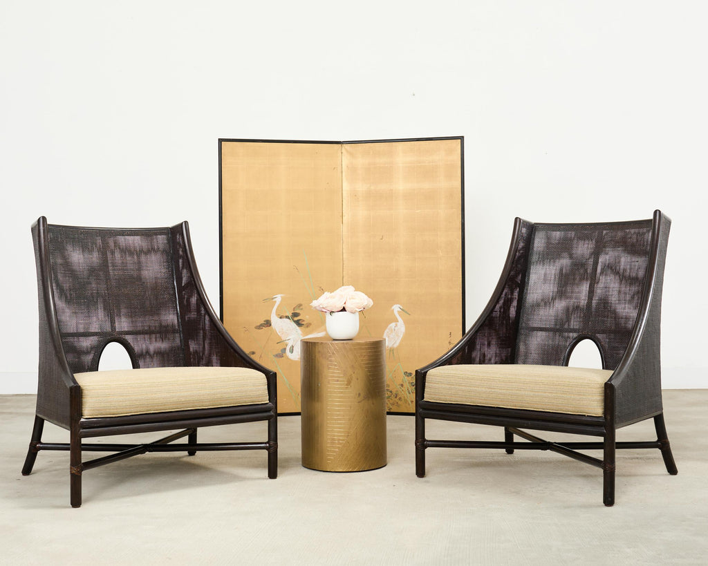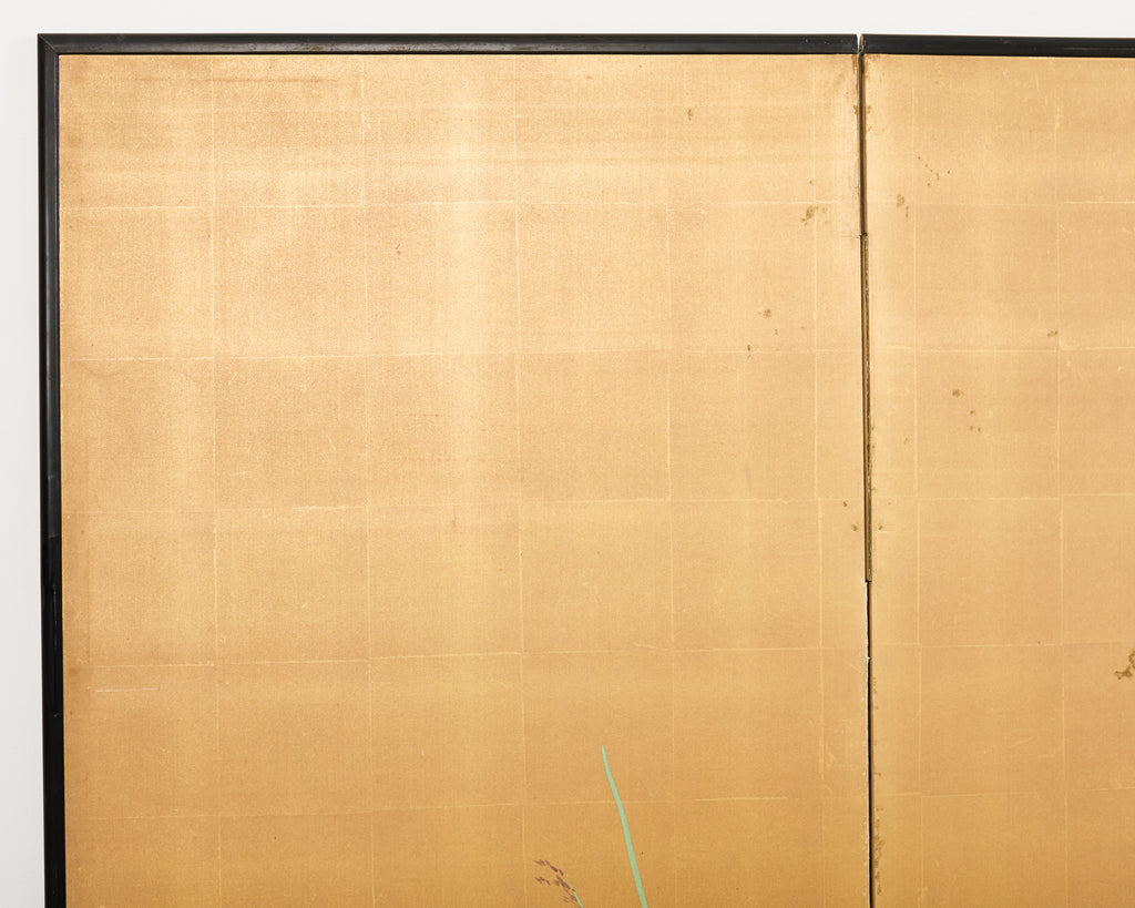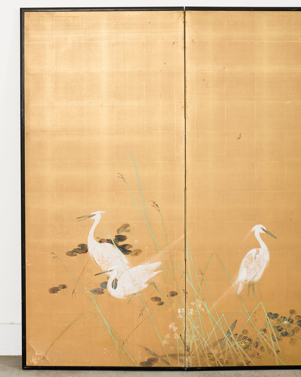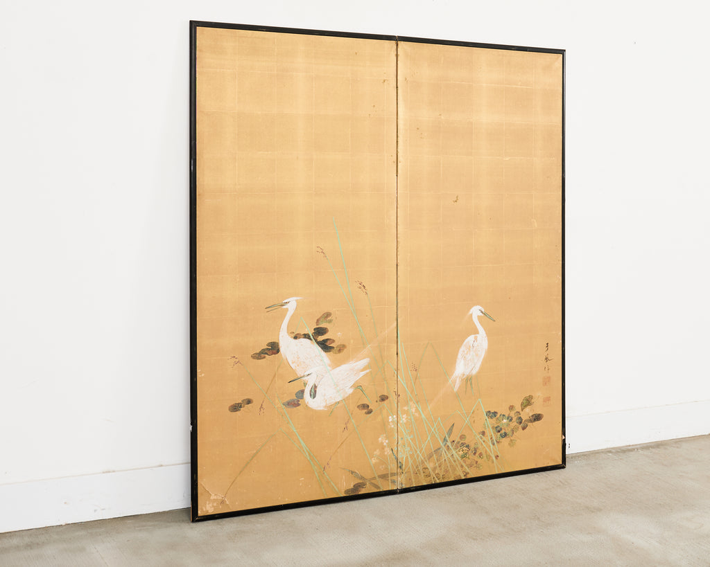 Stunning Japanese Showa period two-panel folding byobu screen depicting three egrets in the grass at a pond. The large screen features a dramatic gold leaf square background with natural ink and color pigments. Painted in the Nihonga school style with soft details. Signed by artist with two seals on the right side "Shifu-Zukuri (made by)". The painting has a desirable aged patina with a small loss on the bottom left side. The large scale is very impressive with a shimmery gilt background that captures the light. From an estate in San Francisco, CA.