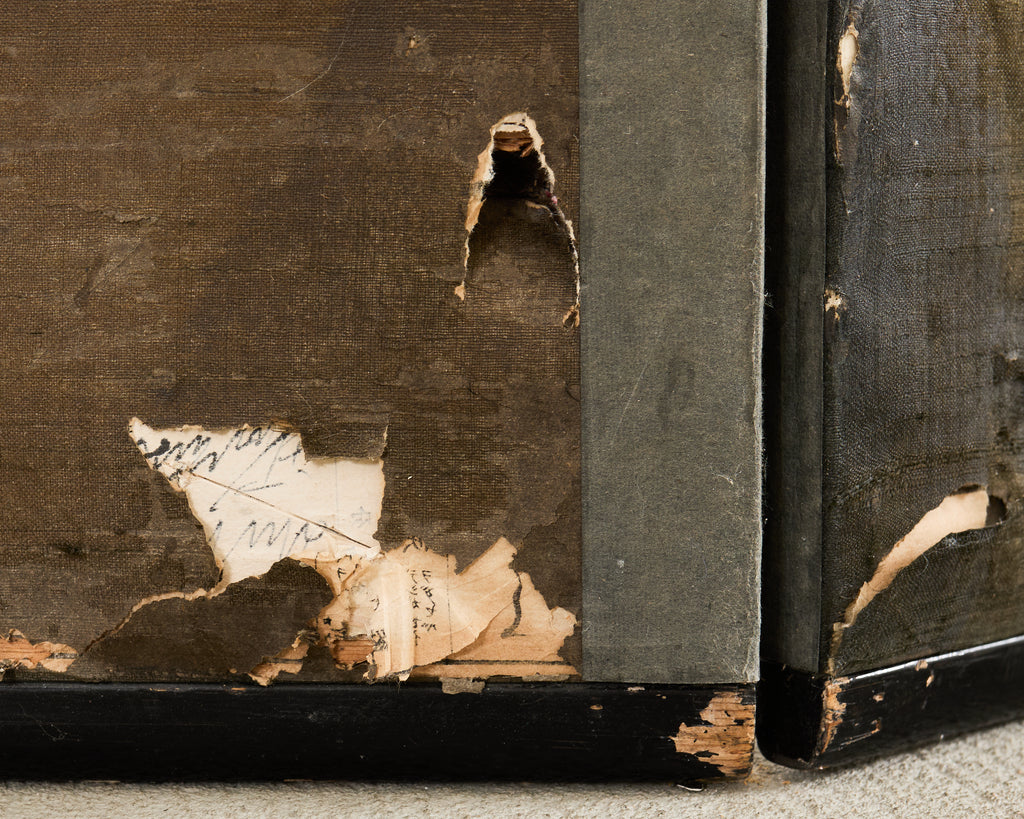 Condition: Distressed, wear consistent with age and use. Minor losses. Beautifully crafted with a loss to the bottom left side of the painting as seen in photos. The front shows well with a desirable aged patina. Minor chips, scuffs on frame. Losses reverse side.