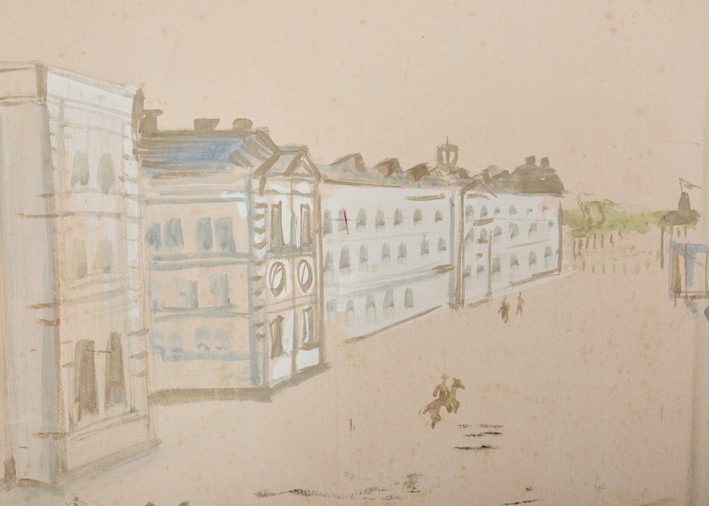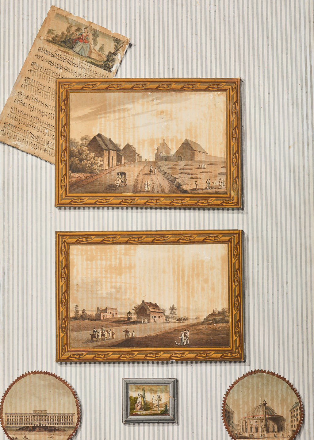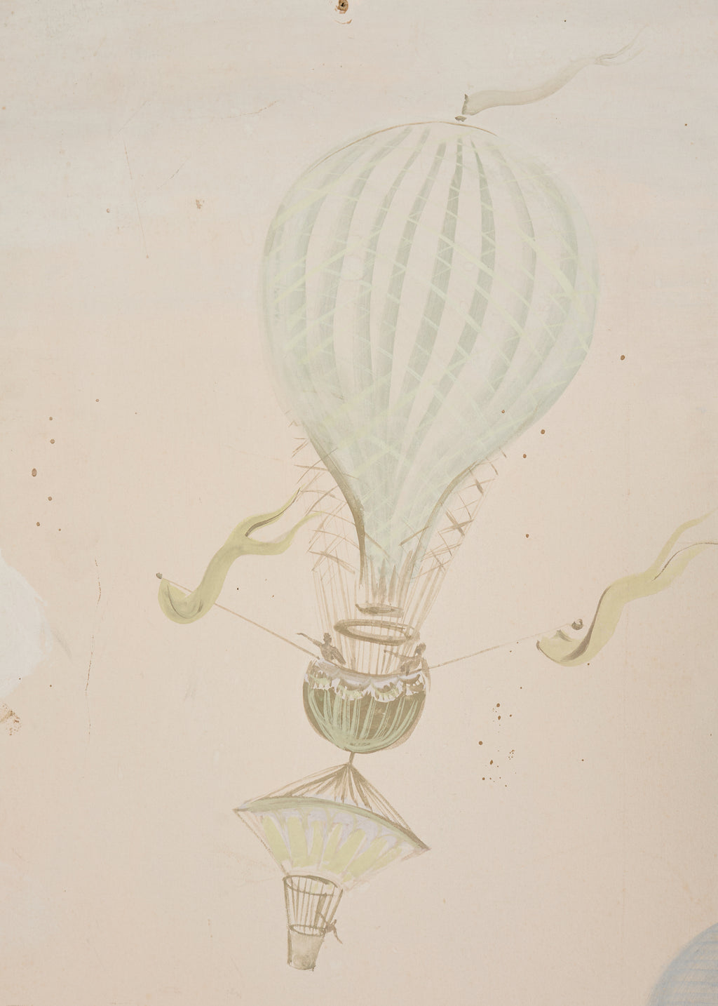 Fantastic mid-century modern Italian four panel double sided screen featuring painted trompe l'oeil decoration and applied decoupage art motifs of paintings. Constructed from wood panels with painted architectural detailing and framing. The panels are embellished with applied decoupage paintings in frames of landscapes, botanicals, portraits, and ornaments in the neoclassical and Victorian taste. The lower portions of the screen have faux paneling framed borders. The opposite side features a painted French street scene of late 19th century with carriages and a hot air balloon. The painted city scape uses light and muted paint tones. The screen has good construction and joinery with a desirable distressed finish on the finish commensurates age and use. The decoupage pictures are probably older than the screen appearing to be 19th century and older. Wonderful conversation piece with a continental aesthetic. From an estate in Beverly Hills, California.