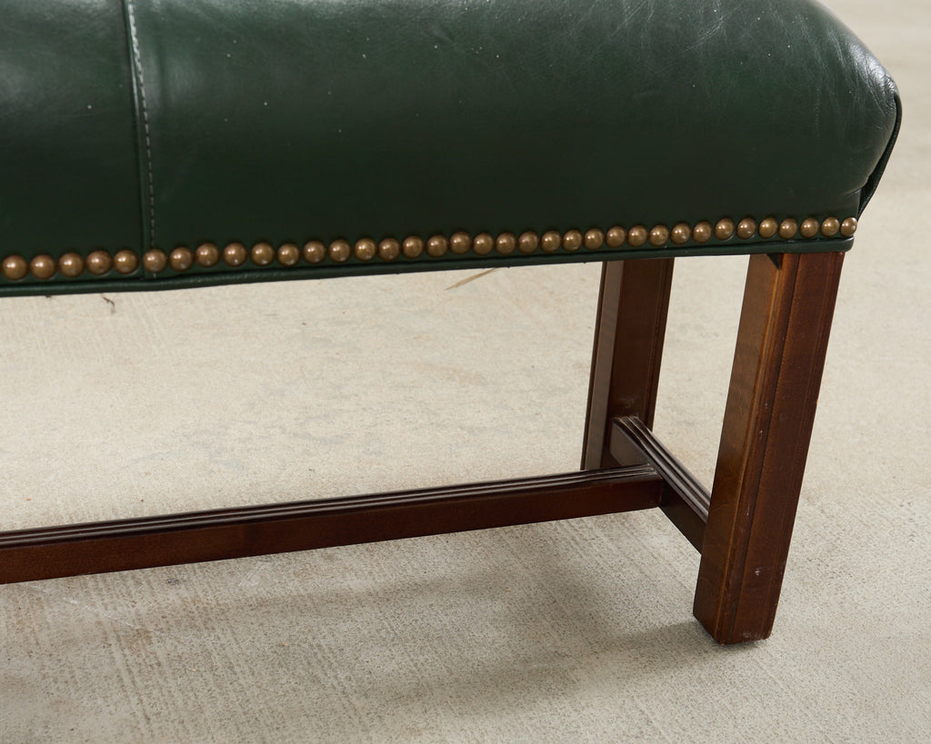 Handsome elongated mahogany footstool made in the George III taste. The footstool features a nearly 4 foot long mahogany frame upholstered with leather hides in a British green color bordered with patinated brass tack nail needs. The frame is sturdy and strong with excellent joinery and craftsmanship. The stool is supported by square reeded legs conjoined by an H stretcher. The leather is soft and supple with good color saturation and plush cushioning. Beautifully aged patina from an estate in the Napa Valley, CA. The diminutive height allows it to be stored or displayed under a console or end of a bed.