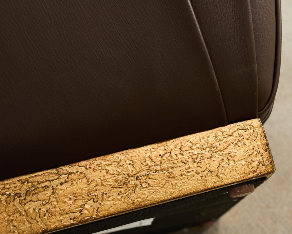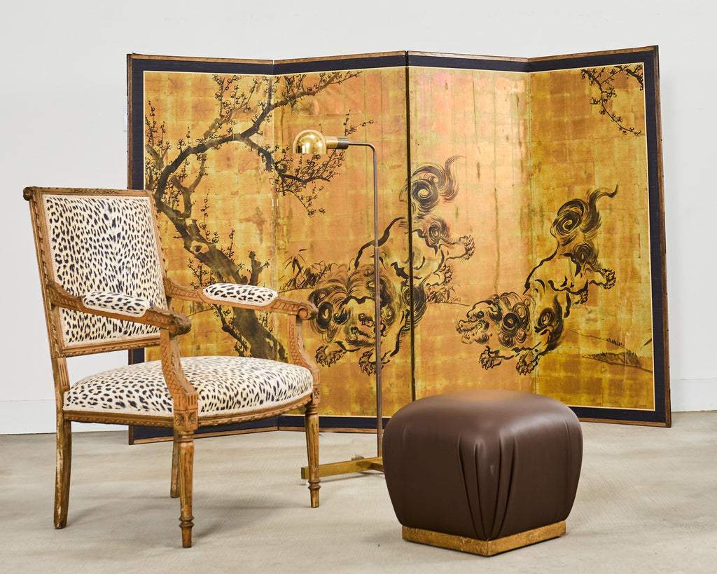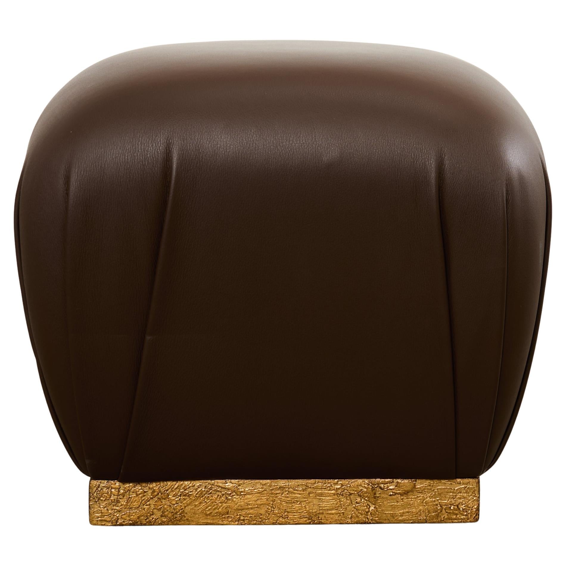 Handsome mid-century modern souffle ottoman pouf or footstool constructed in the manner and style of Karl Springer. The pouf features a rare soft, supple leather cover in a rich, dark chocolate tone. The frame is crafted from oak with a dramatic gilt finished base having a textured, antique aged patina. Attributed to Marge Carson the stool is very solid and sturdy with excellent joinery and craftsmanship. From an estate in San Francisco, California.