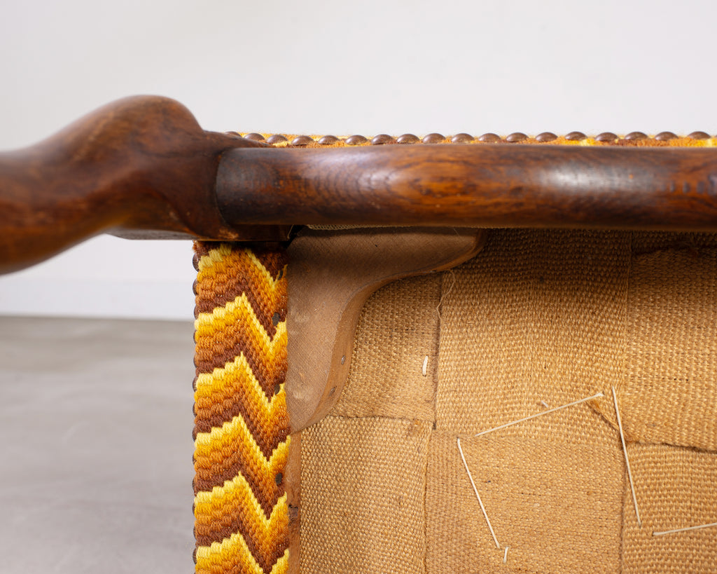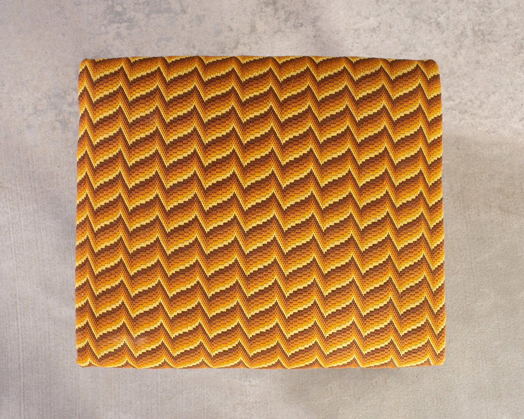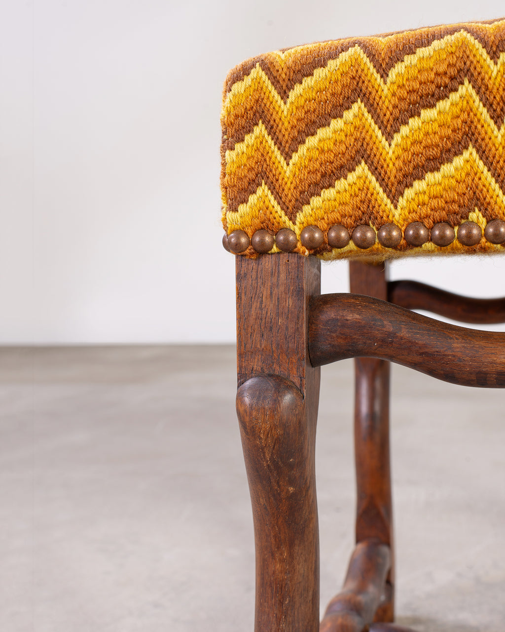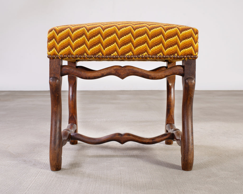 Whimsical country French oak stool or bench seat made in the Louis XIII taste. The bench features an oak frame with Os de Mouton or mutton legs. The frame is upholstered with a colorful fabric having a geometric chevron zigzag pattern bordered by patinated brass tack nail heads. The thick, curved mutton legs are conjoined by curved stretchers making the stool very sturdy and solid. The oak has a rich, aged patina that showcases the woodgrains. The wood has a smooth hand rubbed finish with soft wear and patina. The fabric features dramatic yellow, amber, and brown tones.