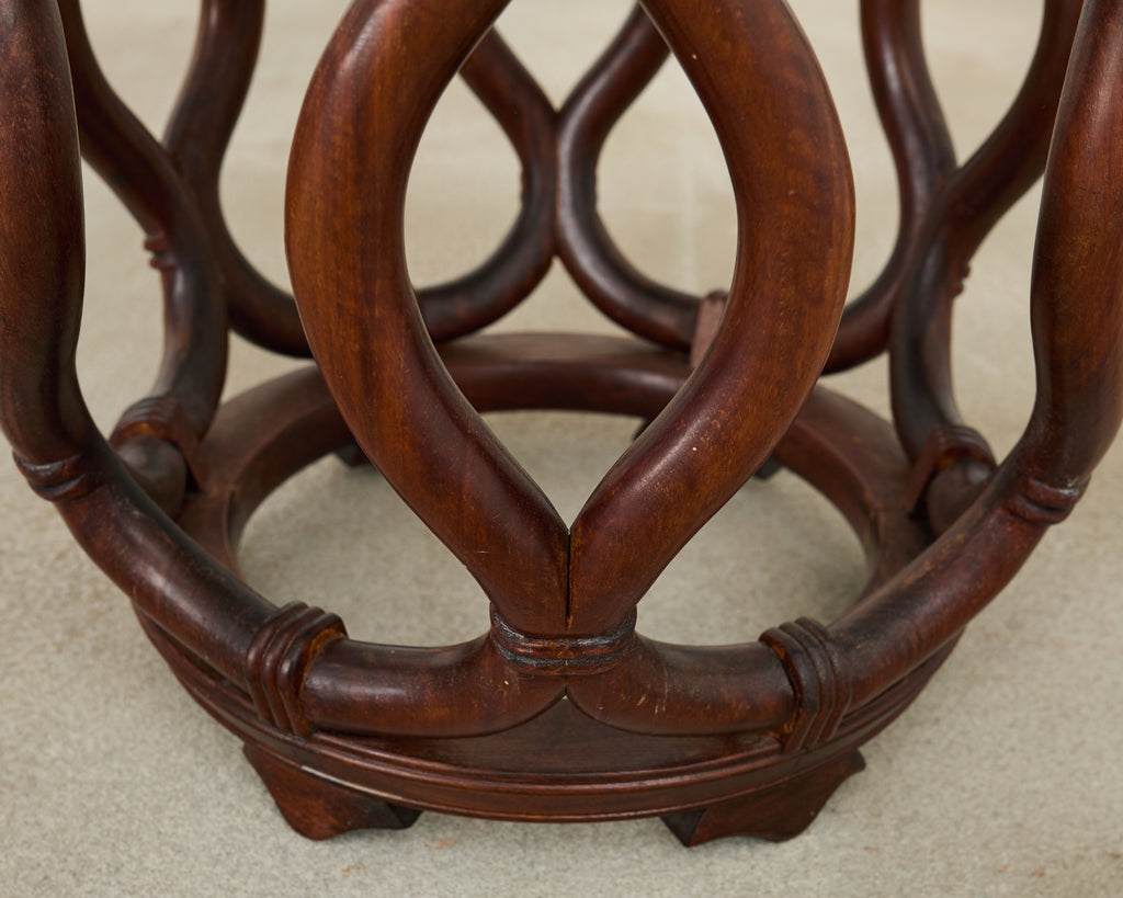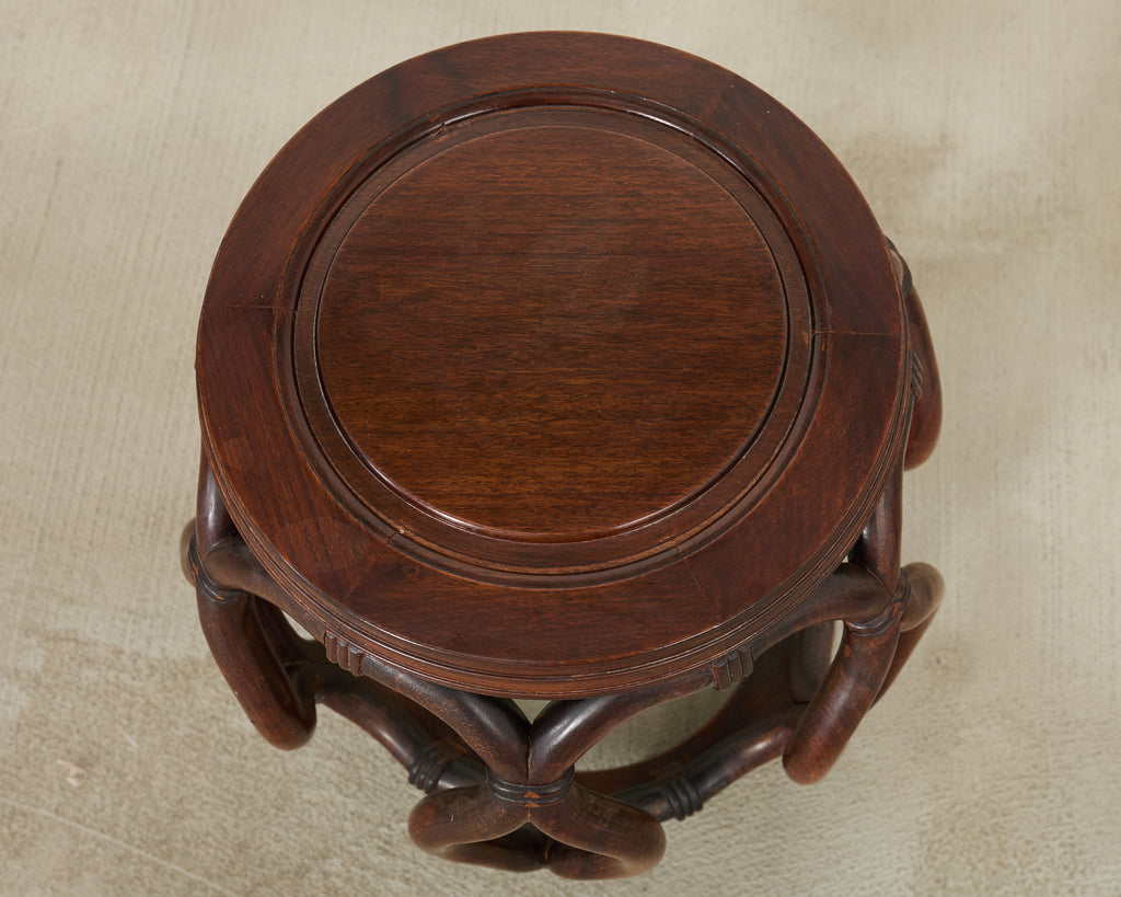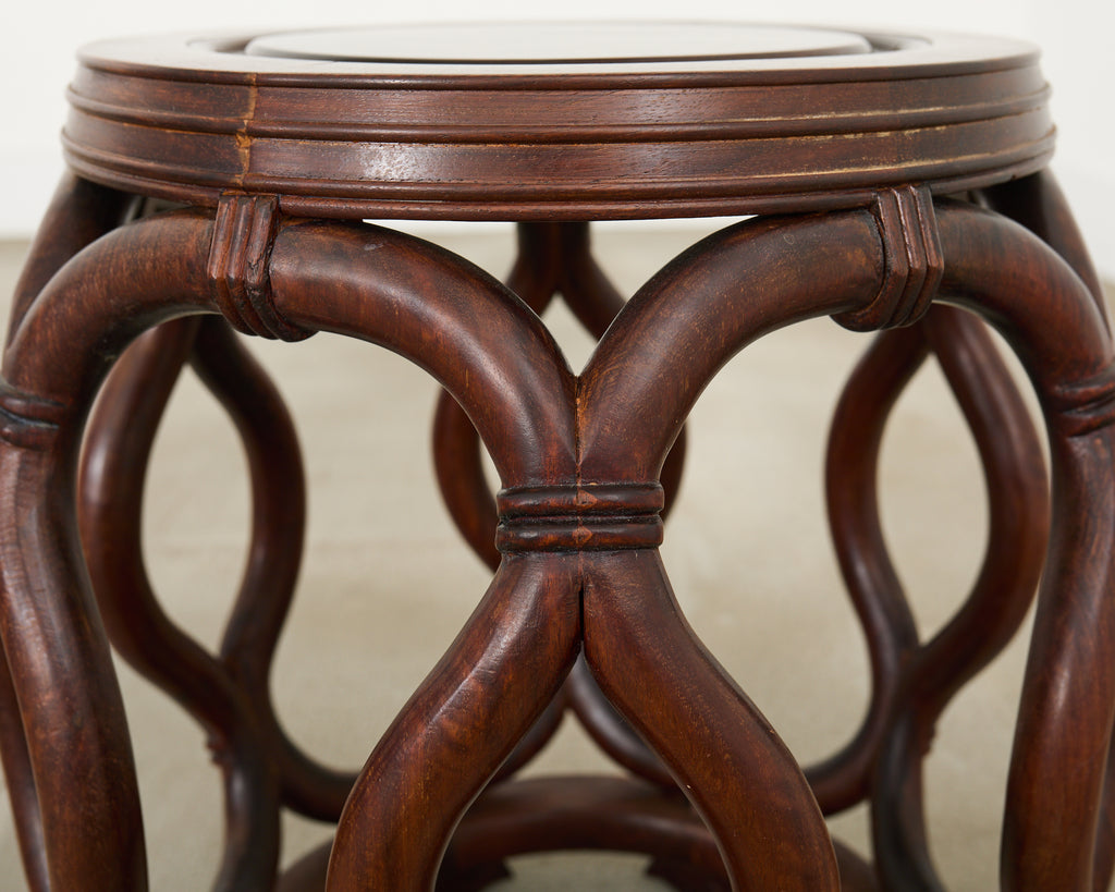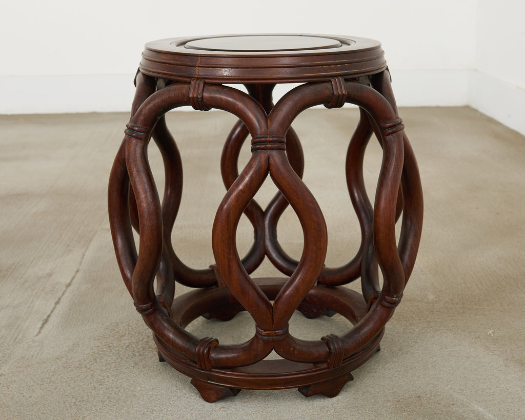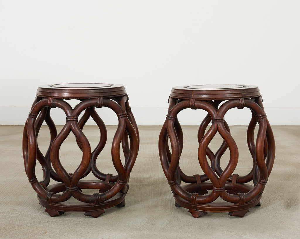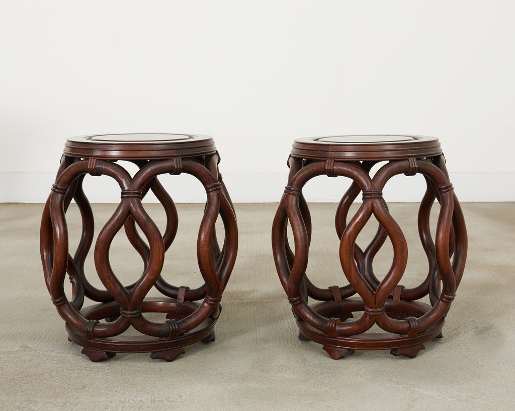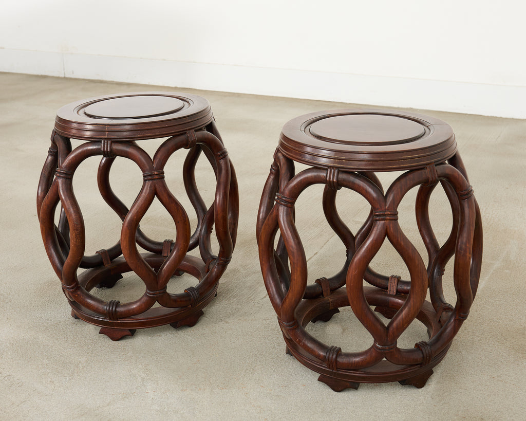 Distinctive pair of matching Chinese export garden drum stools or drinks tables made in the Qing style. Beautifully crafted from rich, dark rosewood with a drum, or tabouret form. The open lattice design showcases the curvilinear frame work with a faux-rope or rattan motif lashed together with faux-ties. The barrel shaped stools are very heavy and solid with excellent joinery and craftsmanship. The seams and joints on the stool are remarkably tight. Very good, well preserved condition. From an estate in San Francisco, CA.