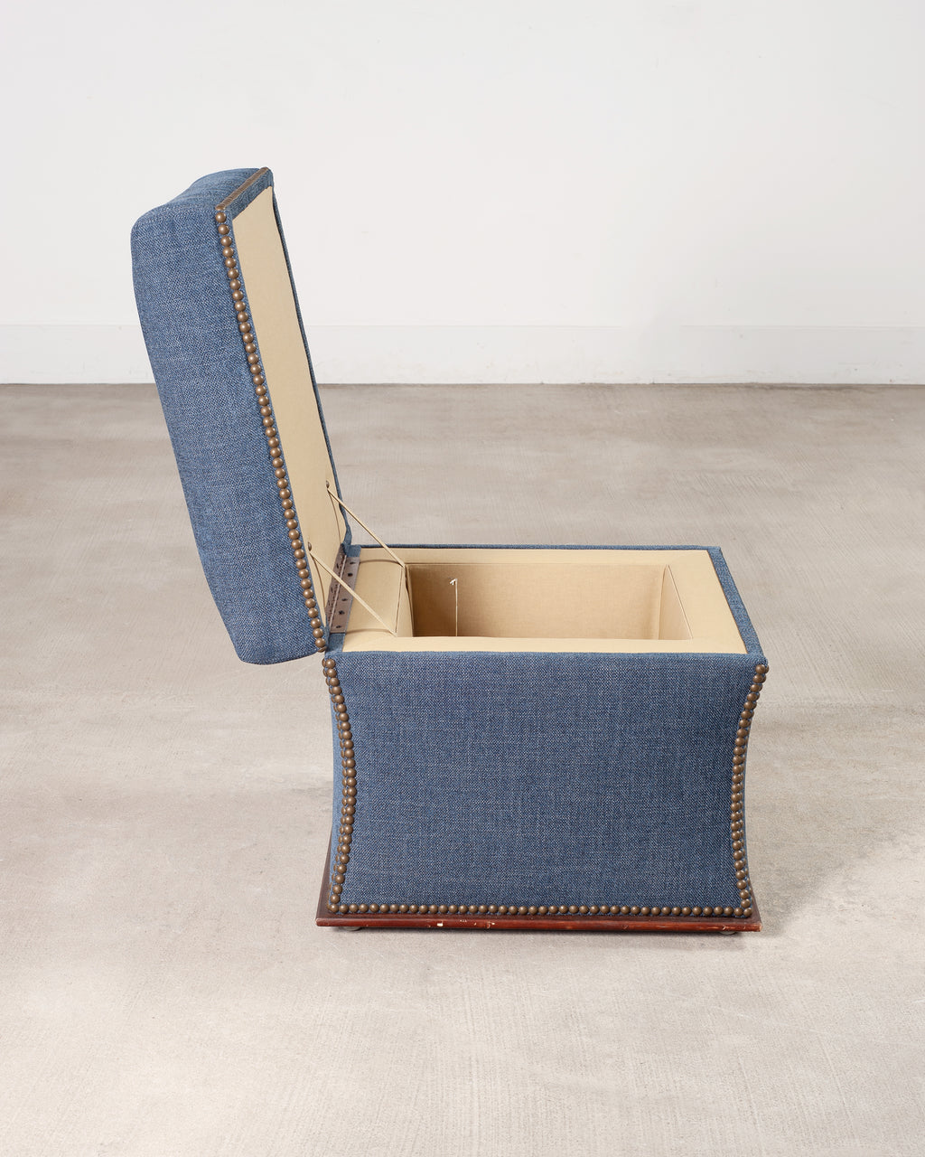A classic Ralph Lauren Home 'Florence' storage ottoman upholstered in a rich damask blue Italian Linen tailored with generous proportions and crisp upholstery. The waisted, sculpted form is defined by bold bronze-toned patinated nailhead trim that frames each side, resting on a dark stained molded mahogany plinth base having recessed brass casters. The hinged lift-top opens to a spacious, fully lined interior compartment finished in a tan upholstery, while dual strap stays support the lid, making it suitable for storage. A versatile, luxurious piece that allows for use as a ottoman, accent piece, or storage in traditional or coastal interiors. Ralph Lauren tag located inside the storage cavity. The case is heavy and solid with excellent joinery and construction. The condition is exceptional as seen in photos.