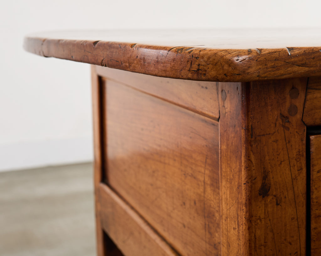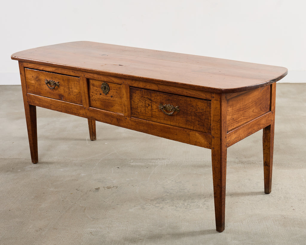 An imposing 19th Century Country French Provincial farmhouse console table, server, or work table measuring over 6 feet long in solid fruitwood. The case is substantial crafted from thick planks of radiant fruitwood. The elongated plank-built top features softly rounded ends with a modest overhang, and is fitted with three drawers, two full-sized with decorative bail pulls and a smaller central drawer with a original functional key escutcheon with working key. The backside is finished with framed panels. The legs are constructed in a simple tapered design with some Louis XVI influence, thick and sturdy for support. The richly developed rubbed patina features a deep amber color, and historic wear and tool marks add to the authentic character of the piece. The table is constructed in the rustic Country French Provincial style with a European farmhouse aesthetic. Versatile piece functional as a server, console table, sofa table, kitchen work table, bureau plat, or a rustic library table. From an estate in the Napa Valley, CA.