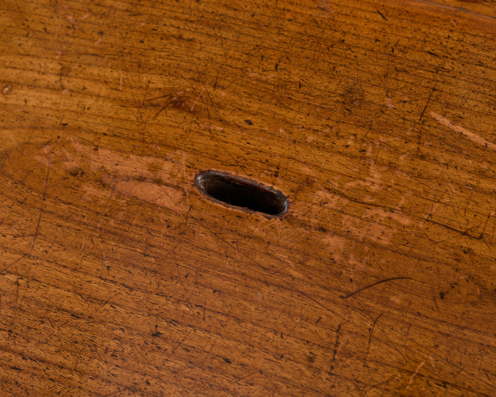 Condition: Good, wear consistent with age and use. Beautifully crafted with solid joinery and construction. Weathered, distressed patina with pronounced, desirable age wear as seen in photos. Scratches, scuffs, stains, minor dents, and marks throughout. Small hole from age separation on top.
