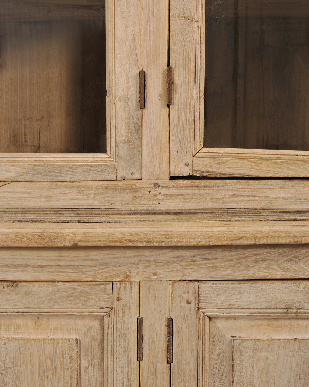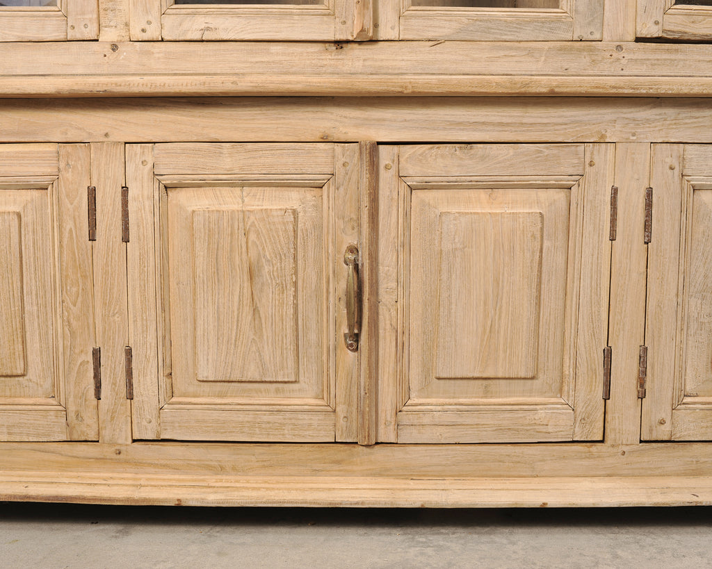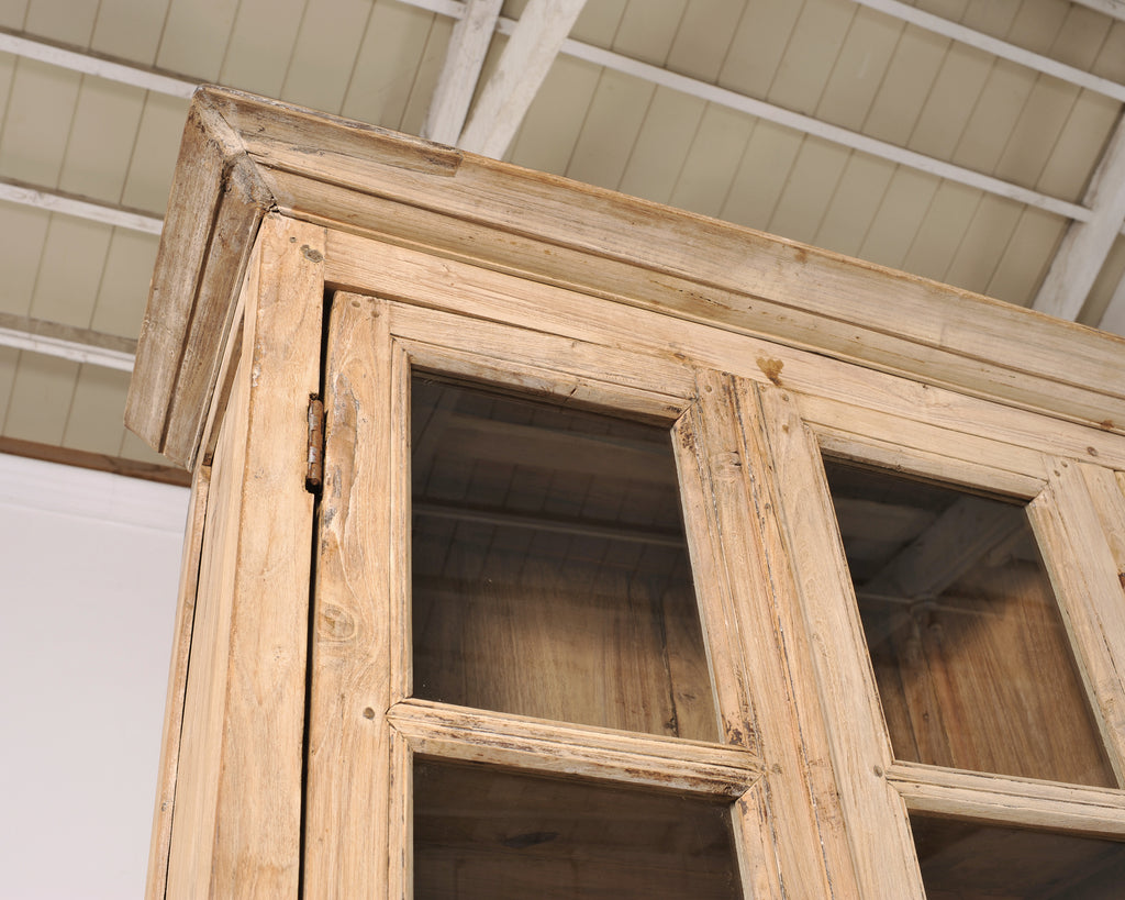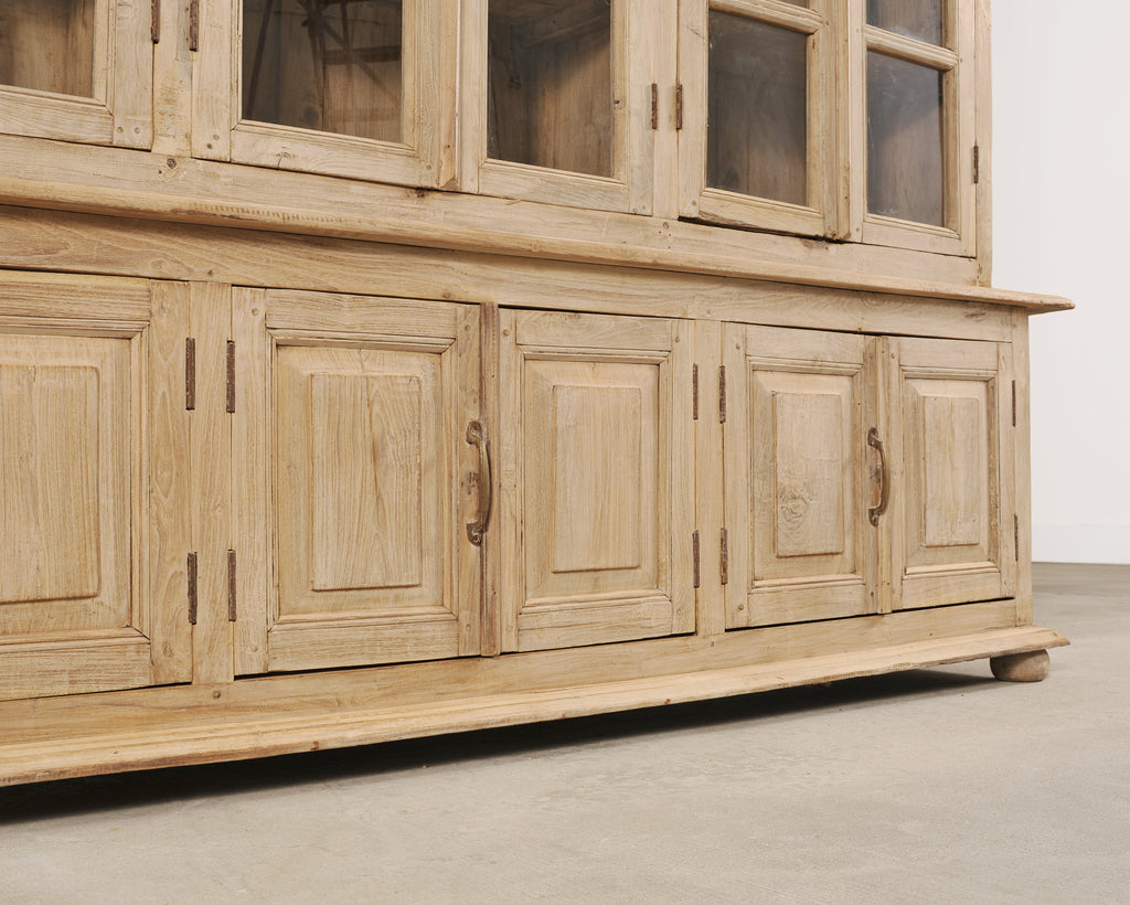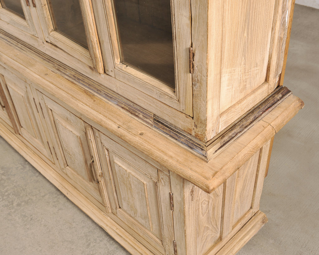 A monumental 19th century French Country-provincial style two-piece oak bibliotheque bookcase featuring a beautifully weathered bleached finish. The grand bookcase measures over 8 feet wide. The upper section is fitted with six tall astral-glazed glass doors each having five windows. The glazed doors open to plank storage shelves and is crowned by a simple projecting cornice. The lower case features eight paneled cupboard doors opening to storage and is raised by small turned bun feet. A broad thick molded ledge separates the upper and lower sections, adding depth to the piece. The cabinet is constructed from solid oak with a latter bleached patinated finish. The soft oak has a desirable weathered, and distressed pale wheat-toned finish exposing the natural oak woodgrains, knots, and variations, adding to the authentic character of the piece as seen in photos. The cabinet retains its original patinated aged brass hardware, including elongated pulls, lock plates, and door latches with some newer added hardware to the doors. The substantial piece blends French Provincial, Country, Rustic, and Farmhouse styles, and is functional as a bookcase, pantry, cabinet, cupboard, bibliotheque, or display cabinet. The base measures 26" tall. The case is sturdy with solid joinery and construction.