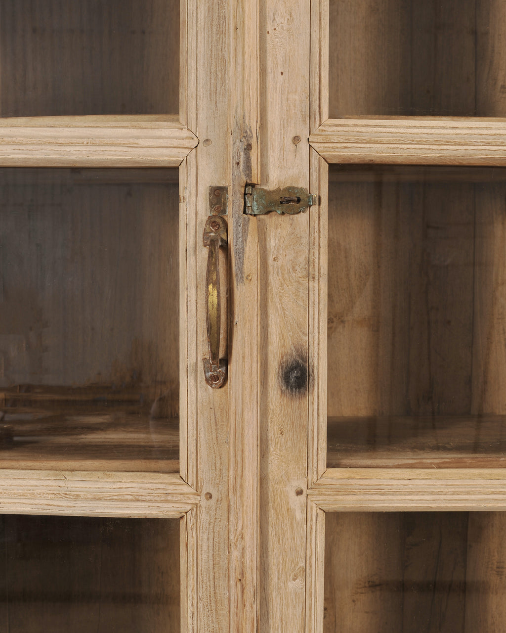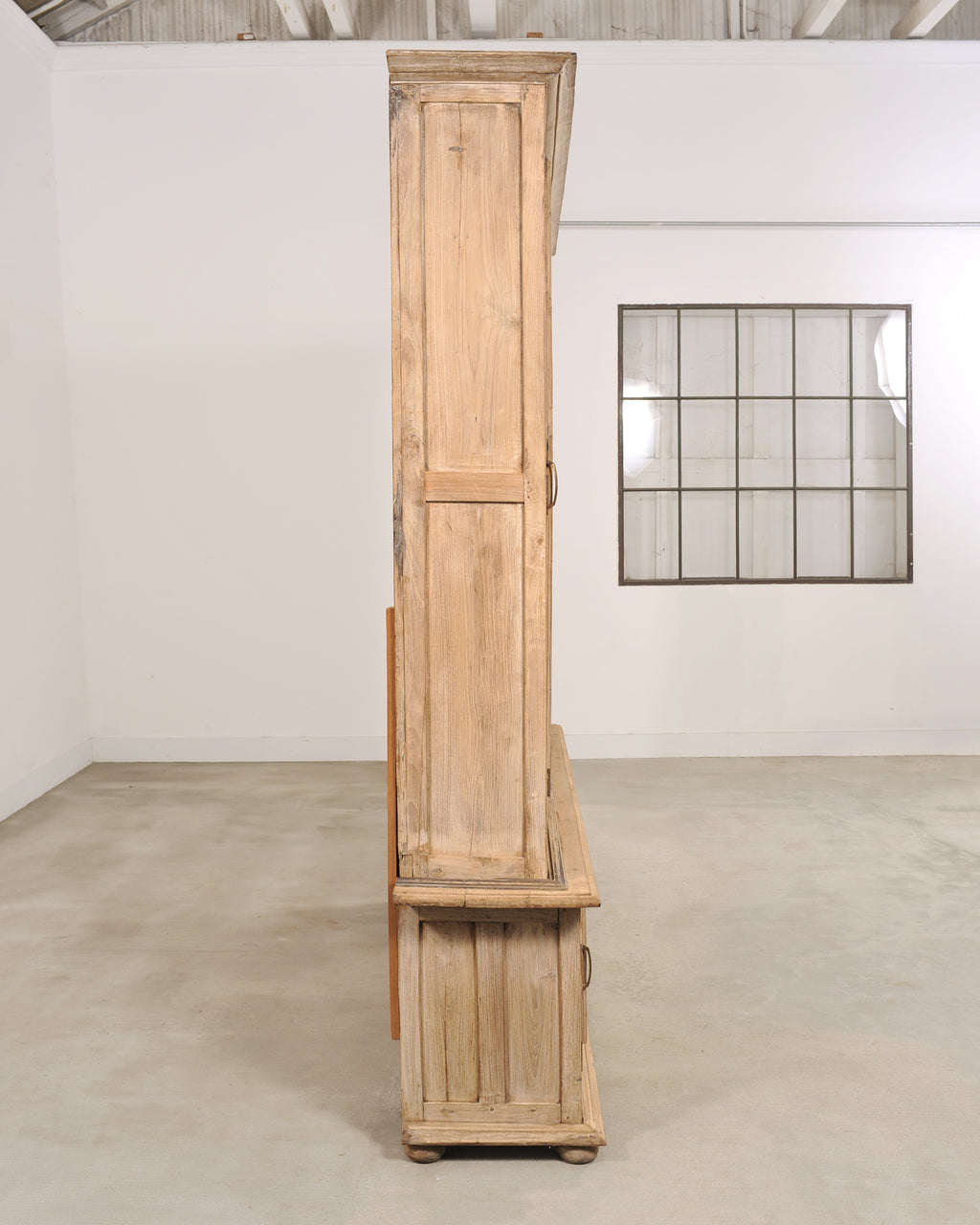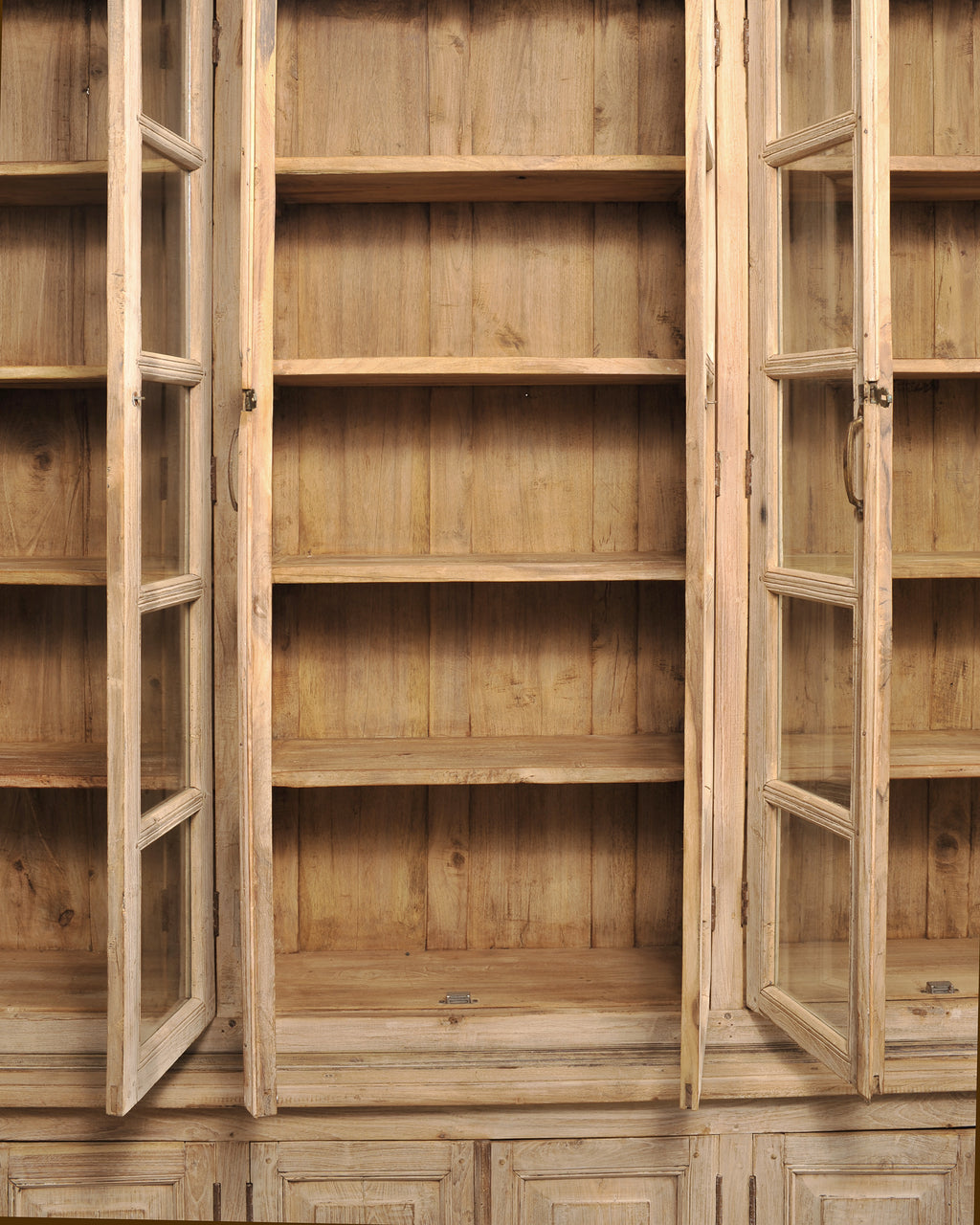 A monumental 19th century French Country-provincial style two-piece oak bibliotheque bookcase featuring a beautifully weathered bleached finish. The grand bookcase measures over 8 feet wide. The upper section is fitted with six tall astral-glazed glass doors each having five windows. The glazed doors open to plank storage shelves and is crowned by a simple projecting cornice. The lower case features eight paneled cupboard doors opening to storage and is raised by small turned bun feet. A broad thick molded ledge separates the upper and lower sections, adding depth to the piece. The cabinet is constructed from solid oak with a latter bleached patinated finish. The soft oak has a desirable weathered, and distressed pale wheat-toned finish exposing the natural oak woodgrains, knots, and variations, adding to the authentic character of the piece as seen in photos. The cabinet retains its original patinated aged brass hardware, including elongated pulls, lock plates, and door latches with some newer added hardware to the doors. The substantial piece blends French Provincial, Country, Rustic, and Farmhouse styles, and is functional as a bookcase, pantry, cabinet, cupboard, bibliotheque, or display cabinet. The base measures 26" tall. The case is sturdy with solid joinery and construction.