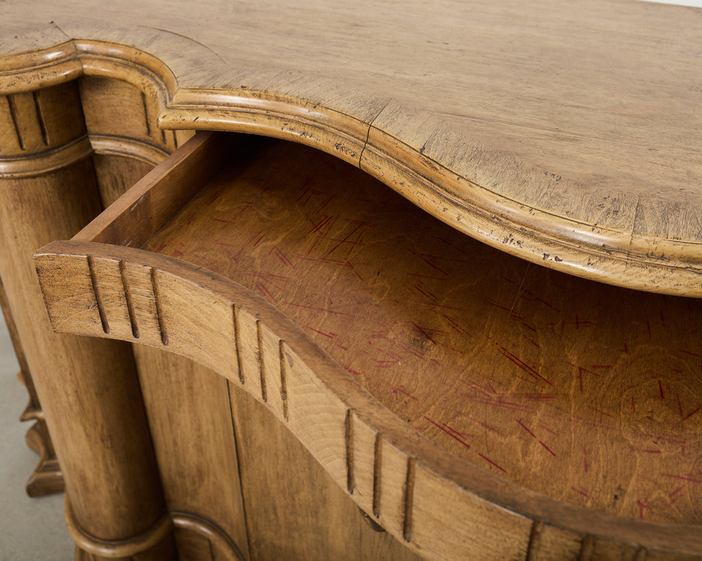 Character rich honey-toned oak sideboard or buffet by Holly Hunt for Therien studio workshop. Features a large serpentine case constructed from fine oak with rich woodgrains. The oak has a desirable distressed patina to mimic age on the finish. The base has a gently stooped plinth with carved linear details exemplifying European influence. Therien Studio Los Angeles, CA based atelier renowned for high-end bespoke pieces. Merging European styles with contemporary American execution, working with a famous roster of CA designers.