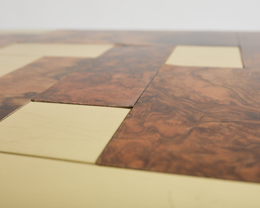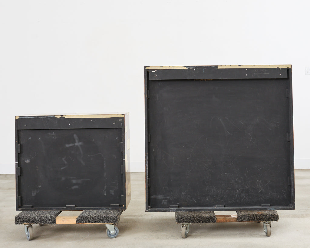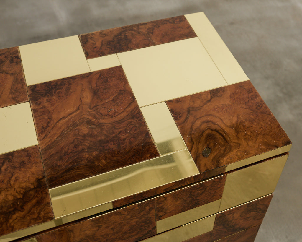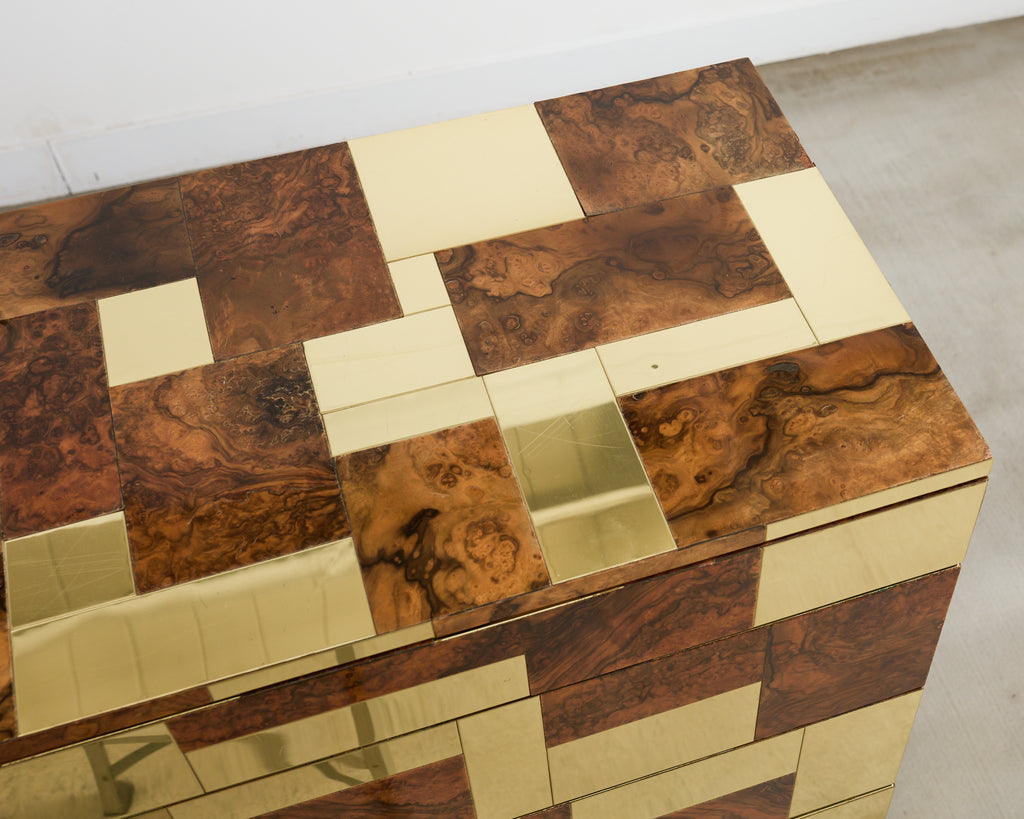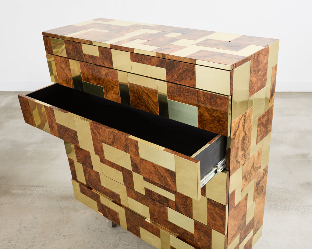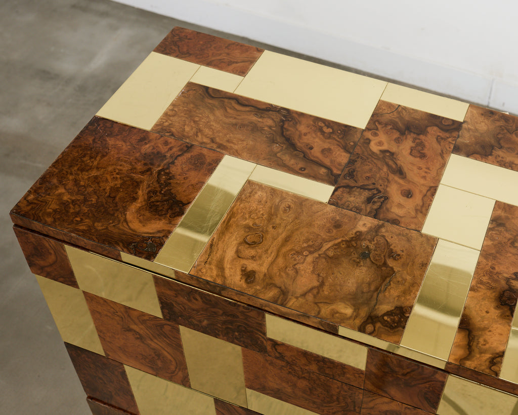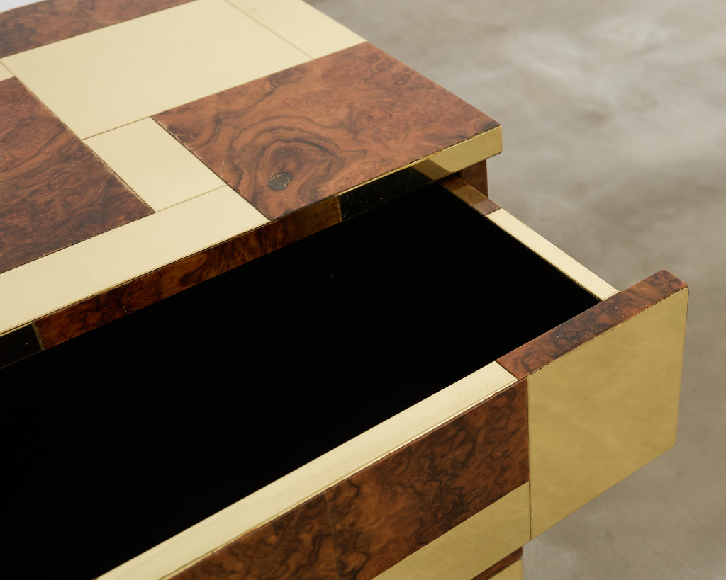 Rare signed pair of floating well mounted mid-century modern cabinets or chests of drawers designed by Paul Evans for Directional. The chests feature a fantastic mosaic tile veneer of brass and walnut burlwood design known as the Cityscape series. The matching cabinets are in two different sizes. The large cabinet measures 48 wide by 47 high and 17 inches deep. The smaller cabinet measures 36 wide by 31 high and 14.5 inches deep. The large cabinet has 7 drawers and the small has 6 drawers. Each cabinet is finished on the bottom with Paul Evans signature plaque. The cabinets have an aged patina with minor fading to commensurate age and use. From the original estate in San Francisco, California. Sold as a pair. Each cabinet has a mounting board on the rear for hanging on a wall.