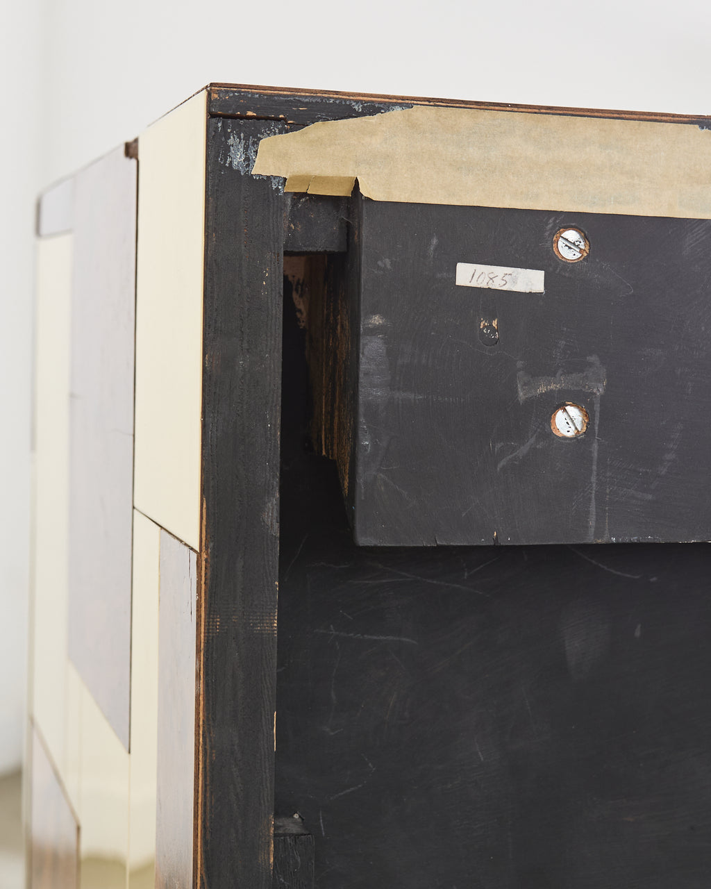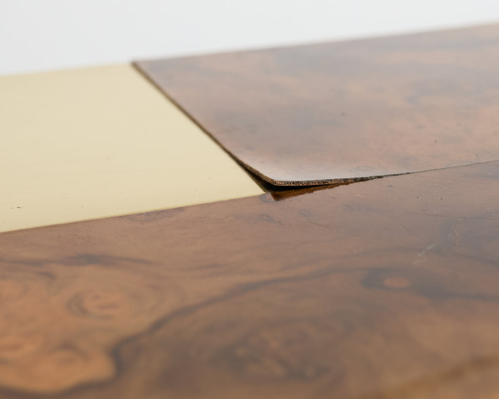 Condition: Good, wear consistent with age and use. Repaired: old repairs. Beautifully crafted with solid sturdy joinery and construction. Age appropriate wear and fading as seen in photos. Losses to burl, chips, scuffs, minor lifting and old repairs as expected. Bottoms of cabinets have visible scuffs as seen in photos.