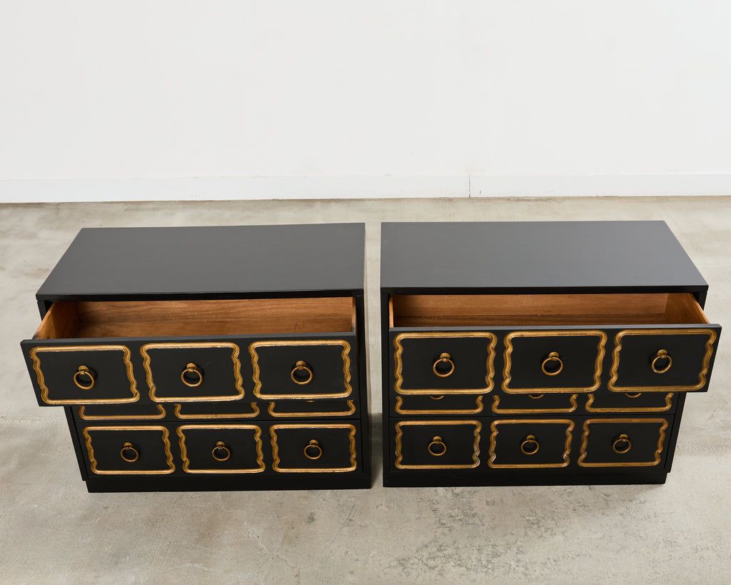 Rare and dramatic set of three matching lacquered España chest or bunching chests designed by Dorothy Draper. Mid-century chests of drawers made in the glamorous Hollywood Regency period. The iconic chests were featured in this trio format on the series "Sex in the City" in the Vogue editors office played by Candice Bergen in 1998. The chests appear to have an older restoration in the original black bean color with each drawer having triple scalloped squares and centered by gilt metal hardware. The finish has a desirable aged patina to commensurate age and use. The hardware has an aged gilt finish that complements the design. Sold as a set of three. From an estate in San Francisco, CA.