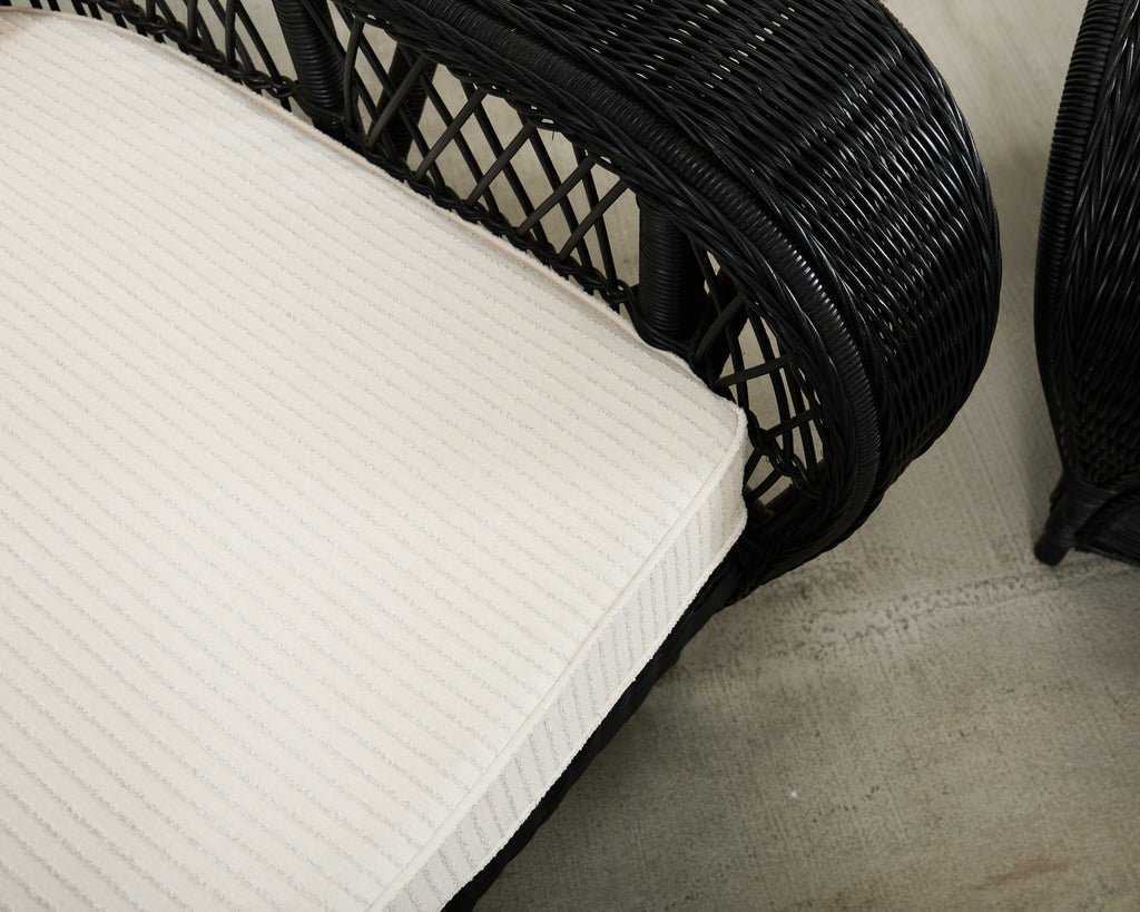 Dramatic pair of ebonized wicker garden lounge armchairs designed by Ralph Lauren. These rare chairs feature an oversized rattan frame embellished with woven wicker. The gracefully curved frames have thick cobra style for backs and wide arms measuring 25 inches high. The generous seat is 29 inches deep and has a curved waterfall front. Impressive size and scale with solid, sturdy joinery and craftsmanship. The chairs are in exceptional condition with makers marks on the seats. Newly upholstered in a beige linen style striped fabric.