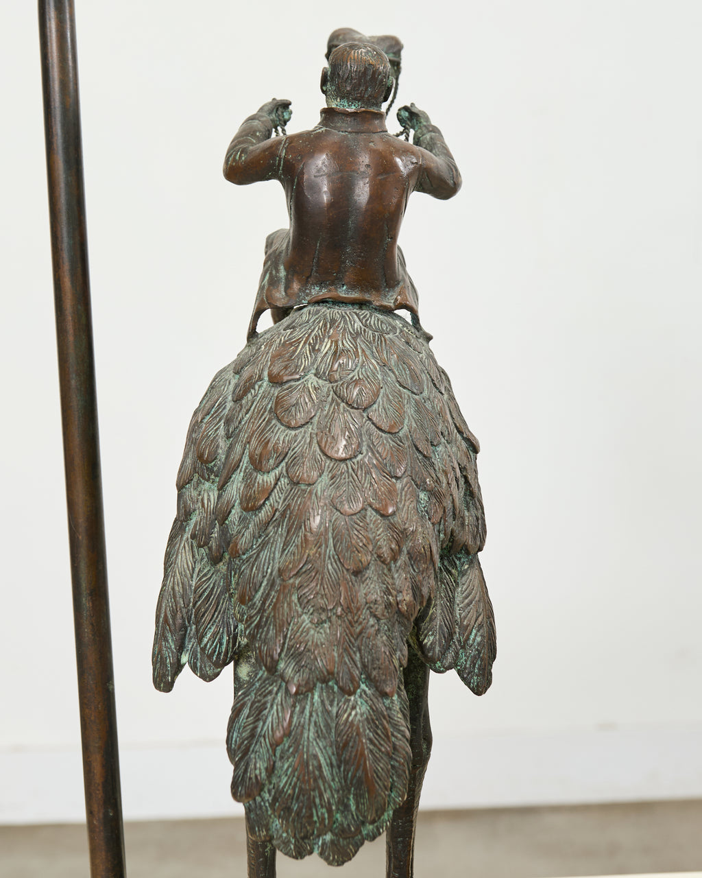 Rare and whimsical pair of patinated bronze table lamps by Maitland-Smith depicting a monkey jockey riding a large ostrich. The bronzes are mounted to a dark tessellated stone plinth that is thick and round. The lamps are very heavy and solid with a desirable aged patina on the bronze having verdigris. The shades are supported by bronze columns ending with round bronze finials. Maitland-Smith labels on bottoms. Sold as a pair. From an estate in Rancho Palos Verdes, California. Shades are 17"d x 12.5"h.