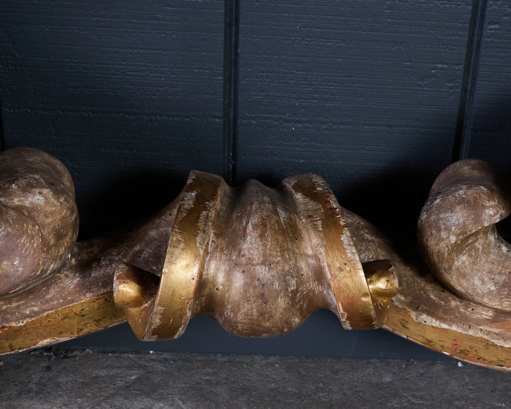 Opulent baroque style console table featuring a honed French limestone top designed by Dennis and Leen Hollywood, CA. The dramatic table measures over 6 feet long. The thick French limestone top has a gracefully scalloped, or serpentine form with a thick gilt wood conforming ogee edge. The top is supported by an elegant base crafted from large scrolls of hand-carved beech wood. The wood has an intentionally heavily distressed patina on the warm gold leaf and painted finish providing a contrast to the smooth limestone top. Solid and heavy crafted in the romantic California style with an amazing profile, scale, and presence. Located in California ready to ship and install. From an estate in San Francisco, CA.