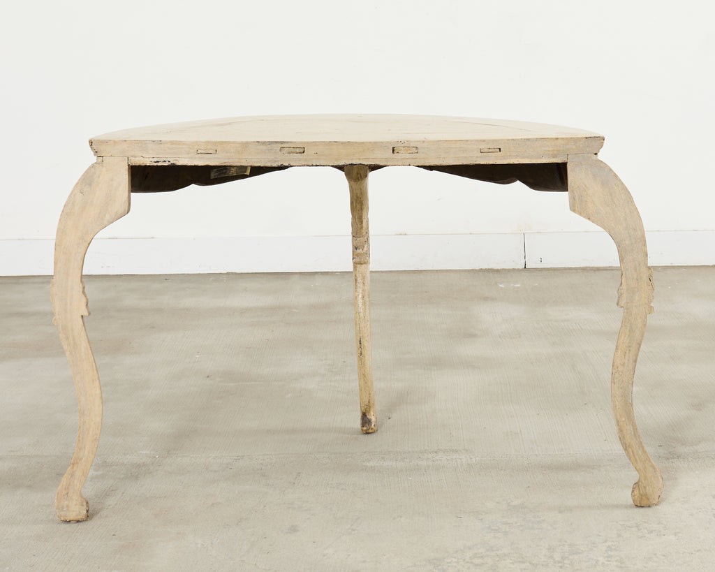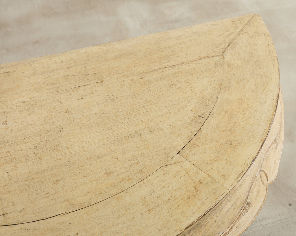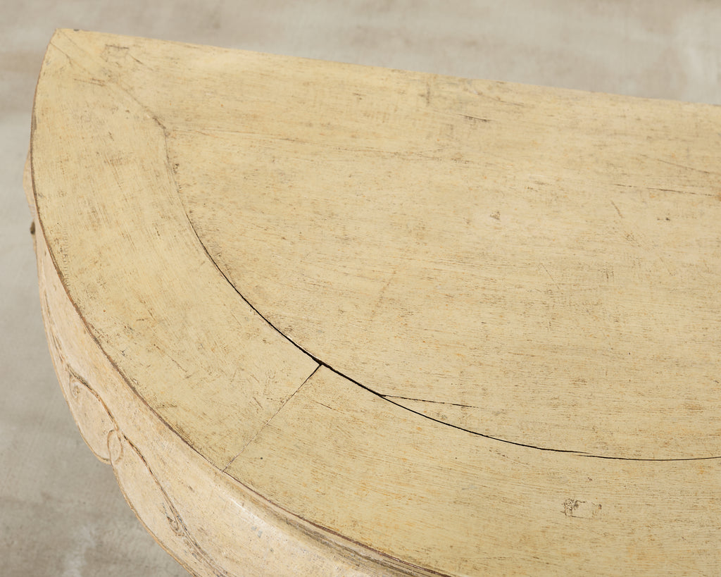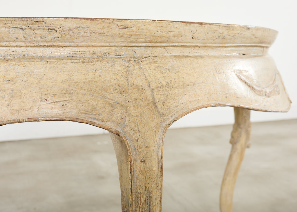 20th century weathered demilune console table or sofa table featuring an intentionally distressed faux painted finish crafted from hardwood with gracefully scalloped aprons and supported by curved cabriole style legs. The table is sturdy and solid having a weathered patina on the finish to mimic age on the carved wood. From an estate in San Francisco, CA. The legs appear to be decorated with dragon motifs in the Asian aesthetic. The apron measures 26 inches from the floor.