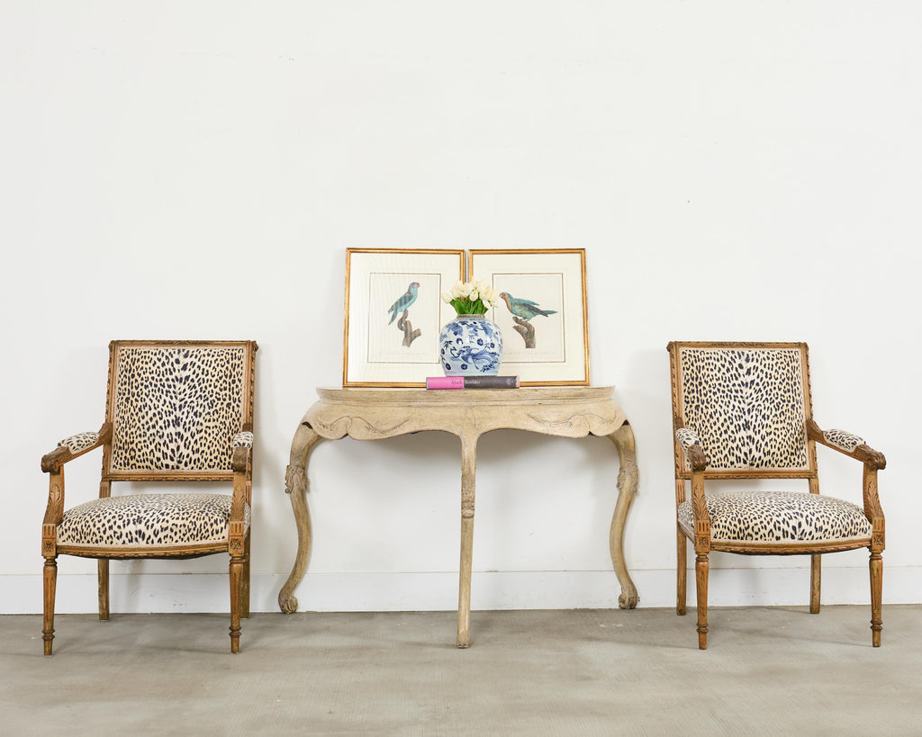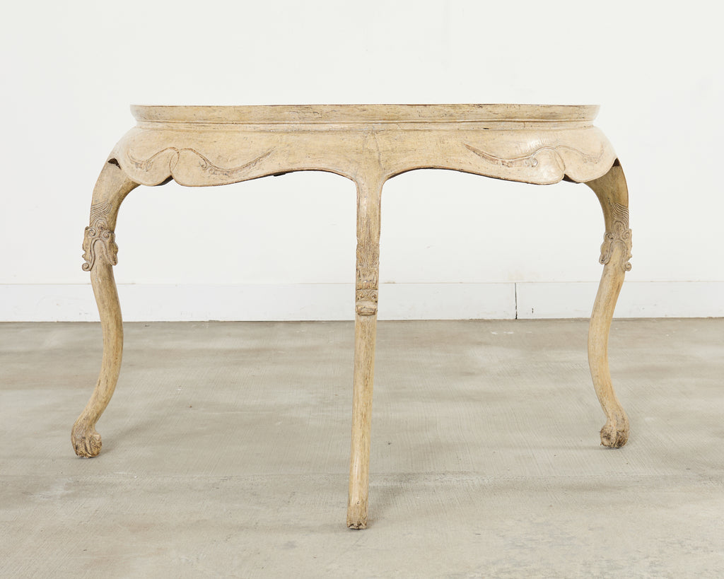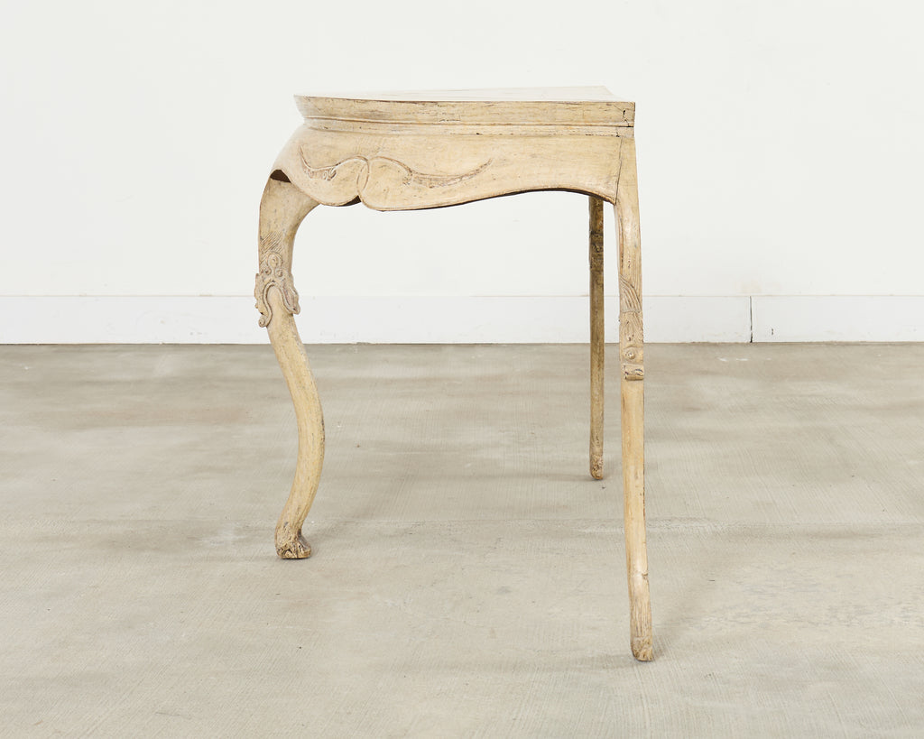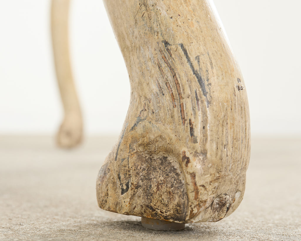 20th century weathered demilune console table or sofa table featuring an intentionally distressed faux painted finish crafted from hardwood with gracefully scalloped aprons and supported by curved cabriole style legs. The table is sturdy and solid having a weathered patina on the finish to mimic age on the carved wood. From an estate in San Francisco, CA. The legs appear to be decorated with dragon motifs in the Asian aesthetic. The apron measures 26 inches from the floor.