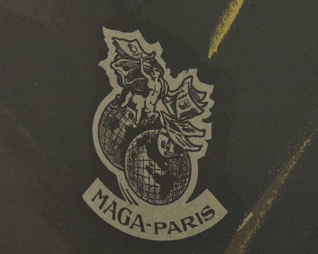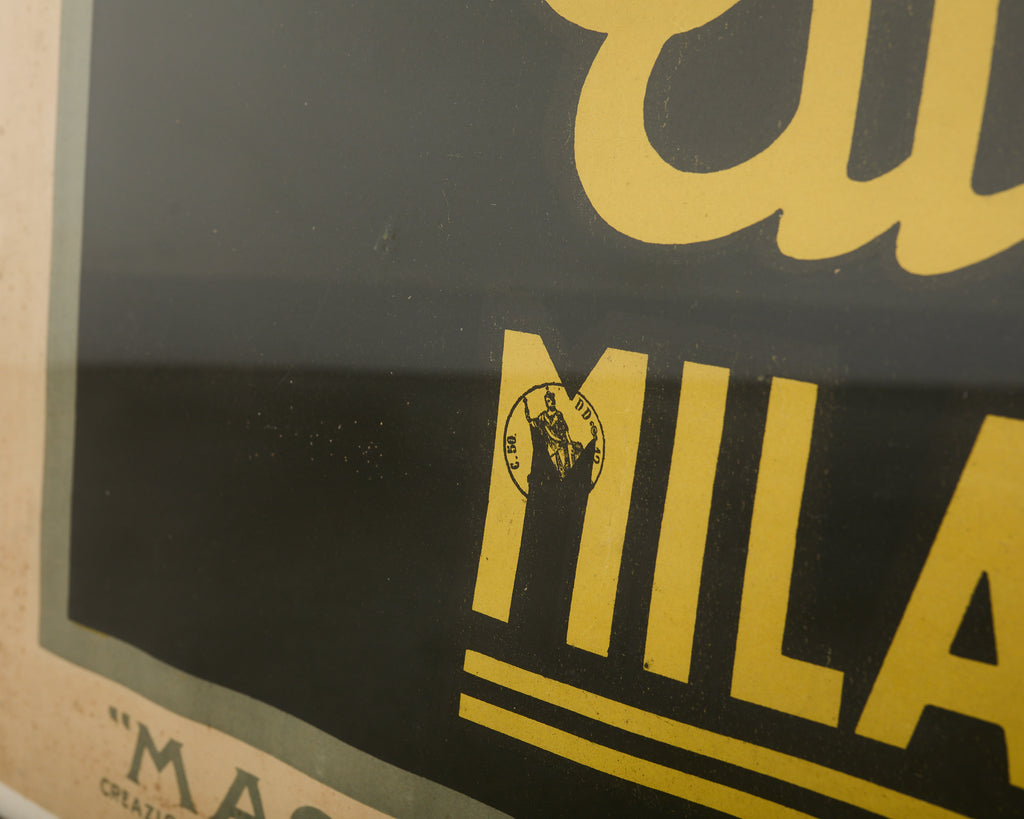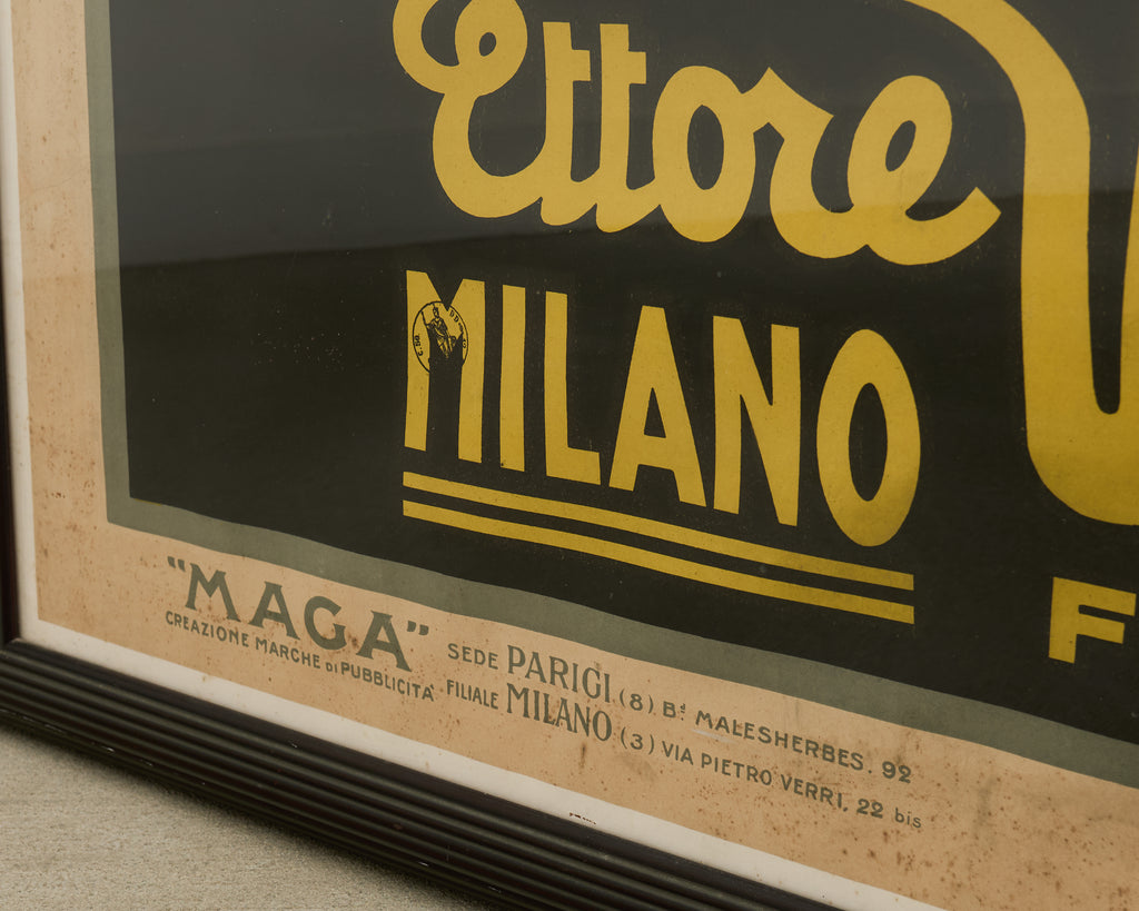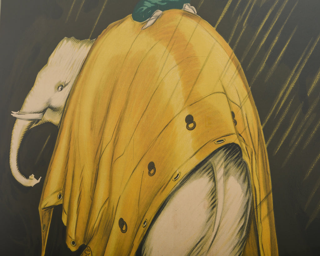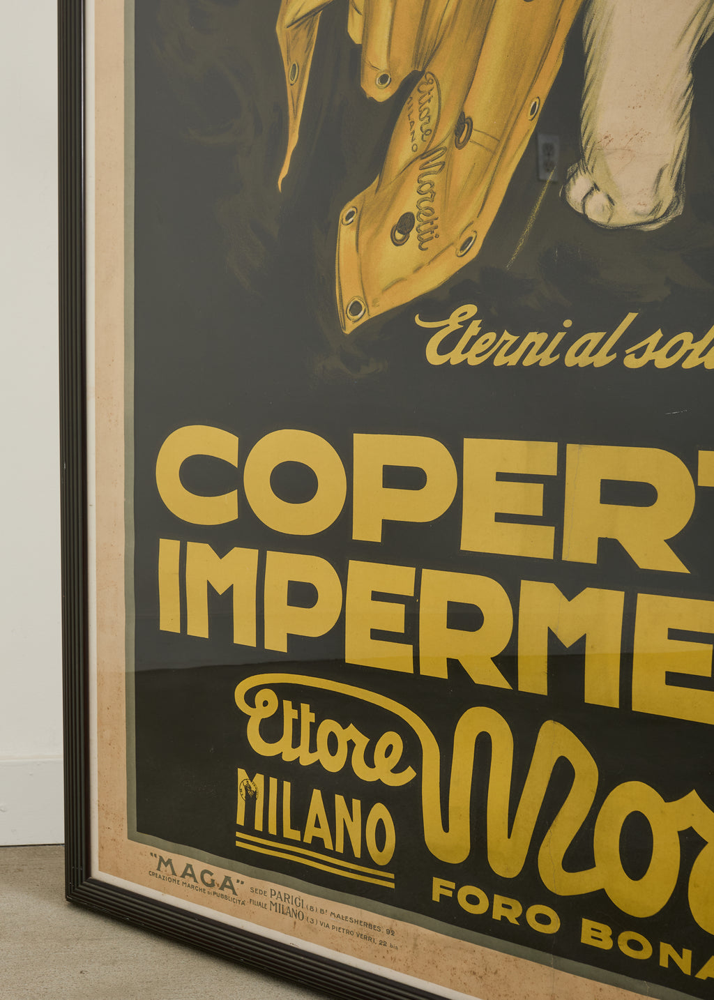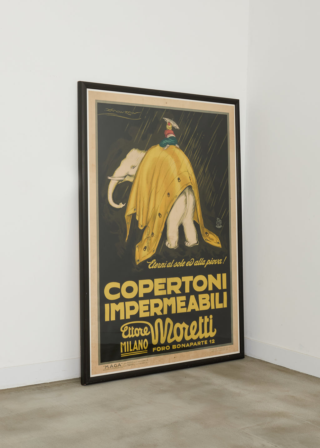 Fantastic large early 20th century commercial advertising poster for Moretti waterproof products designed by artist Achille Luciano Mauzan (Italian 1883-1952). Lithograph poster titled "Copertoni Impermeabili Ettore Moretti" made in the Art Deco period, circa 1921. The grand poster features a large white elephant covered with a yellow raincoat having a small child riding on its back. The whimsical ad features bold yellow colors over a dramatic black ground. Signed MAGA an Italian studio known for illustrations on the bottom with a stamp in the middle. Provenance: From the collection of Christian Neilsen, owner of Axion Designs (XN Designs) best known for introducing Modern Italian Furniture to San Francisco, California.