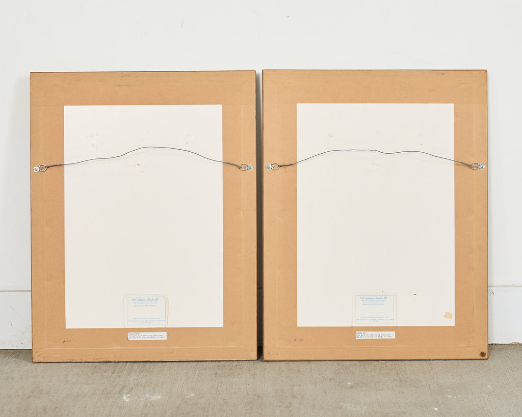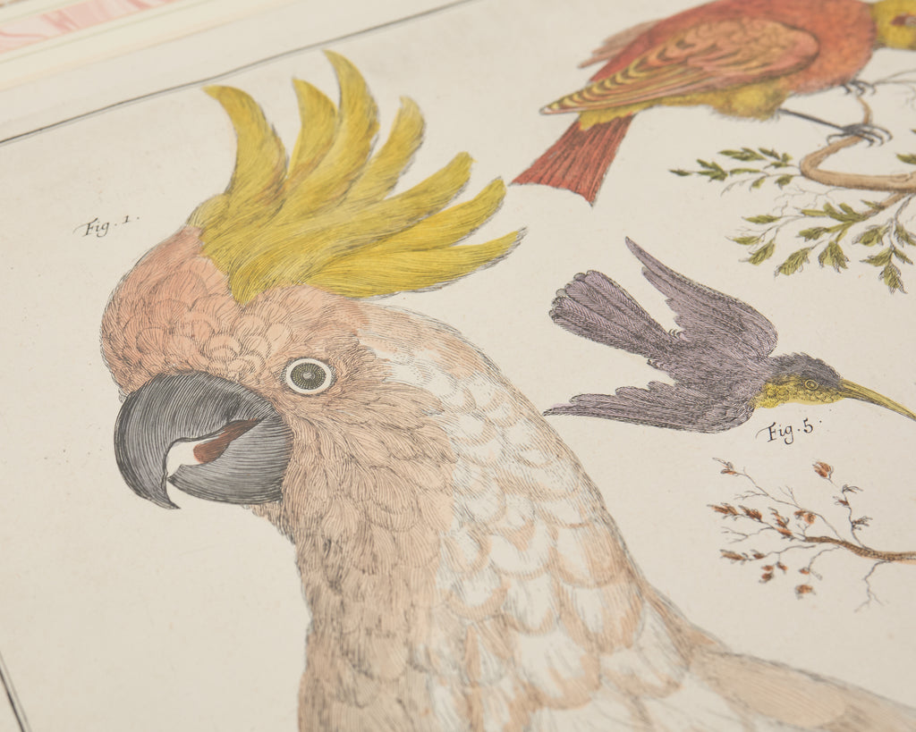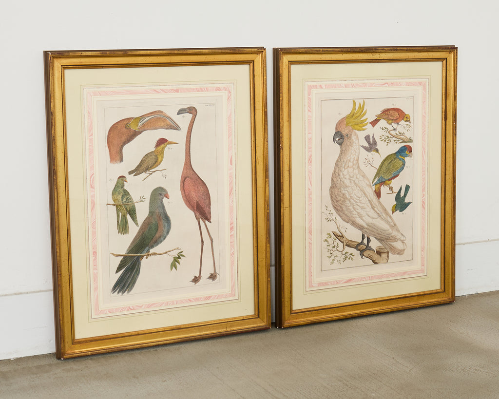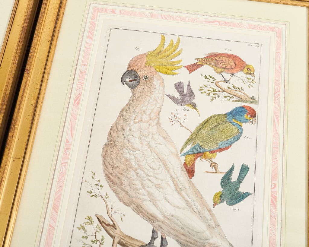 Exceptional pair of 18th century hand-colored engraving prints by Albertus Seba (Dutch 1665-1736). Each featuring woven paper mounted in gilt wood frames behind museum grade acrylic. The prints feature vibrant color with age appropriate wear, minor toning, fading, and foxing. First plate features cockatoo and parrots. Second plate features flamingo and kingfisher. Site measures 11.5 wide by 18 inches high. From an estate in San Francisco, California.