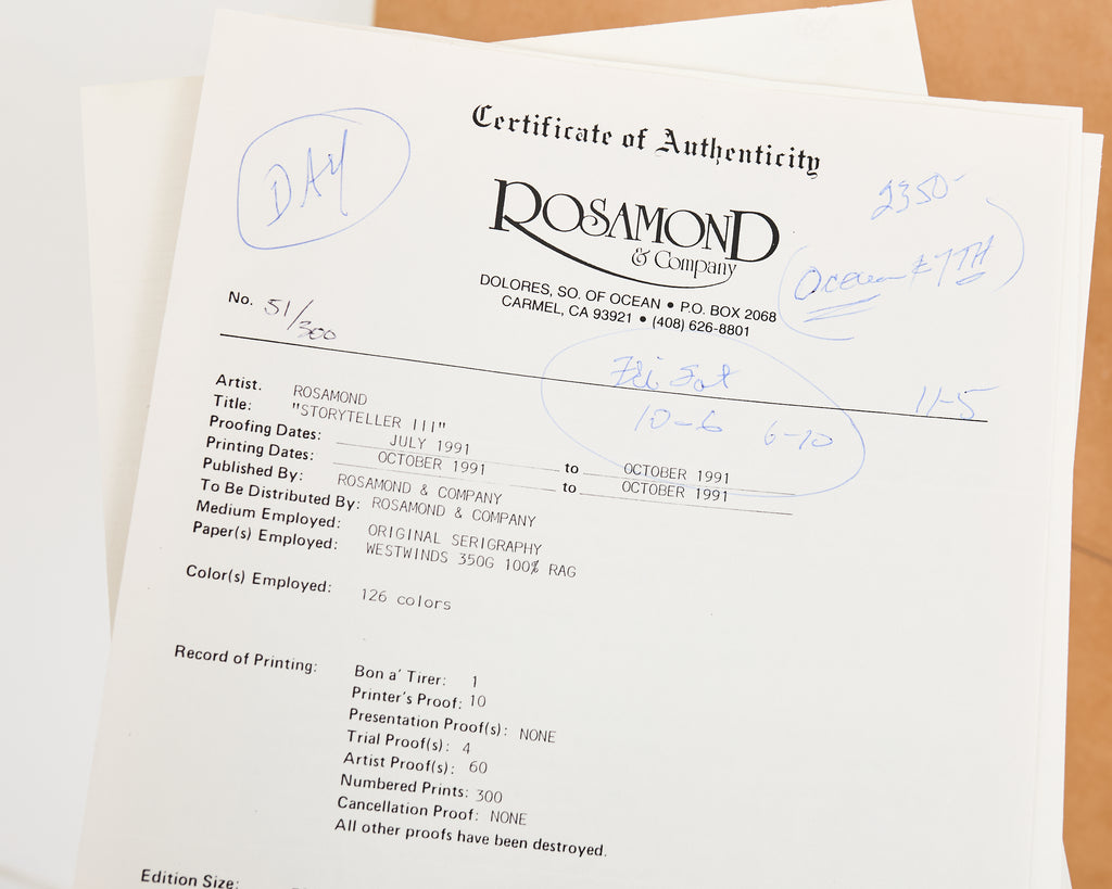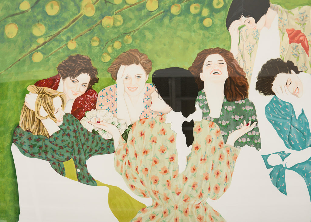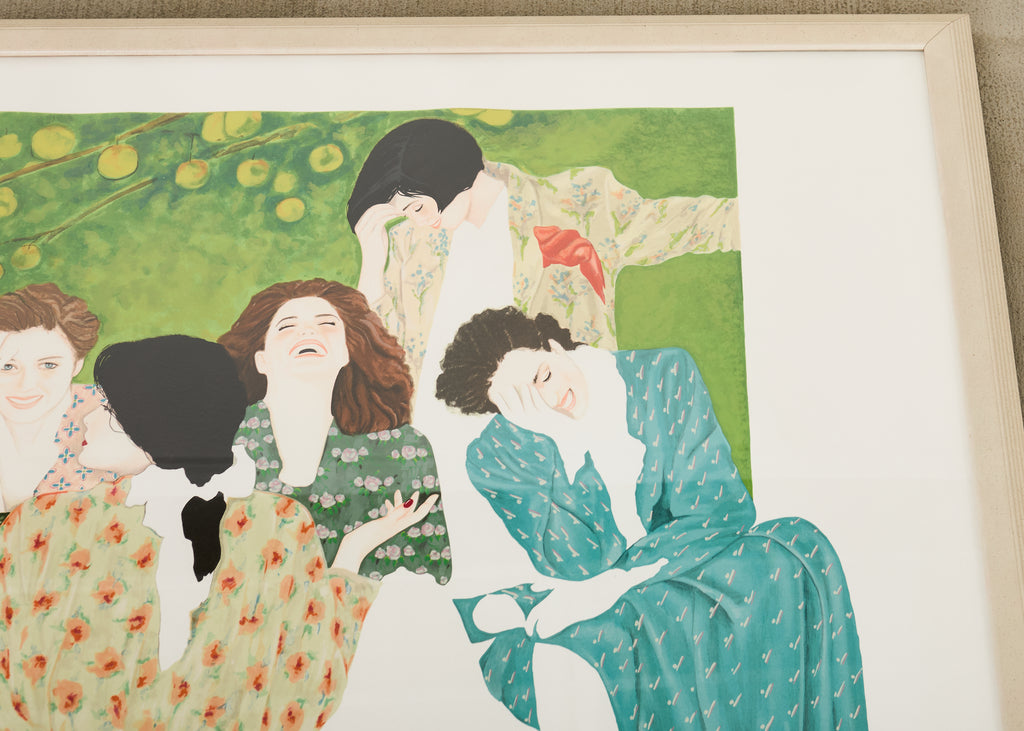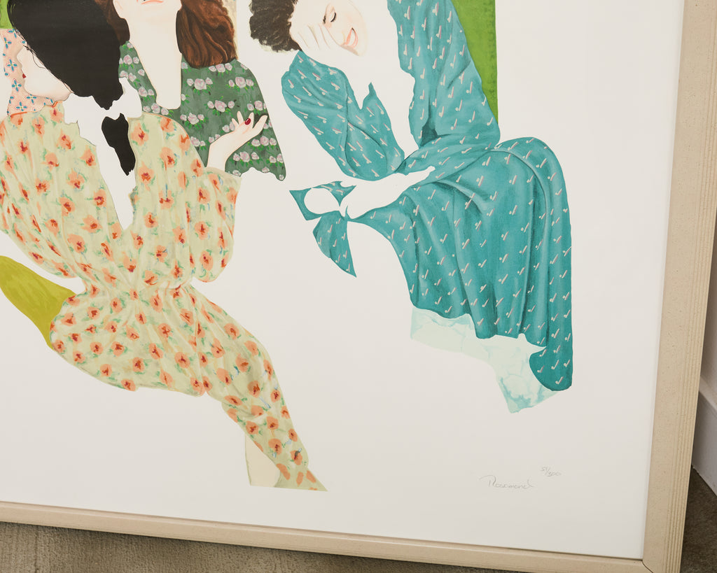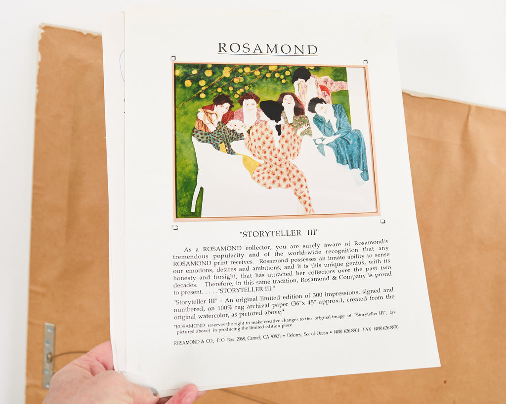 Large signed and numbered lithograph by Christine Rosamond (United States, 1947-1994), "Storyteller III" circa 1991, depicting 7 women engaged in spirited conversation with vivid, bold colors and patterns. The artist Rosamond known for her use of negative space on her works and the predominance of women in her pictures. Watercolor on archival paper set in a painted frame behind protective plexiglass. From a gallery in Carmel, California. #51/300 in series. Includes C.O.A. and the original paperwork. From an estate in San Francisco, California.