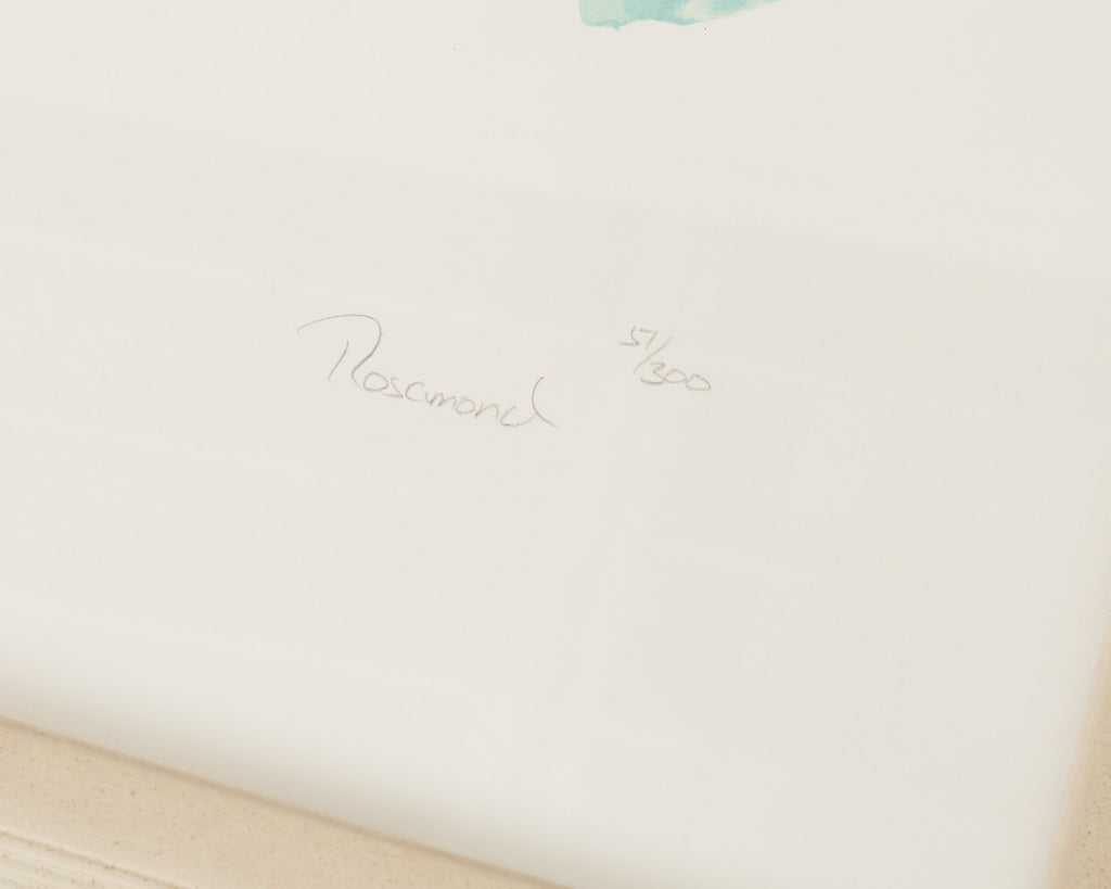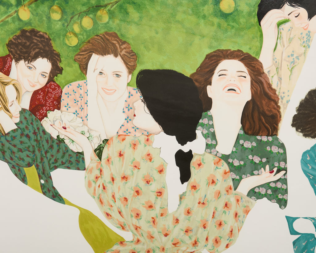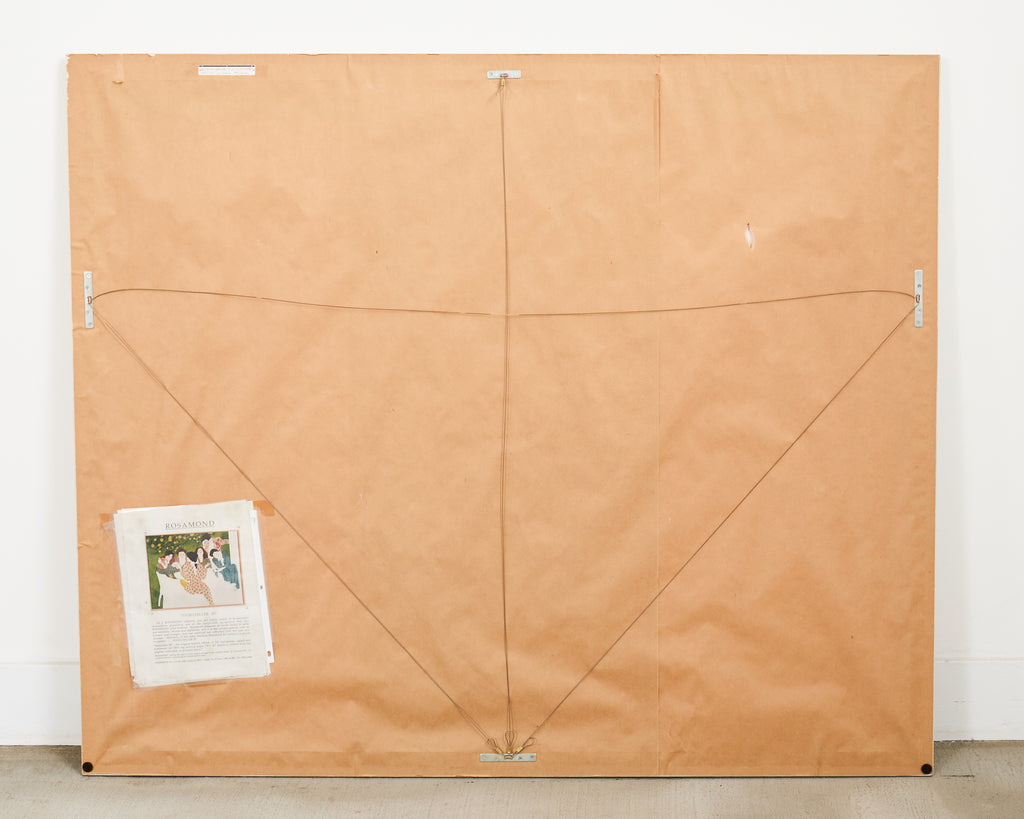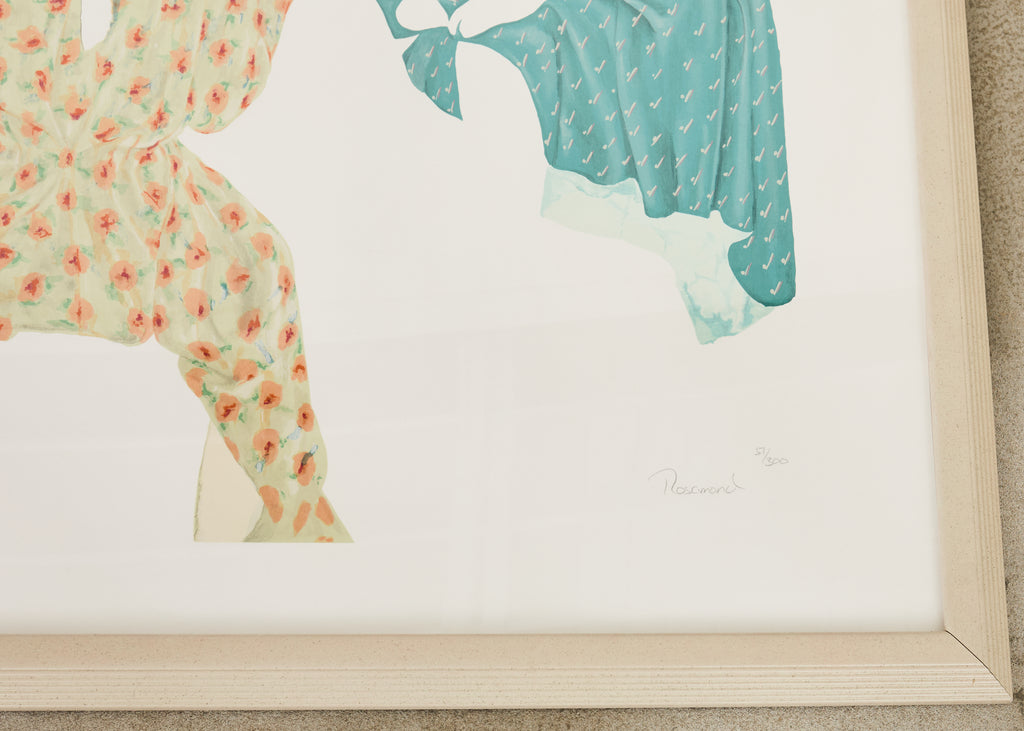Large signed and numbered lithograph by Christine Rosamond (United States, 1947-1994), "Storyteller III" circa 1991, depicting 7 women engaged in spirited conversation with vivid, bold colors and patterns. The artist Rosamond known for her use of negative space on her works and the predominance of women in her pictures. Watercolor on archival paper set in a painted frame behind protective plexiglass. From a gallery in Carmel, California. #51/300 in series. Includes C.O.A. and the original paperwork. From an estate in San Francisco, California.