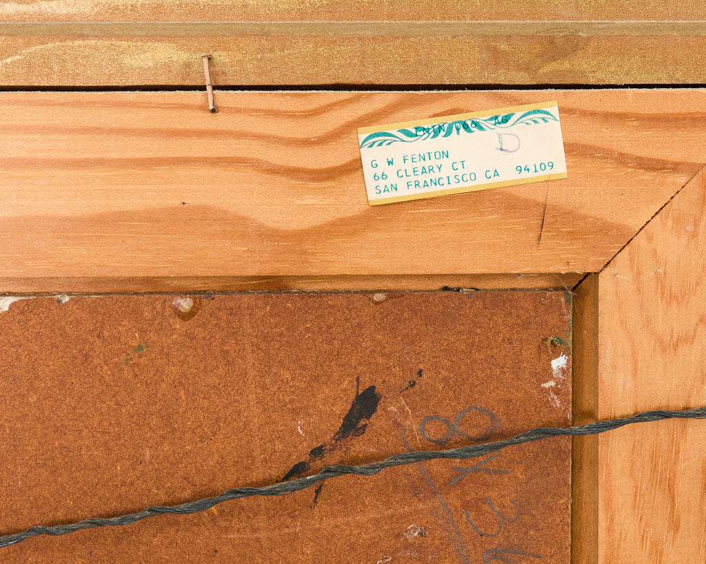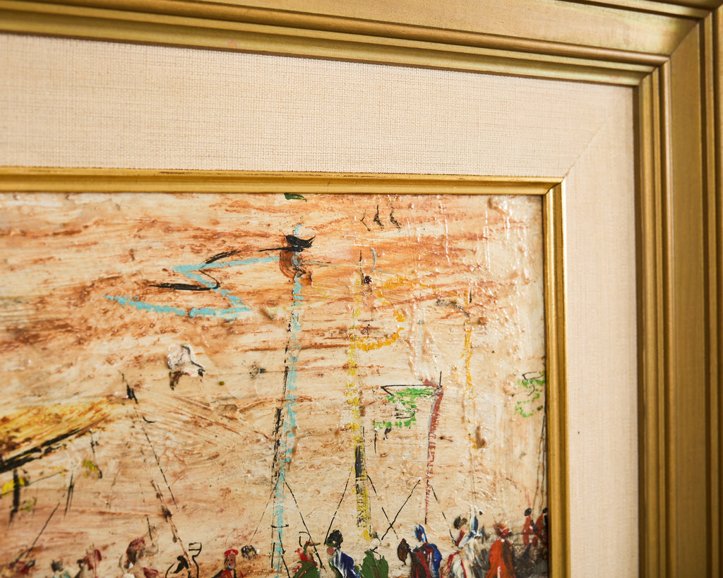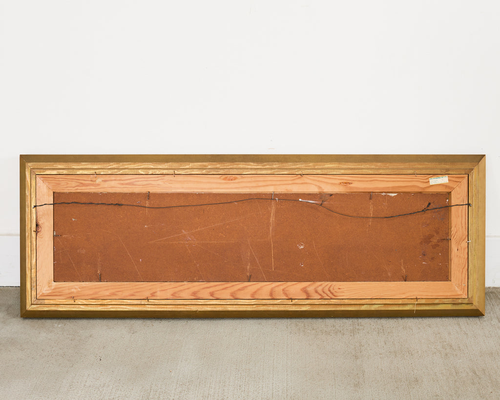 Interesting long mid-century modern oil on masonite board painting depicting an impressionist style panorama landscape with figures. The busy, intricate scene is typical of his style of painting street scenes and crowds. Vibrant and bold colors set in a matte gilt wood frame with a cream linen border. The sight measures 7.5 inches high by 35.5 inches long. Signed by the artist on bottom center. From an estate in San Francisco, California.