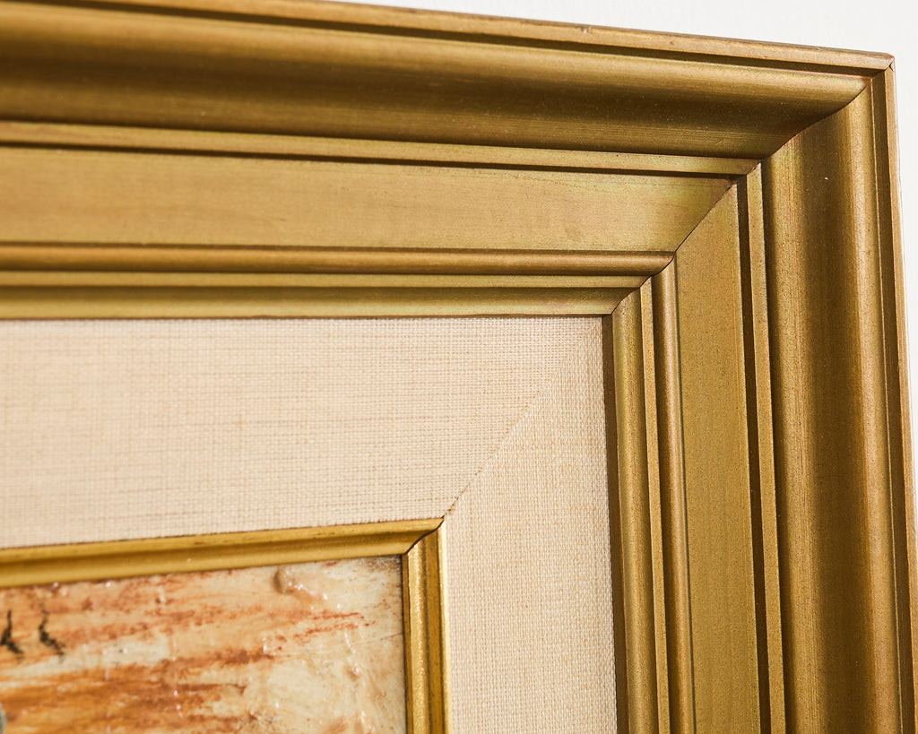 Condition: Good, wear consistent with age and use. Beautifully crafted with solid joinery and construction. Aged, faded patina to gilt wood finish on frame as seen in photos. Minor scuffs on frame.