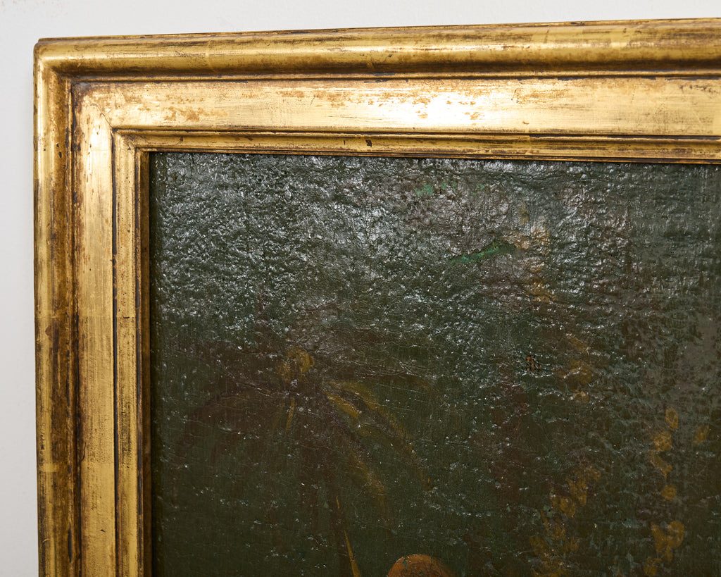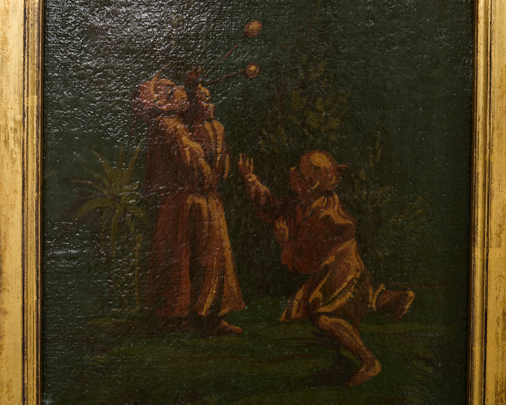 Condition: Good, wear consistent with age and use. Beautifully crafted with solid joinery and construction. Intentionally distressed patina on the finish to mimic age as seen in photos. Age appropriate wear with chips, scuffs, scratches, and losses on frame. The paintings have thick, textured patina.