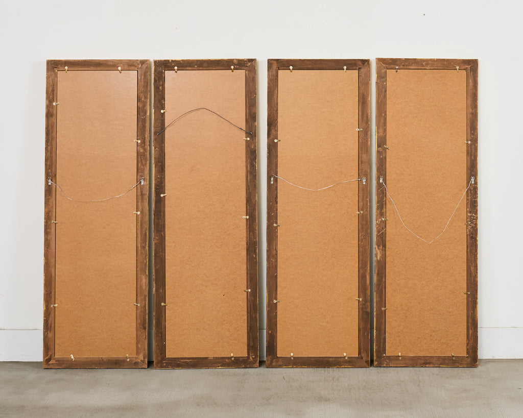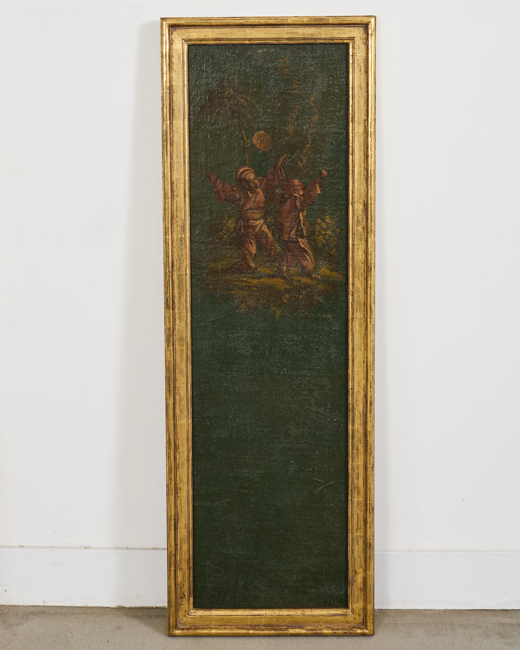 Opulent set of four framed painted panels in the Chinoiserie revival style. Framed oil on masonite board paintings mounted in distressed gold leaf wood frames. Each panel features a whimsical Asian motif scene of figures engaged in leisurely activities with an intriguing Jade green lacquer ground having a heavily textured finish. The panels are set in thick frames measuring nearly 4.5 feet high. Each site measures 13.5 inches wide by 49 inches high. The frames have a weathered patina contrasted by the dark paintings in the Asian aesthetic. Sold as a set of four. From an estate in San Francisco, CA.