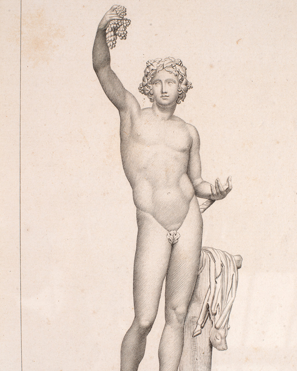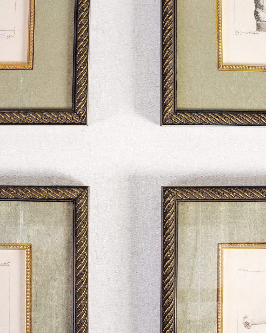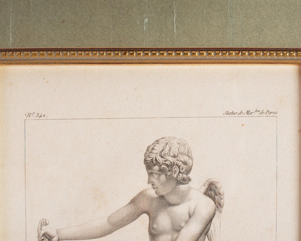 Marvelous set of four 19th century neoclassical prints of Greco-Roman classical figures framed. Neoclassical academic style each mounted in gilt faux-rope frames with sage green linen mats and inner gilt border. Bacchus, nude male figure with grapes (Greek God of wine), fertility. Discobole, after the famous Discobolus. Jason, nude male Greek leader of the Argonauts. Cupidon, young cupid with bow (Roman God of love). Lovely aged patina on finish with desirable fading commensurate age and use. Sold as a set of four. From an estate in San Francisco, CA.