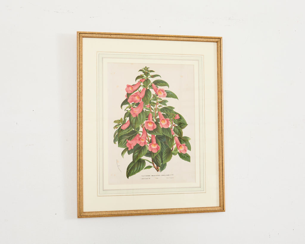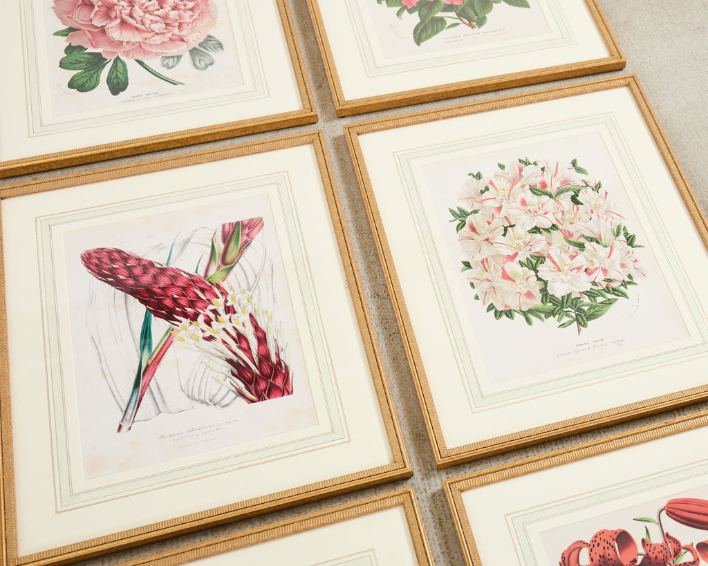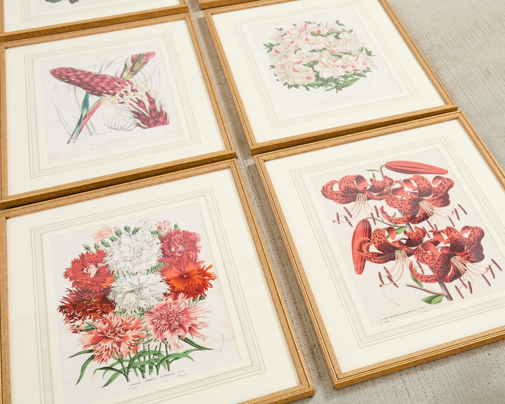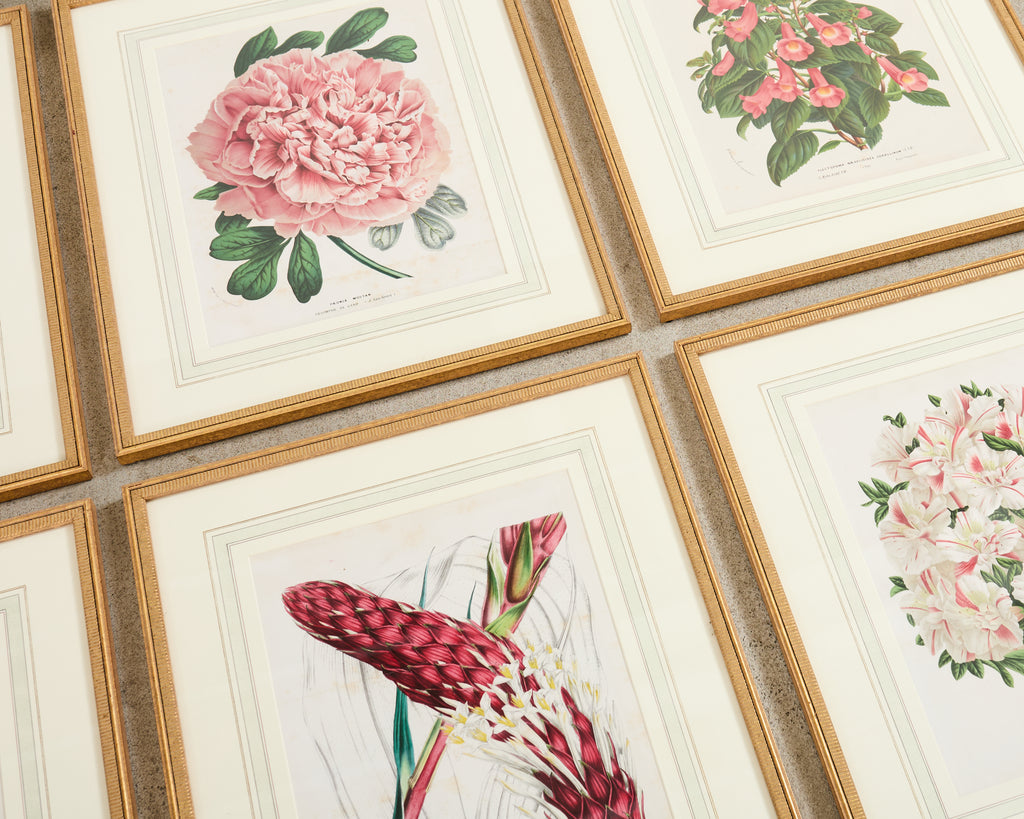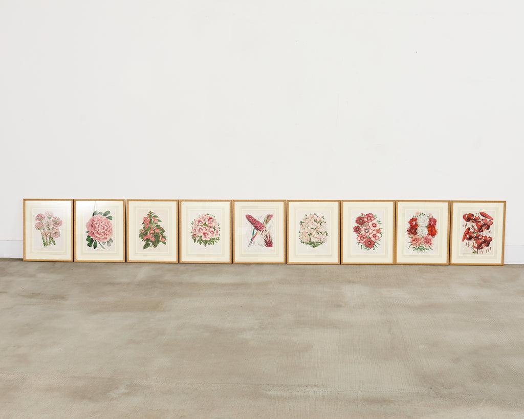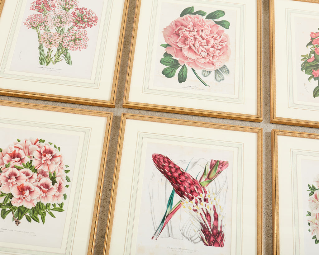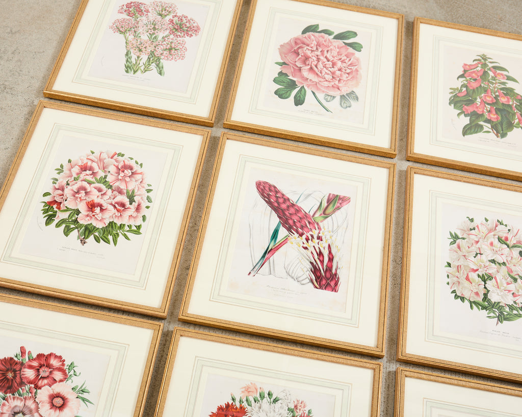 Amazing set of nine framed botanical hand-colored etching lithographs after 19th century horticulturist Louis Van Houtte (Belgian 1810-1876) who was with the Jardin Botanique de Brussels between 1836 and 1838. The prints depict various examples of peonies, lilies, orchids, and more with a whimsical pink and red theme. Each print is matted with a light pale green border and set in a gilt wood frame having an intentionally aged patina on the finish. The prints display fine detailing and vibrant color. Sold as a grand set of nine framed works. From an estate in the Napa Valley, California. The prints provide a strong, colorful focal point on a large scale.