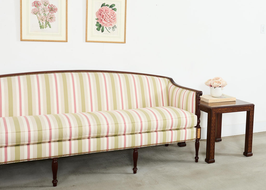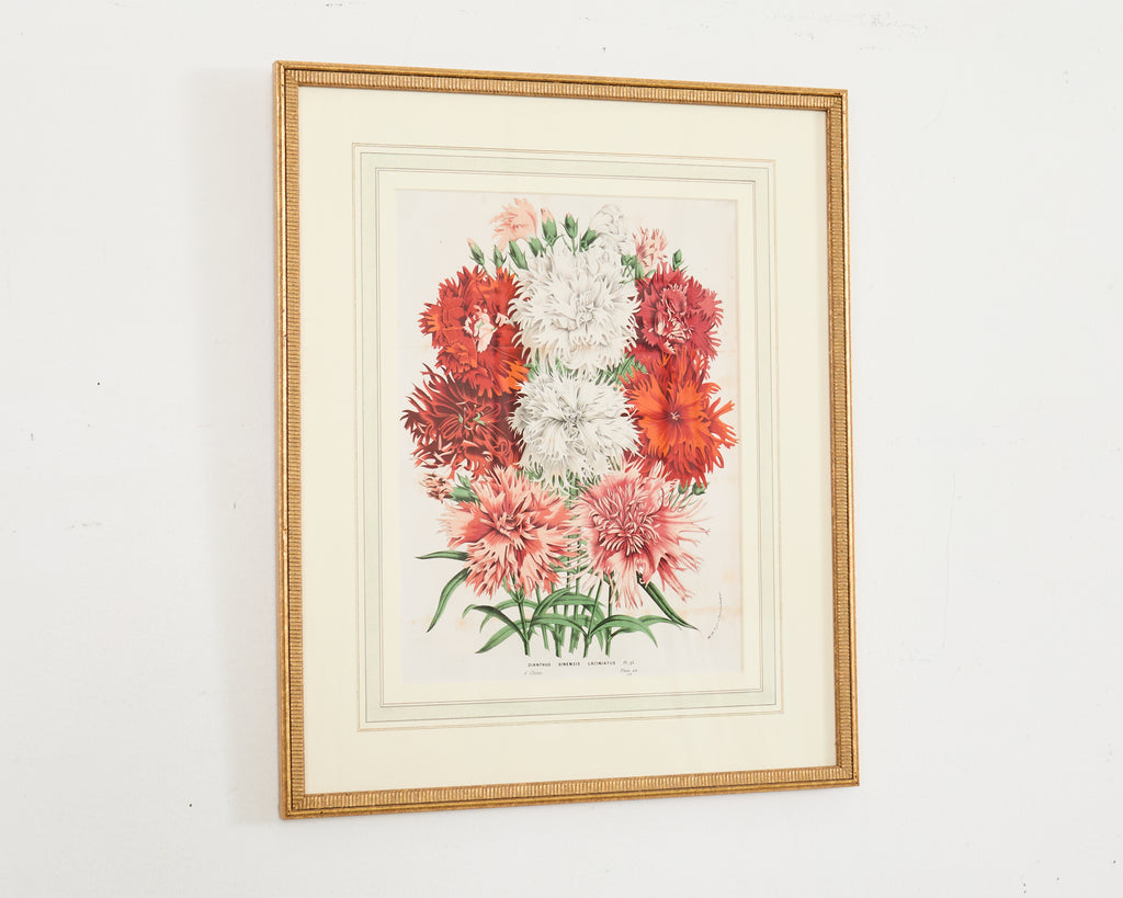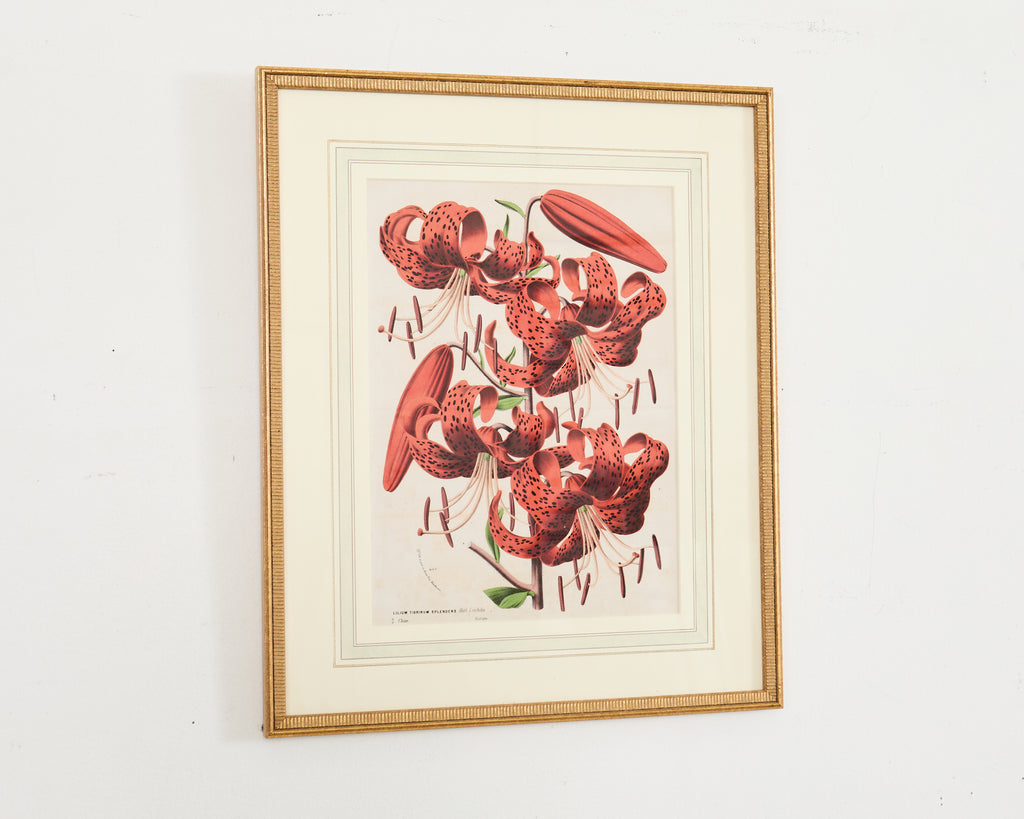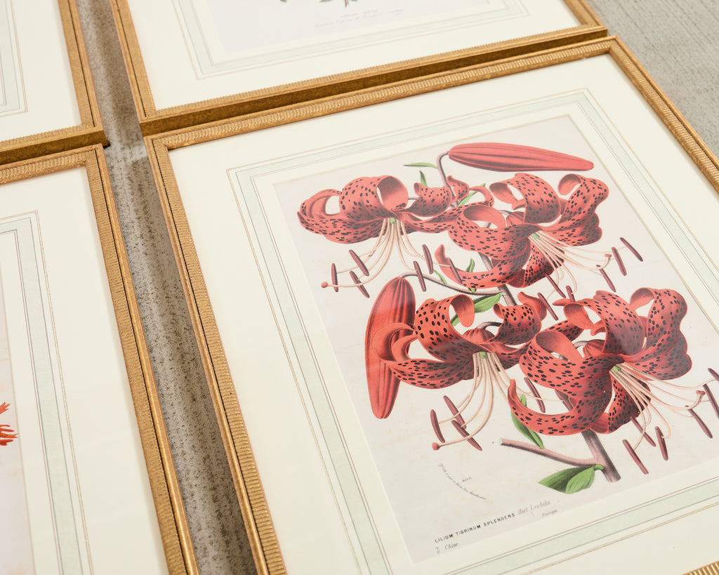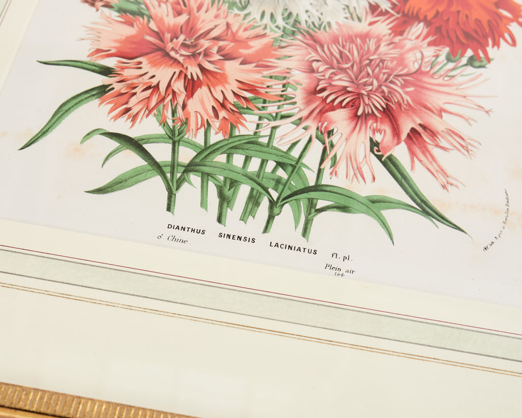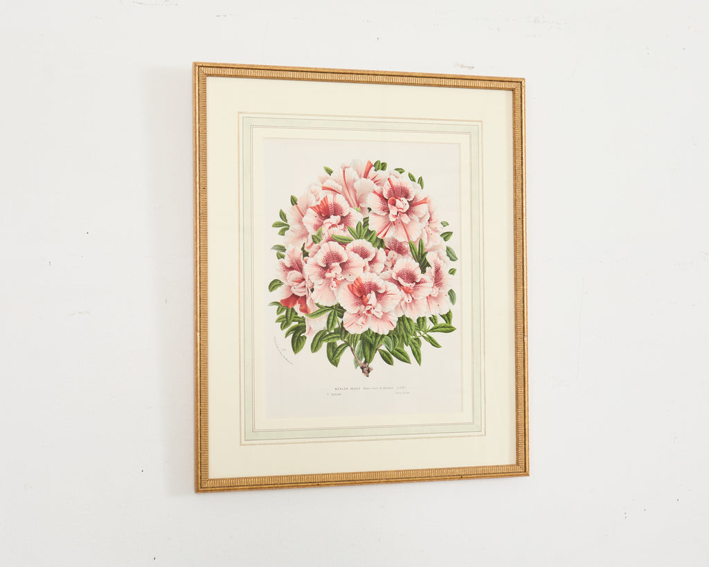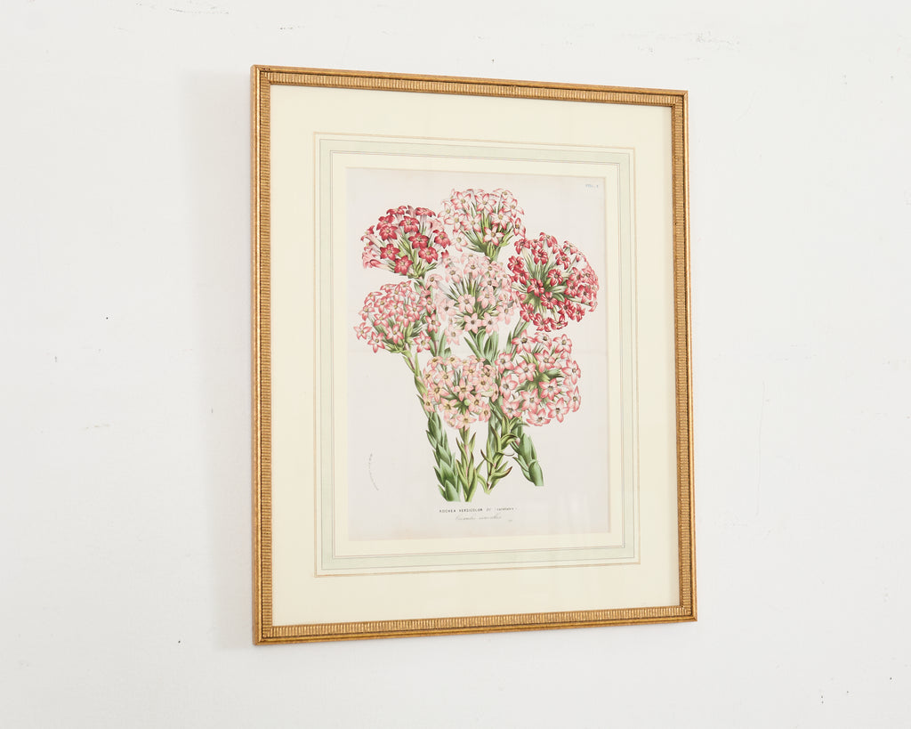 Amazing set of nine framed botanical hand-colored etching lithographs after 19th century horticulturist Louis Van Houtte (Belgian 1810-1876) who was with the Jardin Botanique de Brussels between 1836 and 1838. The prints depict various examples of peonies, lilies, orchids, and more with a whimsical pink and red theme. Each print is matted with a light pale green border and set in a gilt wood frame having an intentionally aged patina on the finish. The prints display fine detailing and vibrant color. Sold as a grand set of nine framed works. From an estate in the Napa Valley, California. The prints provide a strong, colorful focal point on a large scale.