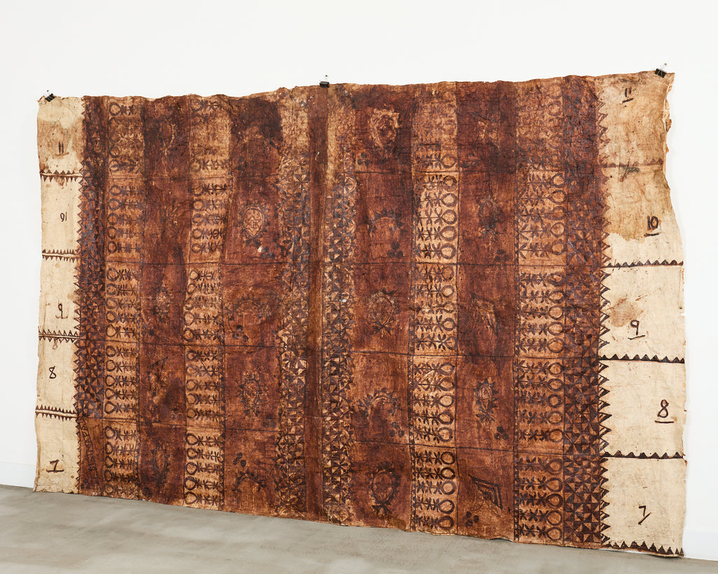 Large tribal style Polynesian tapa or barkcloth from the South Pacific Island nation of Tonga. The cloth measures over 12 feet wide and over 8 feet high. Handcrafted from the bark of a mulberry tree. The cloth is decorated using wood blocks and painted designs. The numbers on the sides were used as markers of length. Large tapas like this one were exchanged at ceremonies and events like weddings. The cloth has an aged patina with minor losses to commensurate age and use. From an estate in San Francisco, California.