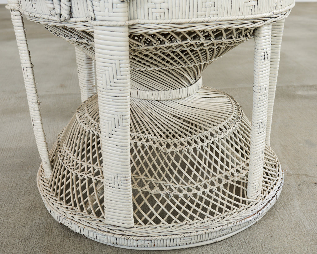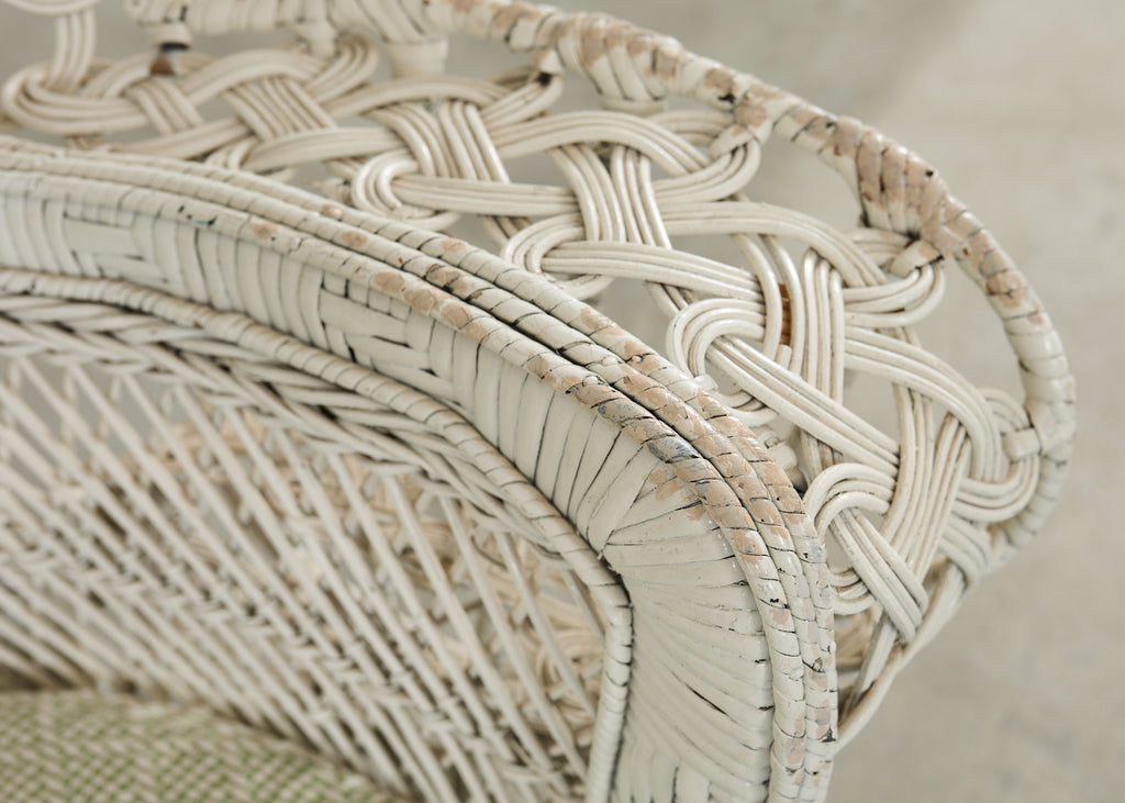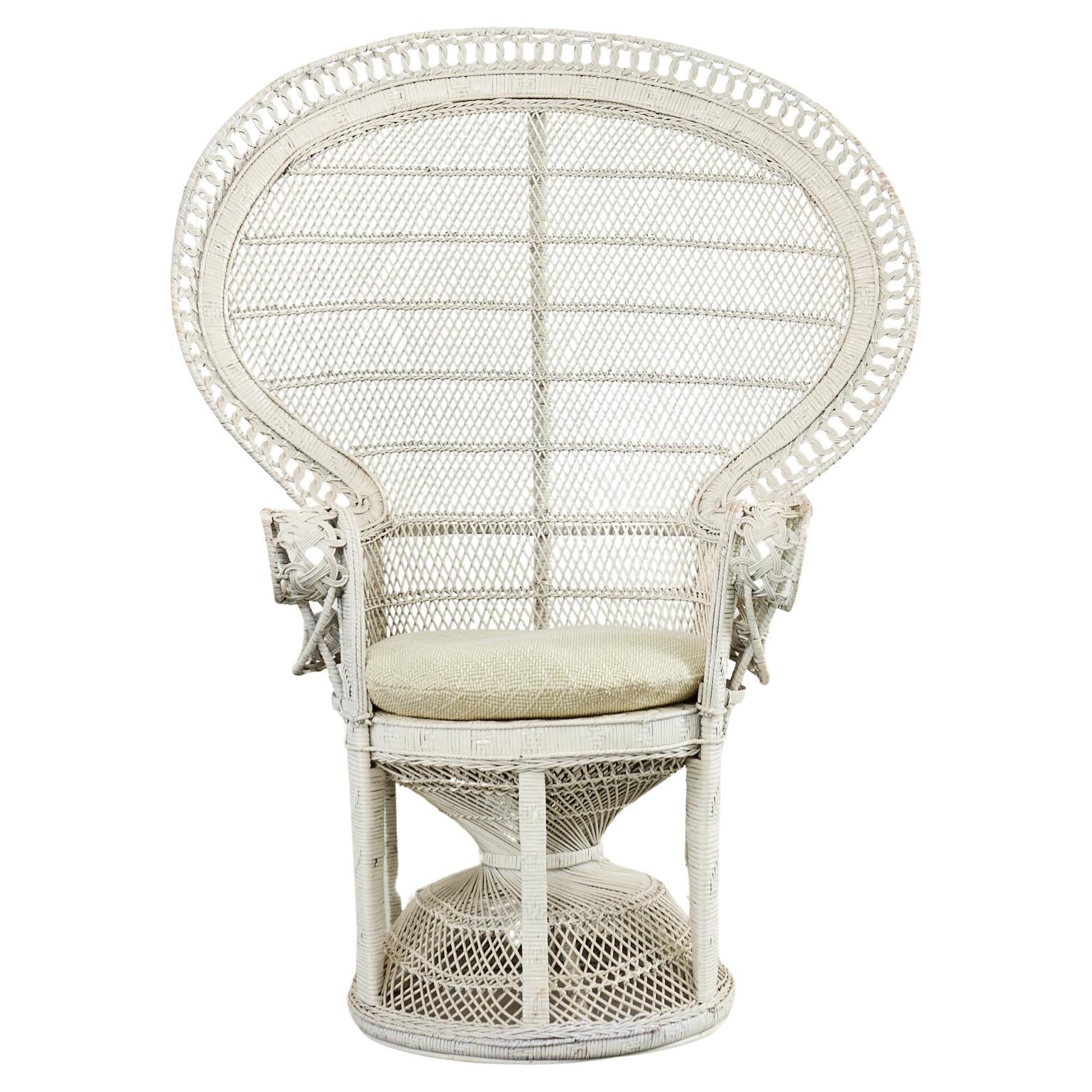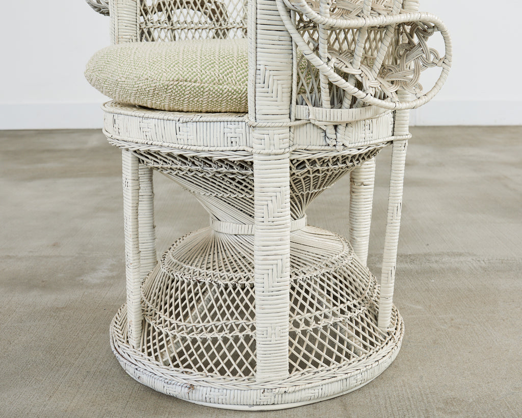 Iconic whitewashed wicker "emmanuelle" fan back wicker chair. This exceptionally designed handwoven chair is a modern re-interpretation of the traditional peacock chair. Designed in the height of the Hollywood Regency movement this chair invokes the spirit of past years glamour, particularly so in this example with its distressed white finish. Includes a newly upholstered cushion in Scalamandre green and off-white textured fabric.