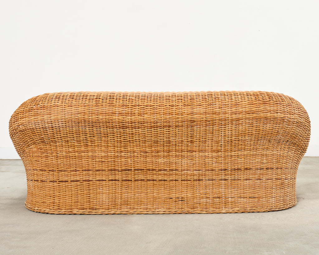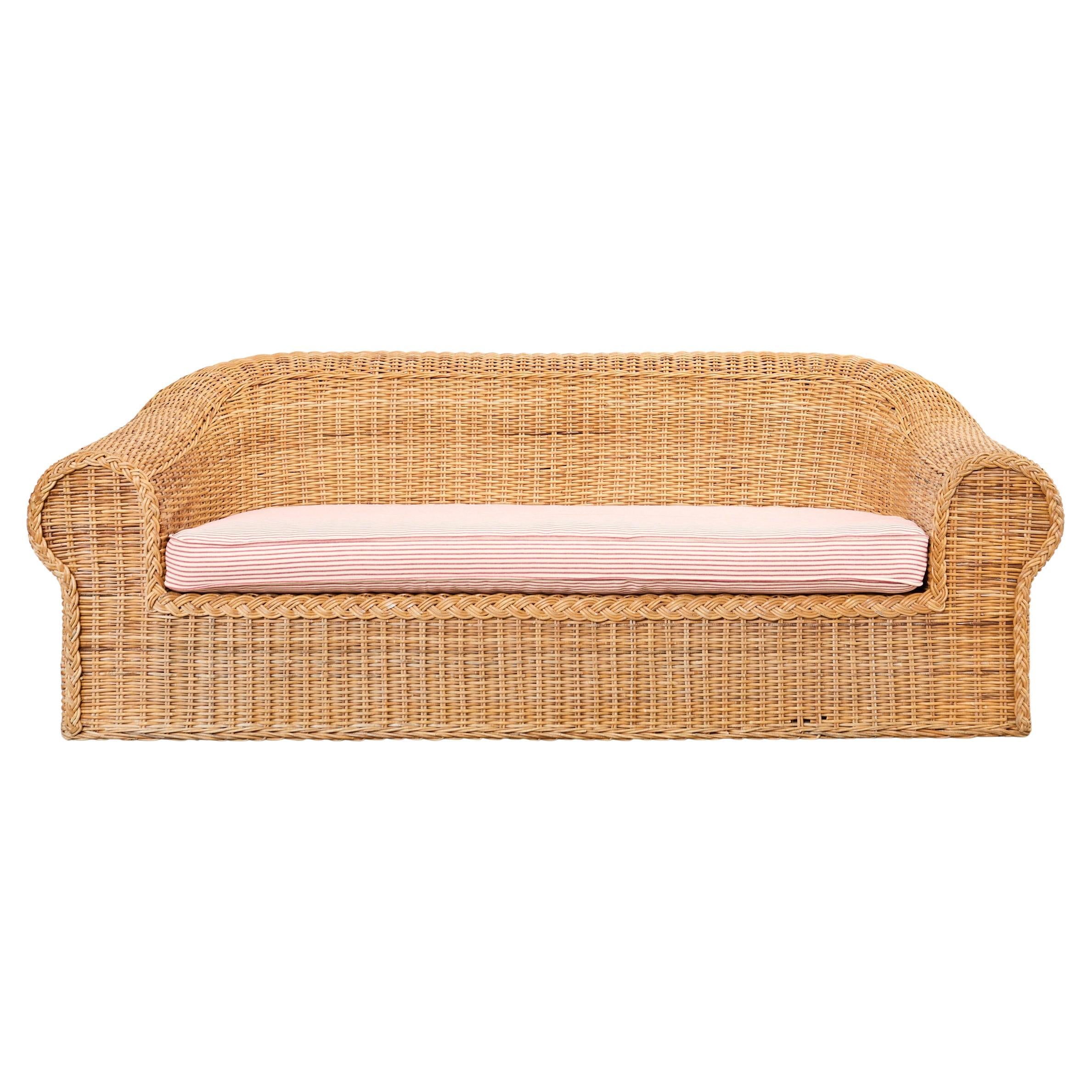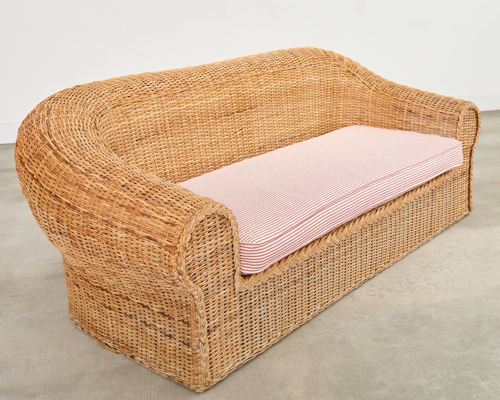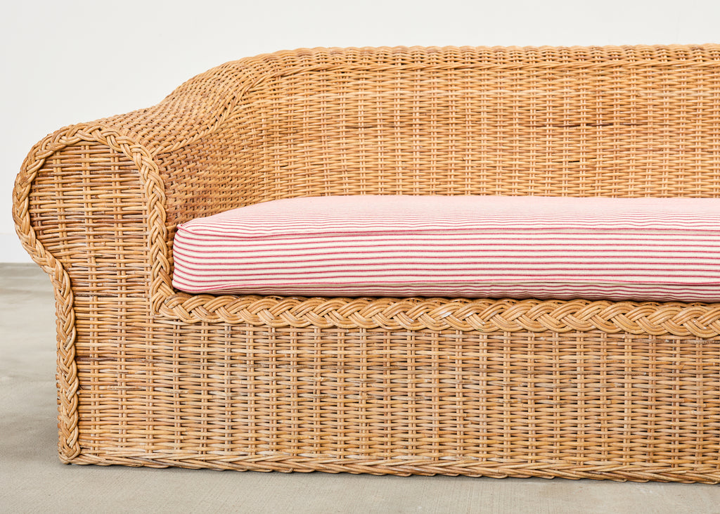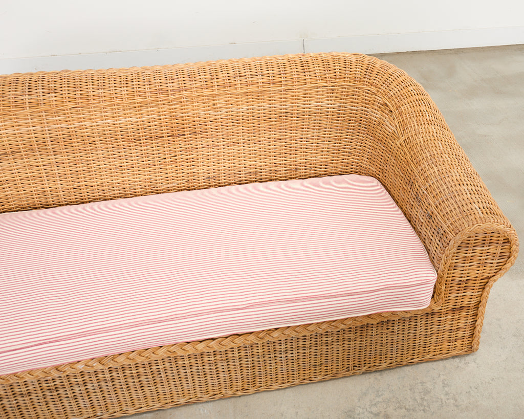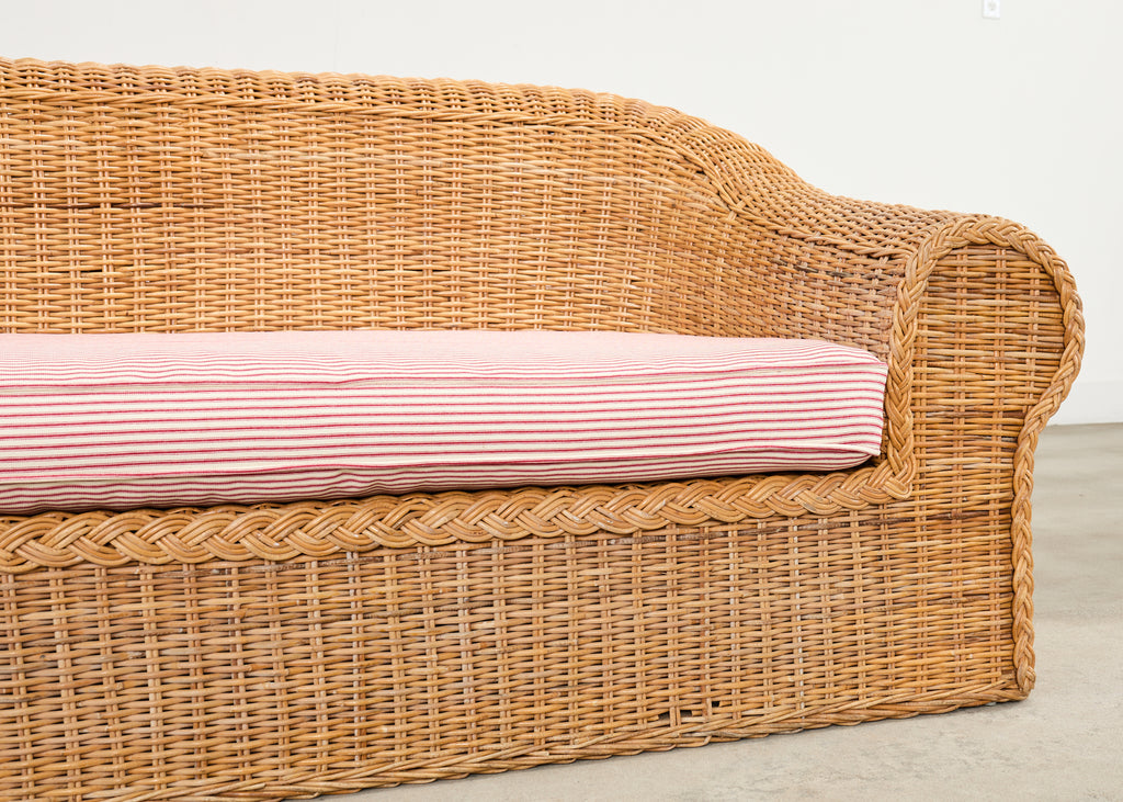 Grand organic modern sofa crafted from a pole rattan frame and covered with woven wicker. Inspired by the organic modern design of the "Jennifer" sofa by Michael Taylor. Retailed by Wicker Works in the California coastal style featuring a bulbous, rounded form having a gracefully curved back. The generous seat has a newly upholstered cushion with a whimsical French fabric in a ticking stripe pattern. The sofa is sturdy and comfortable with excellent joinery and construction. The wicker has a desirable faded and aged patina with a light honey-toned finish. The front of the arms have a braided border. The sofa has a coastal charm and air of relaxed elegance on a grand scale. Arms measure 25 inches high. From an estate in Malibu.